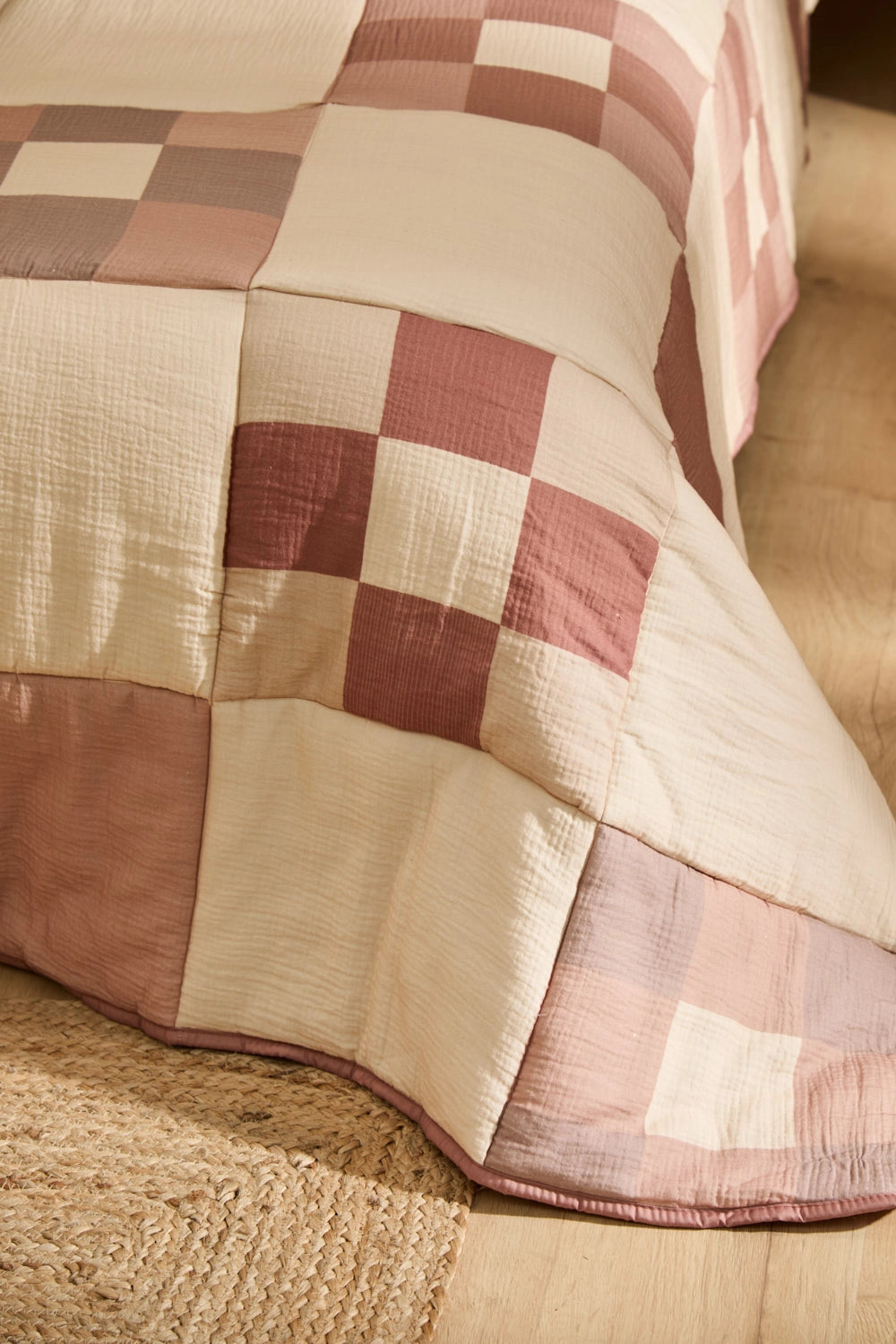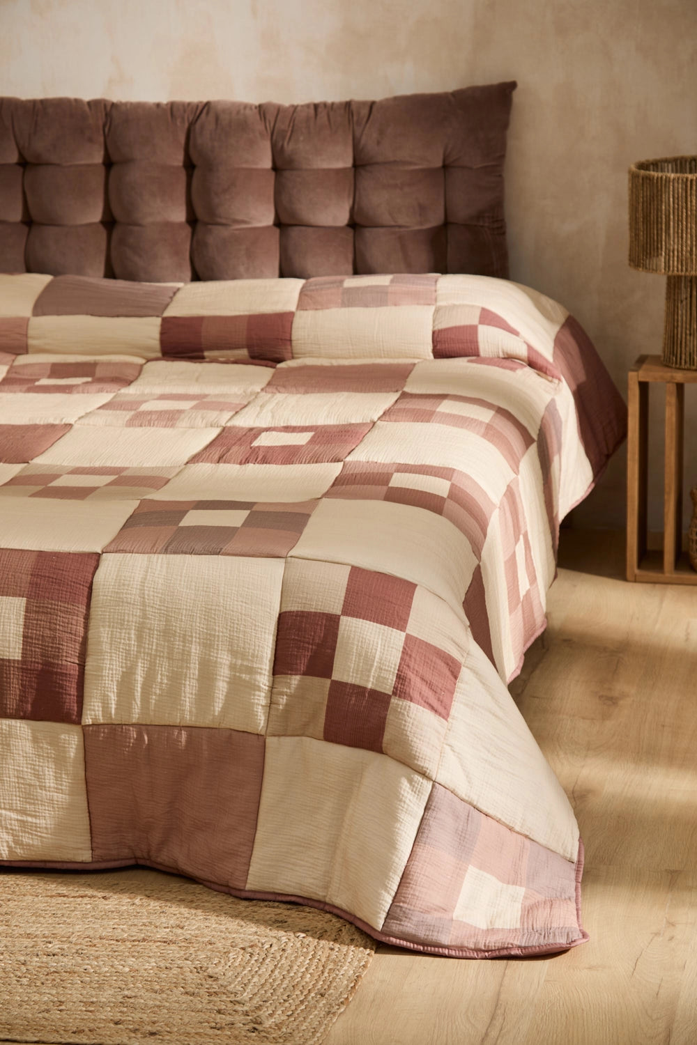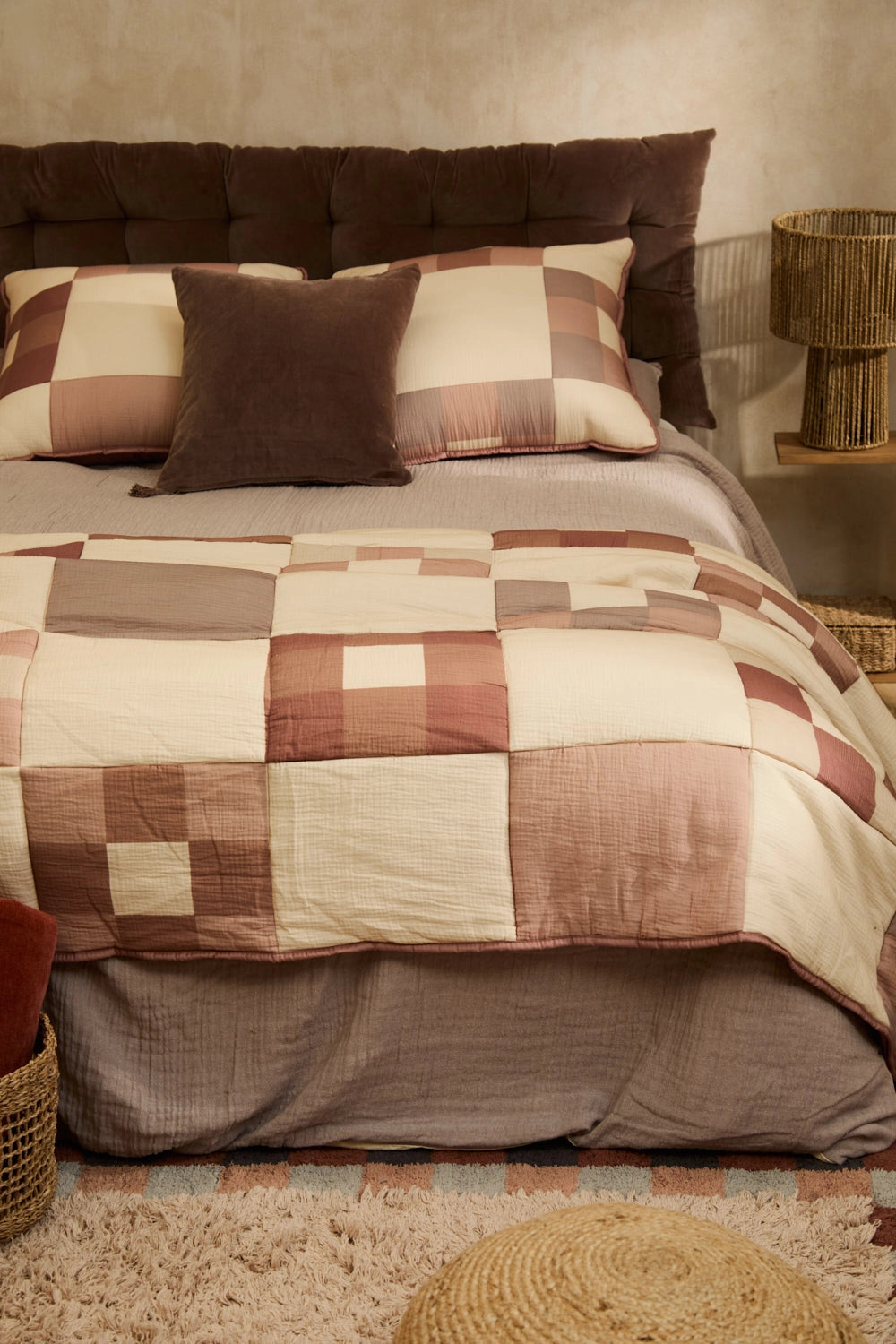 Couette matelassée effet patchwork au motif naturel. Finition passepoilée. Intérieur uni et uni.