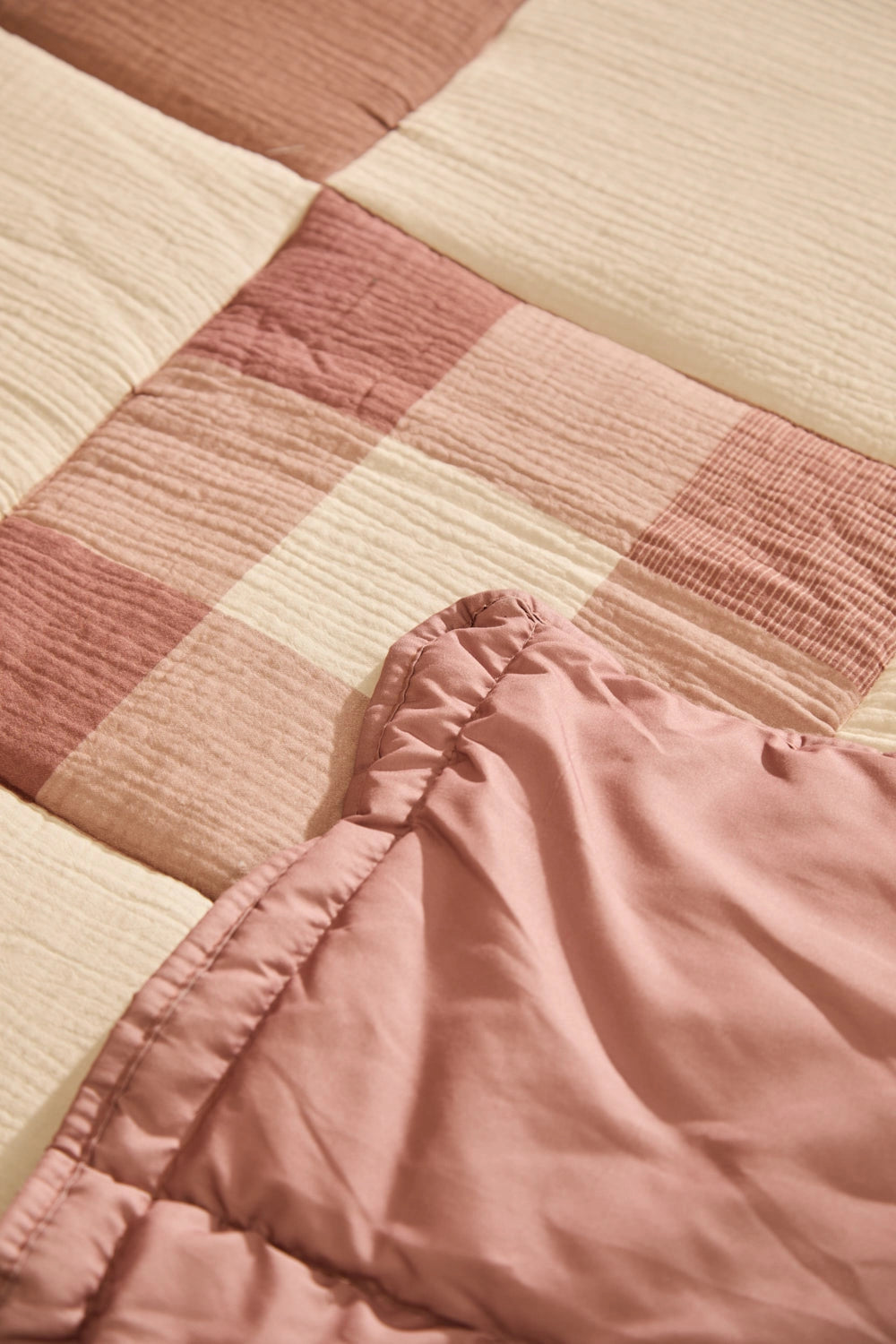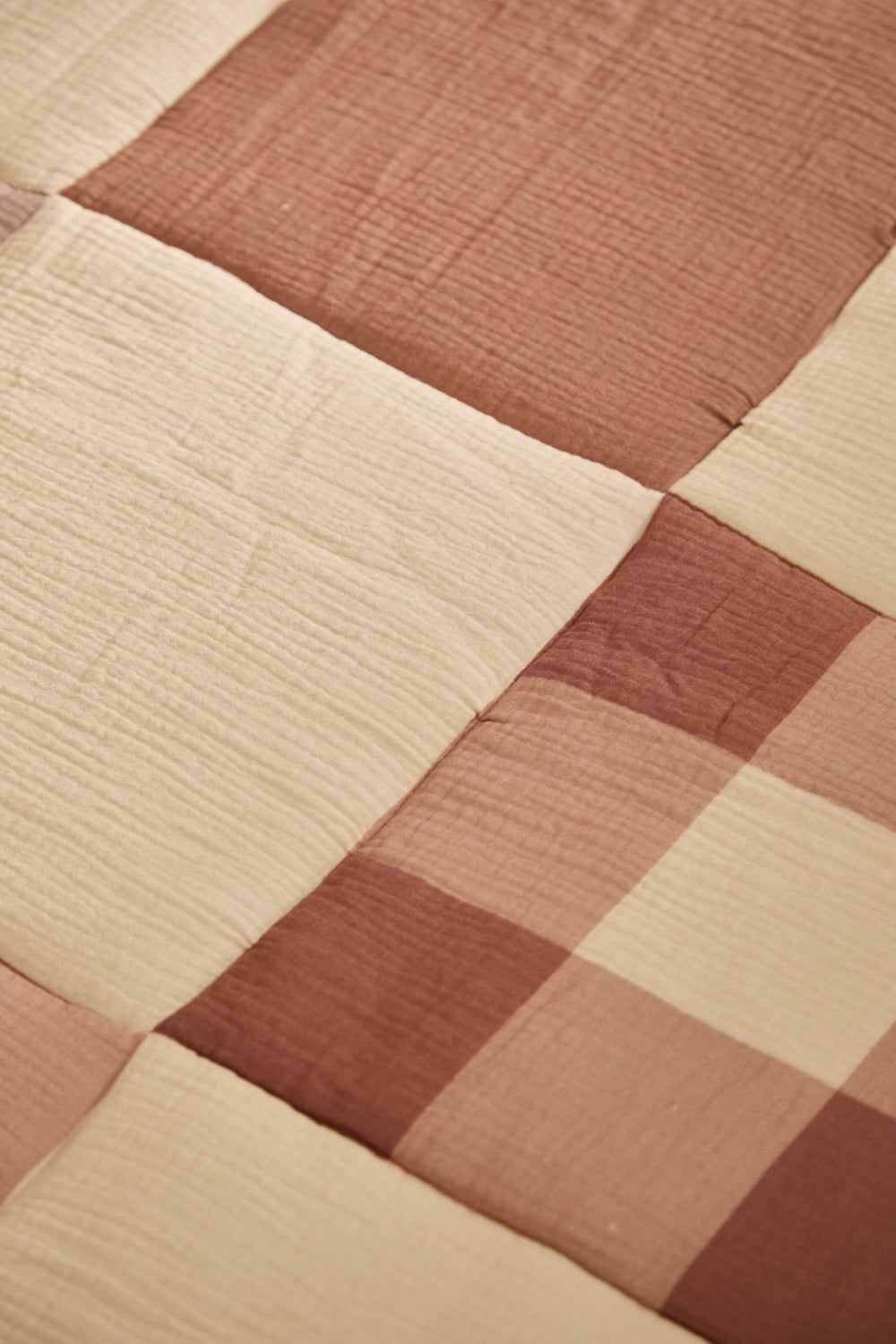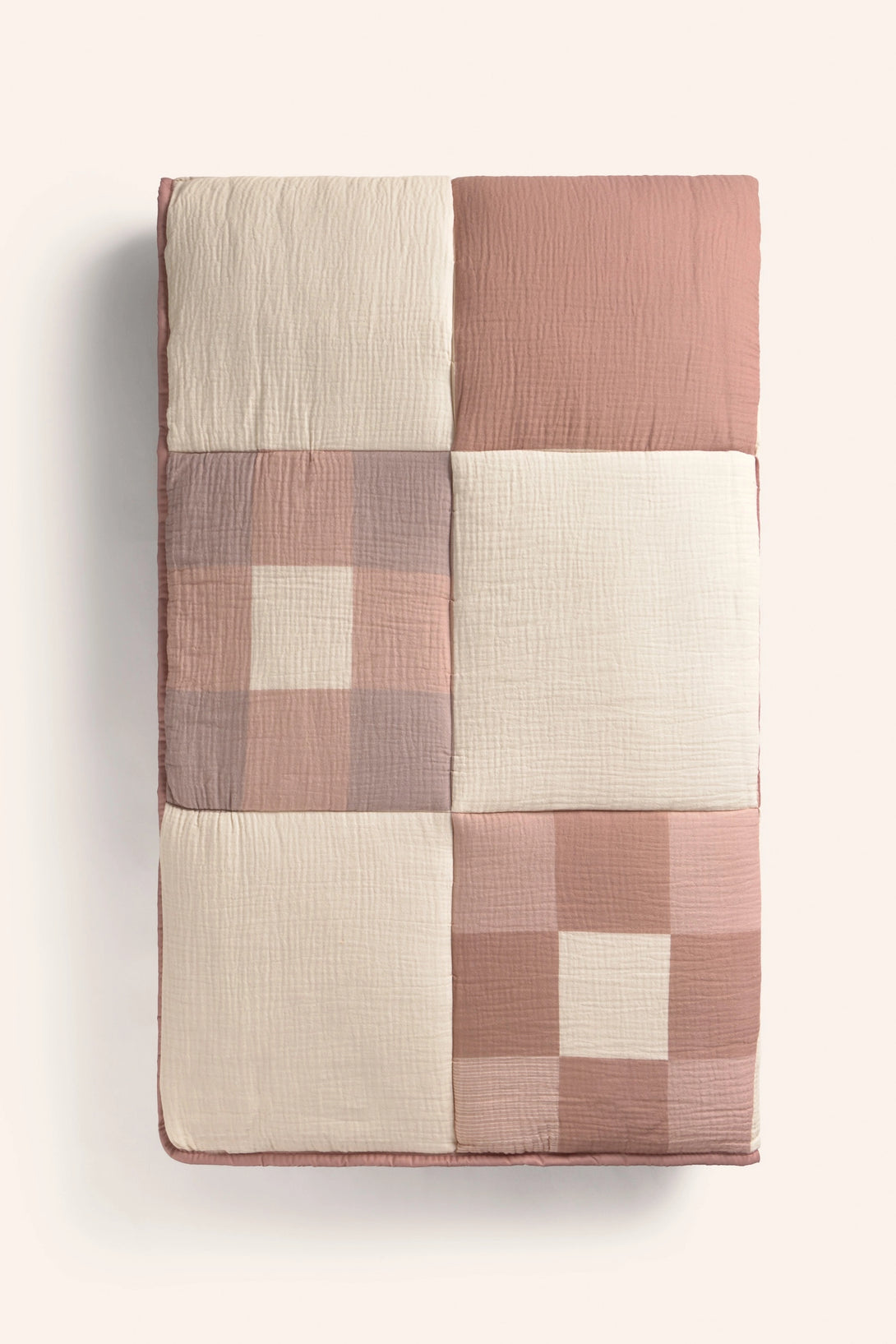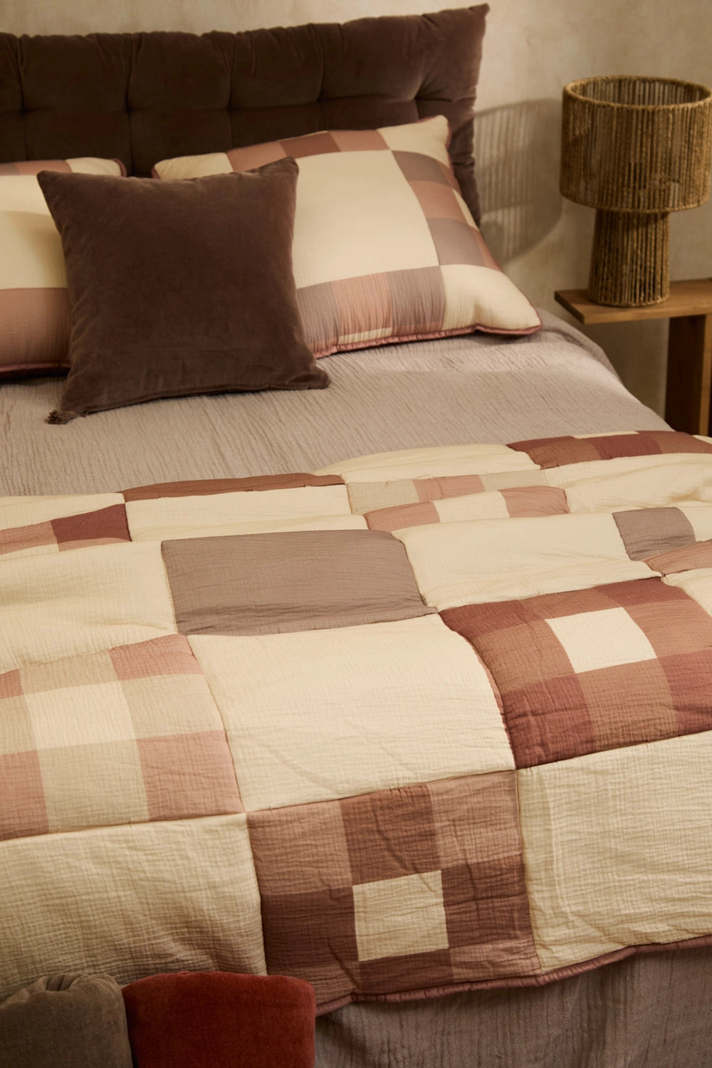 Couette matelassée effet patchwork au motif naturel. Finition passepoilée. Intérieur uni et uni.
