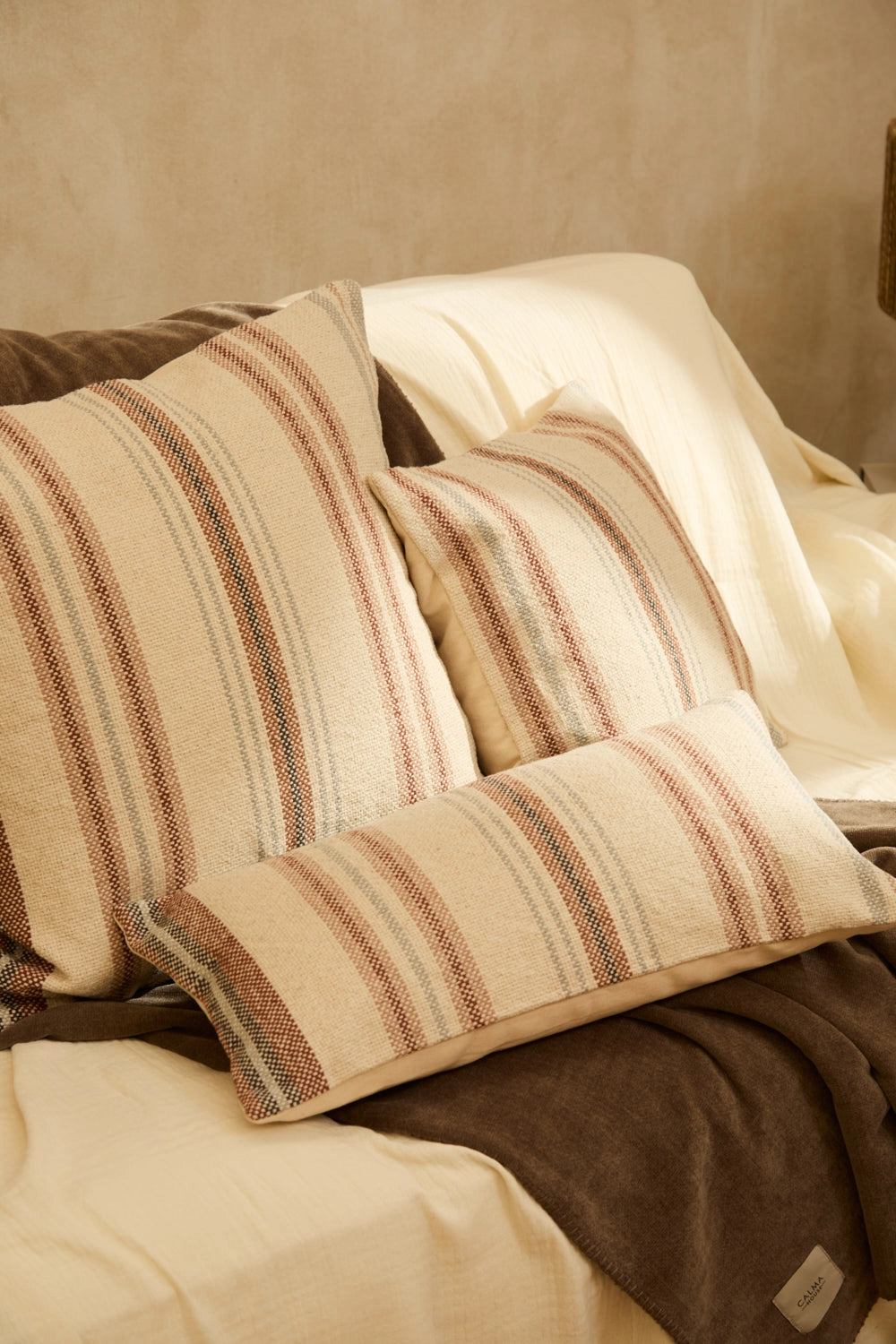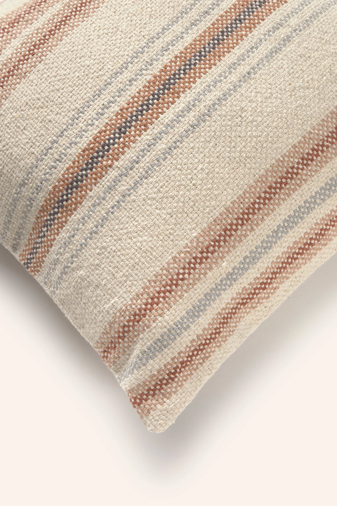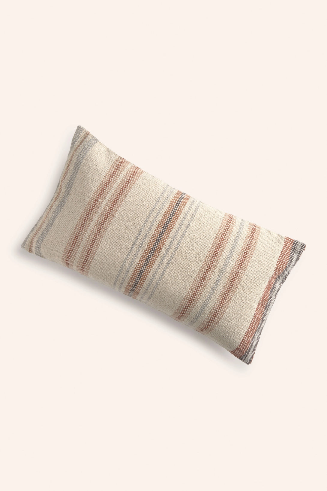 Housse de coussin rectangulaire en coton épais avec rayures tissées aux tons terre. Dos en toile unie avec fermeture éclair dissimulée à mi-hauteur et rabat. Chaque coussin peut présenter de légères variations de couleur dues au procédé de teinture et à l'affichage à l'écran.