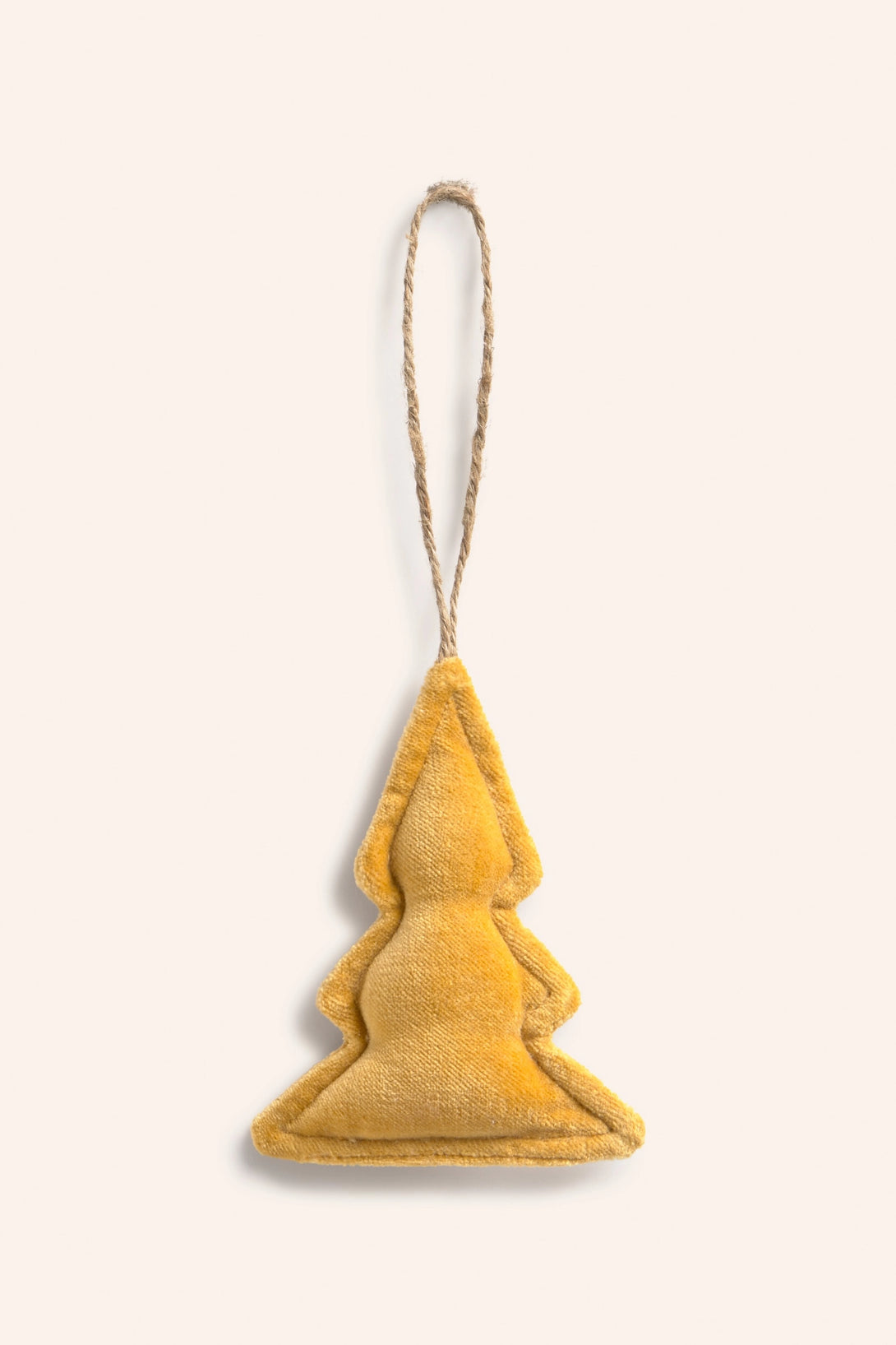 Décoration de Noël en velours de coton couleur moutarde en forme de sapin matelassé. Livrée avec une sangle de suspension.
