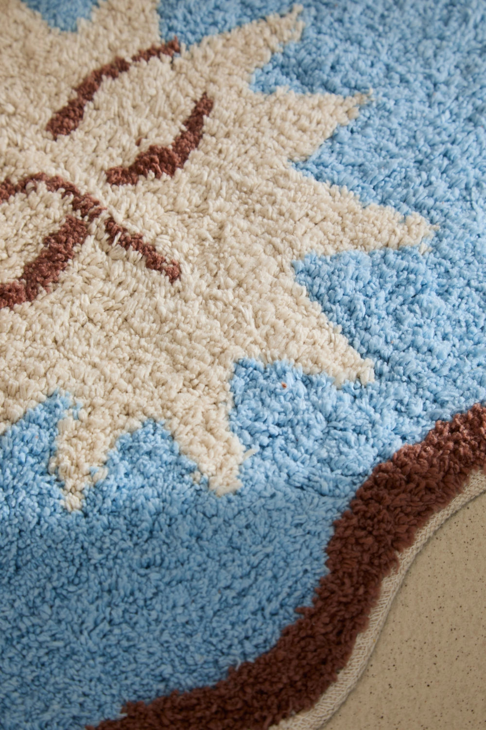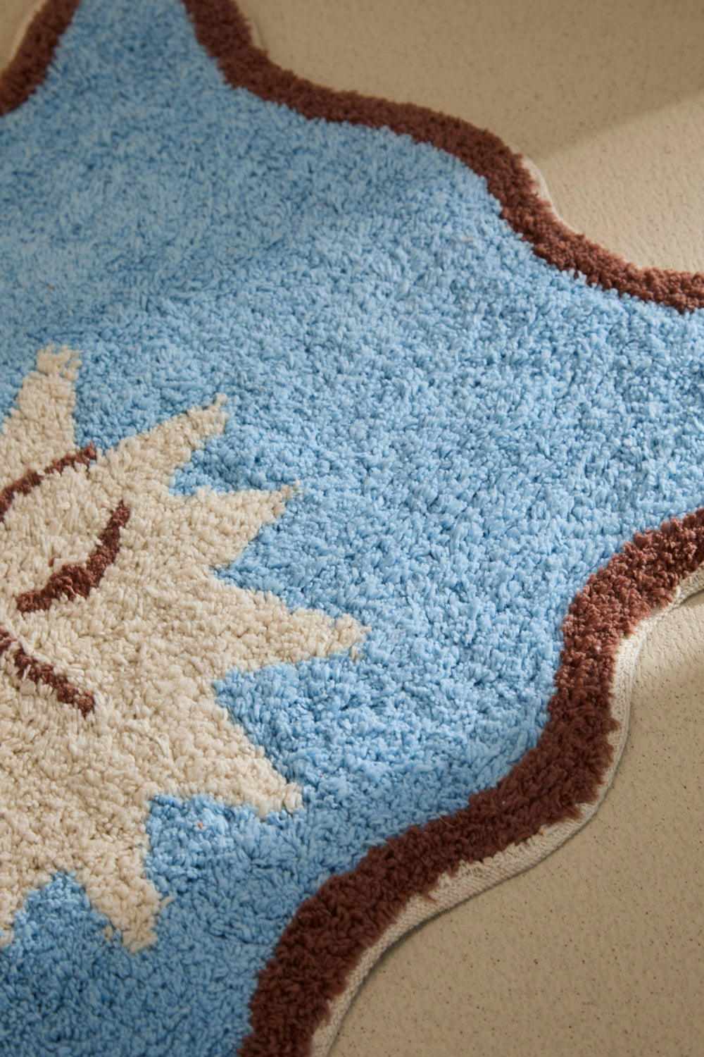 Tapis de bain en coton tufté avec un motif illustré représentant un soleil en écru sur fond bleu.