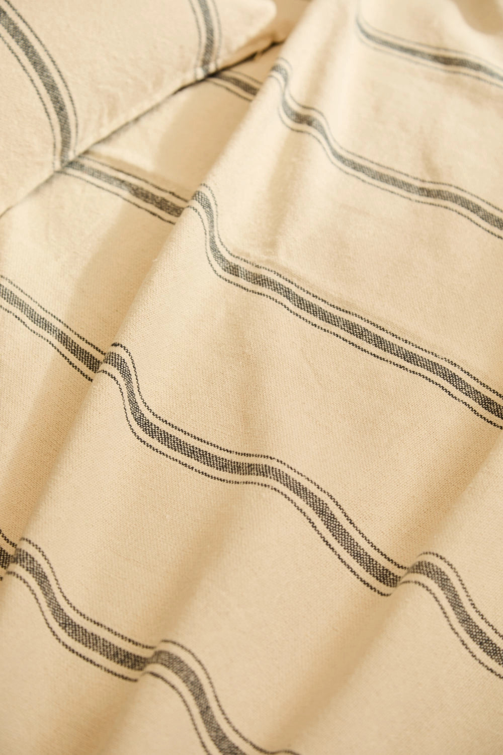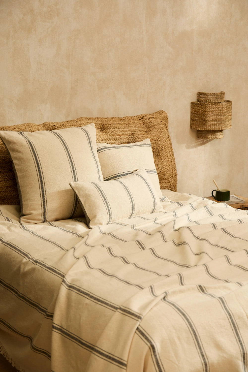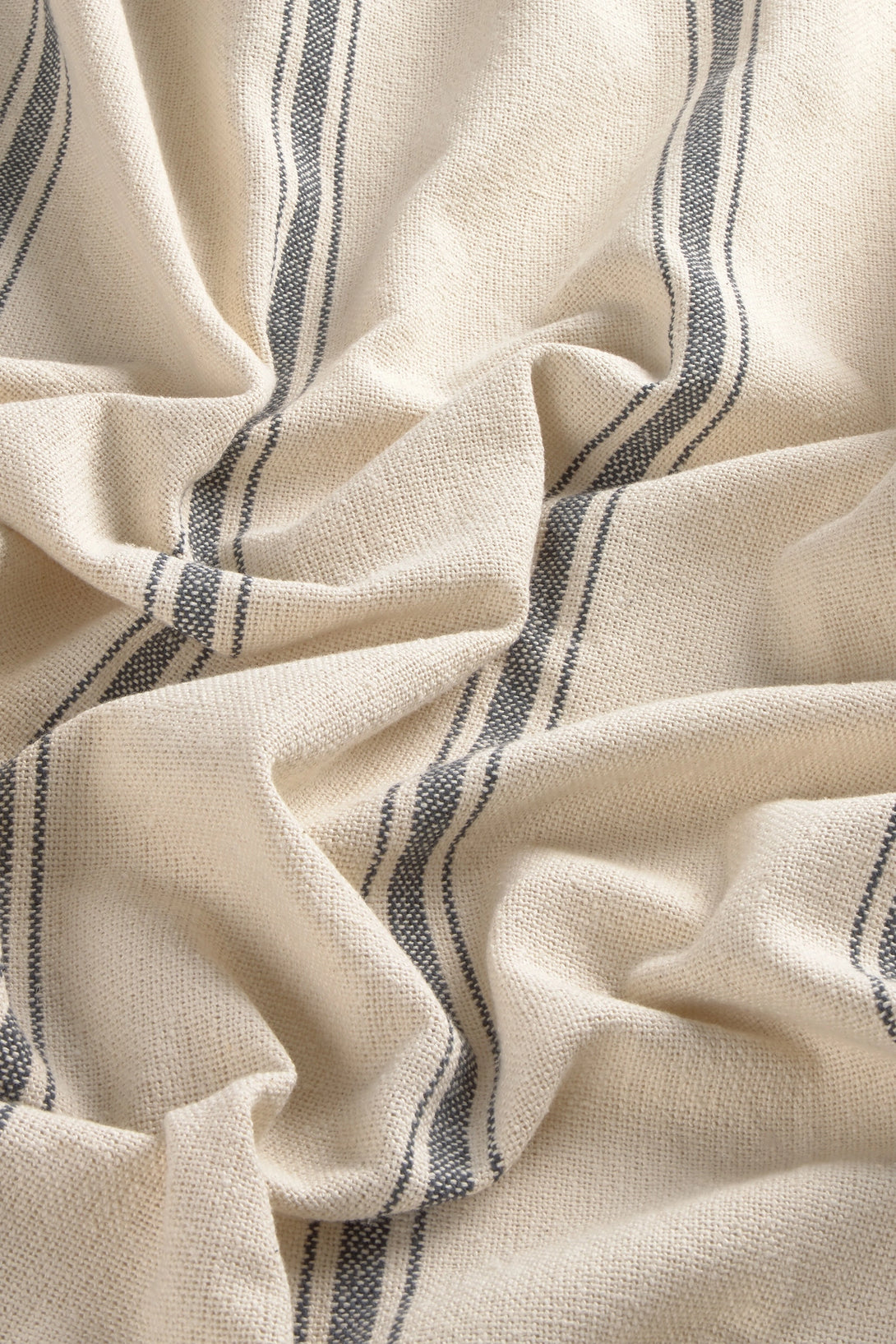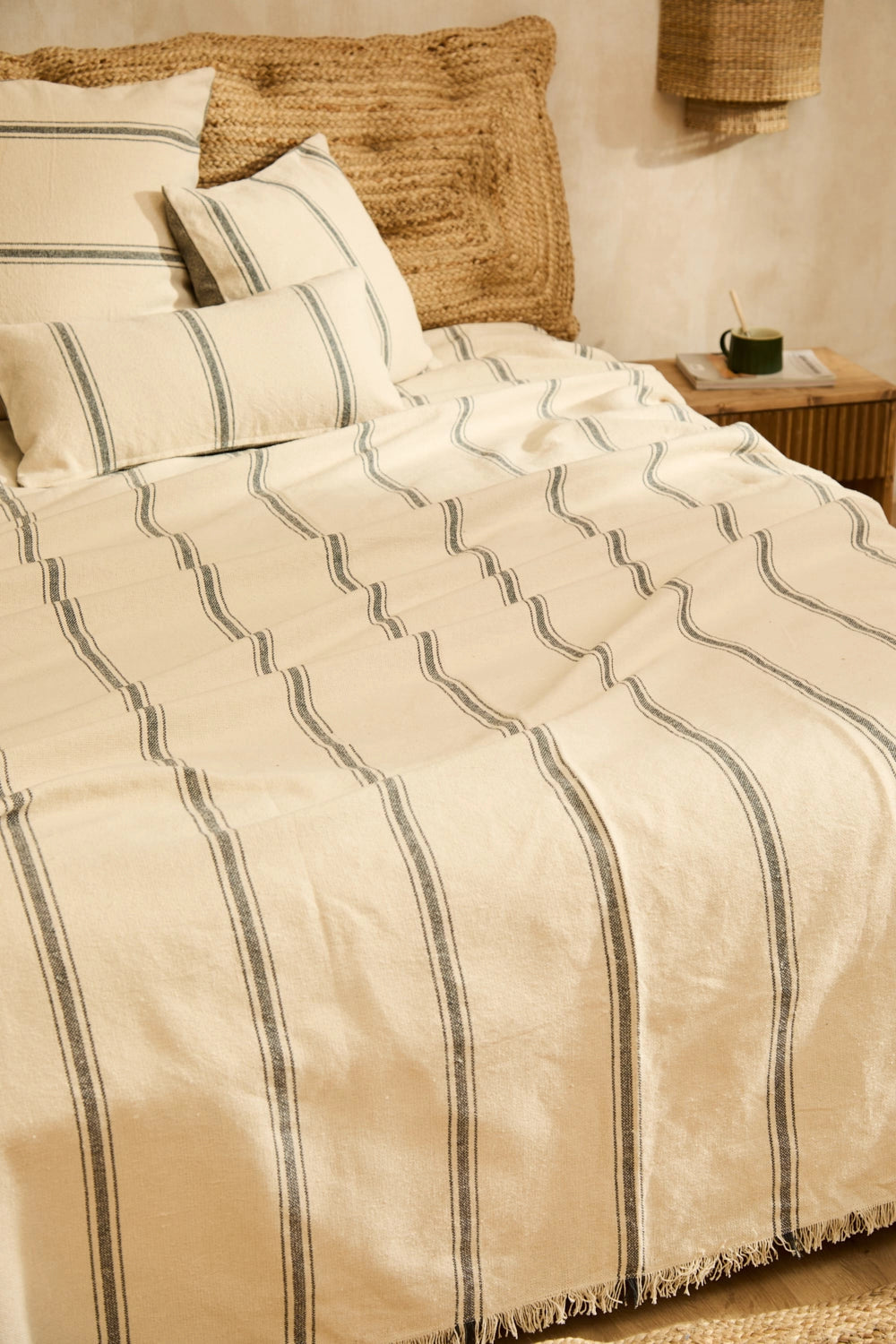 Couvre-lit en coton épais à rayures tissées gris foncé. Bordure à franges.