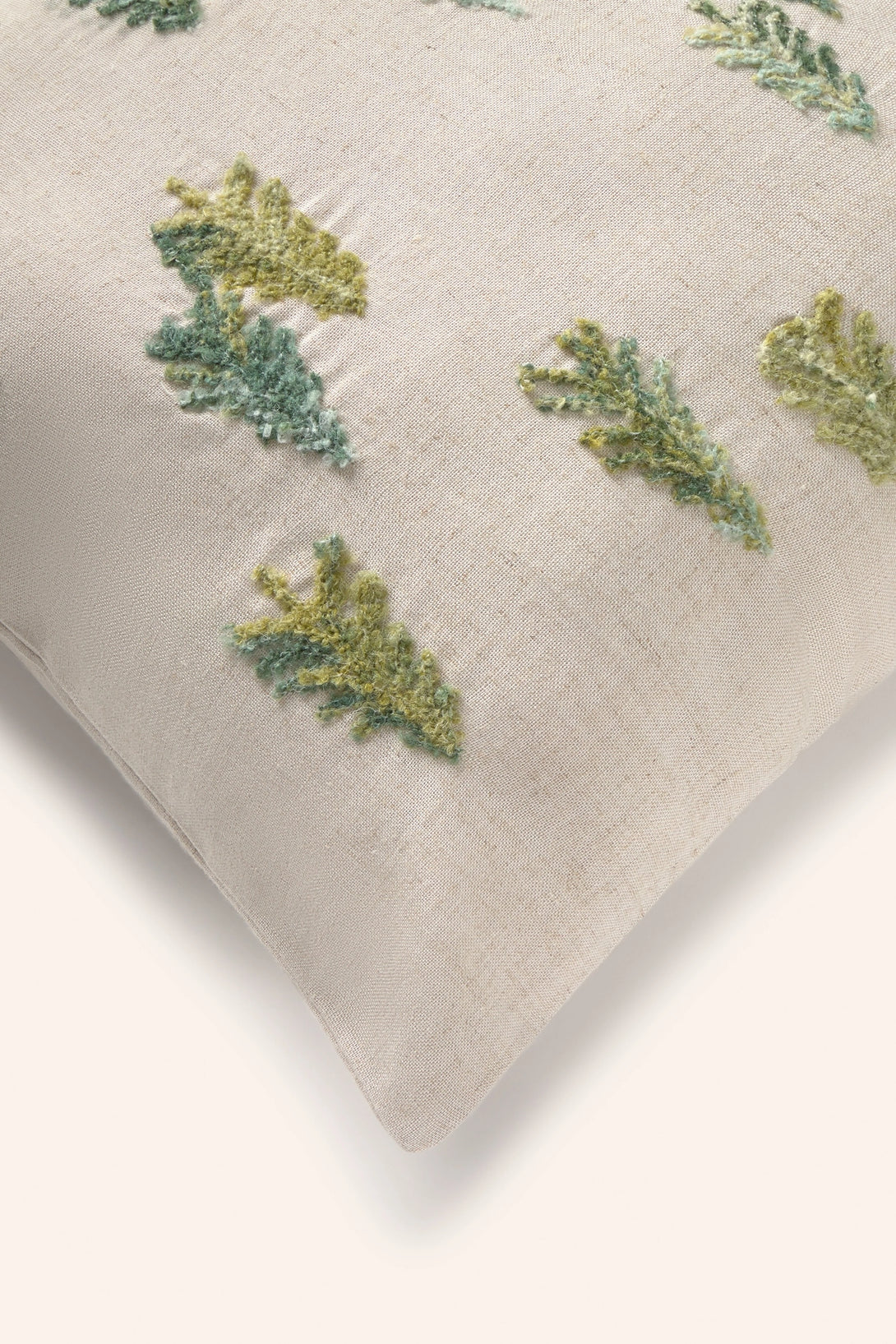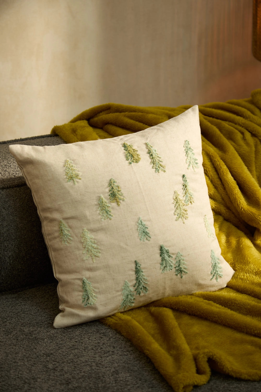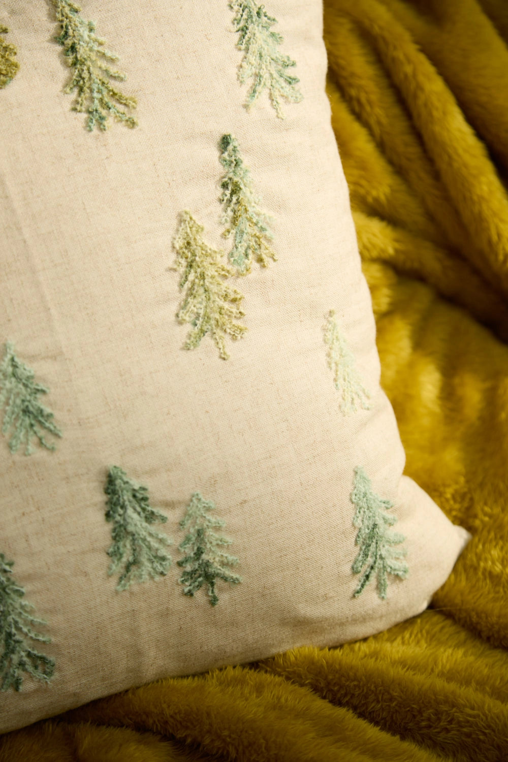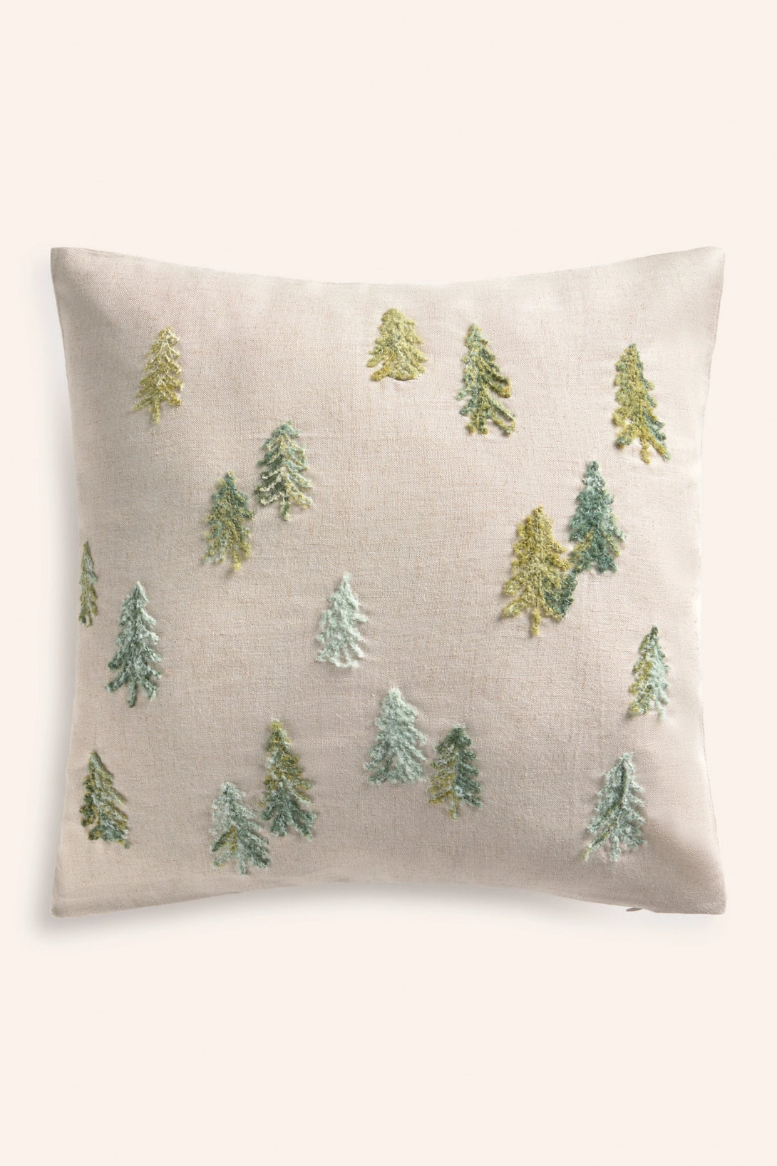 Housse de coussin en lin brodée de sapins. Dos uni. Fermeture éclair dissimulée en bas. Chaque coussin peut présenter de légères variations de couleur dues au procédé de teinture et à l'affichage à l'écran.