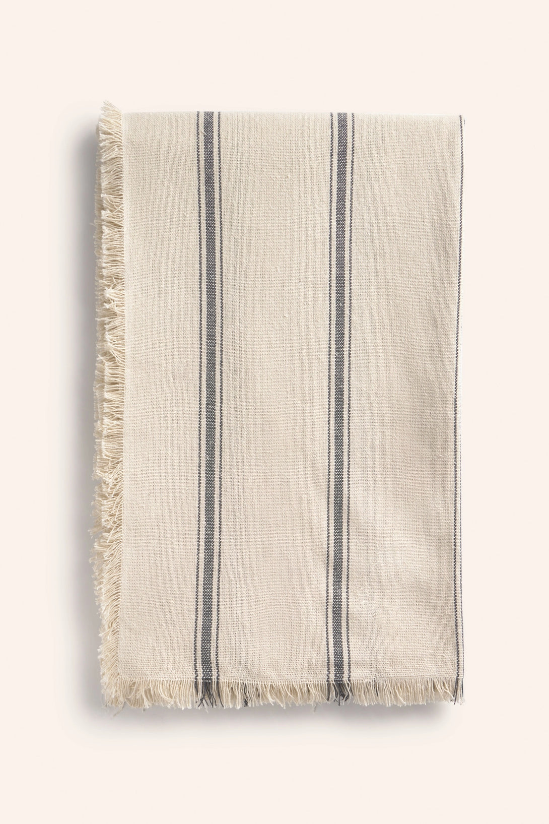 Couvre-lit en coton épais à rayures tissées gris foncé. Bordure à franges.