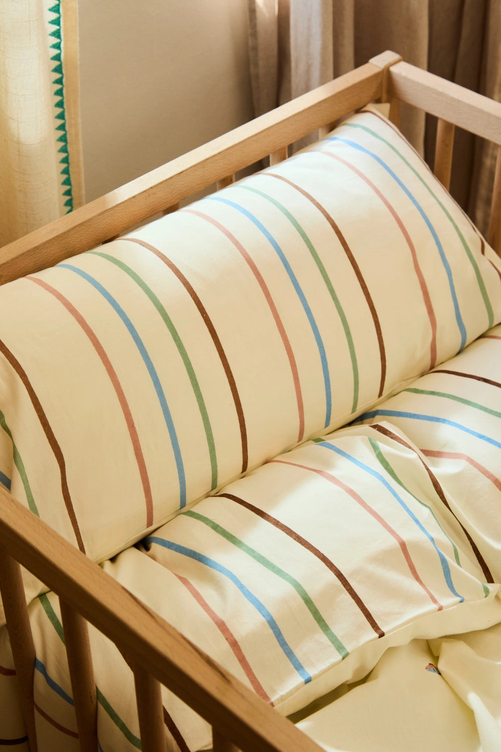 Parure housse de couette et taie d'oreiller pour berceau en coton à rayures multicolores. Fermeture à rabat.