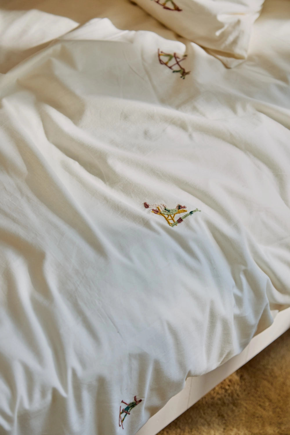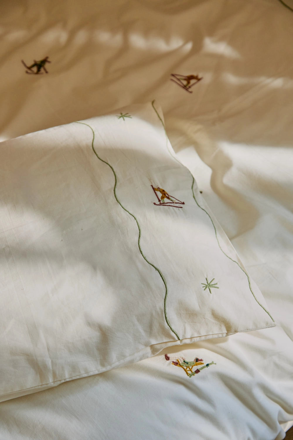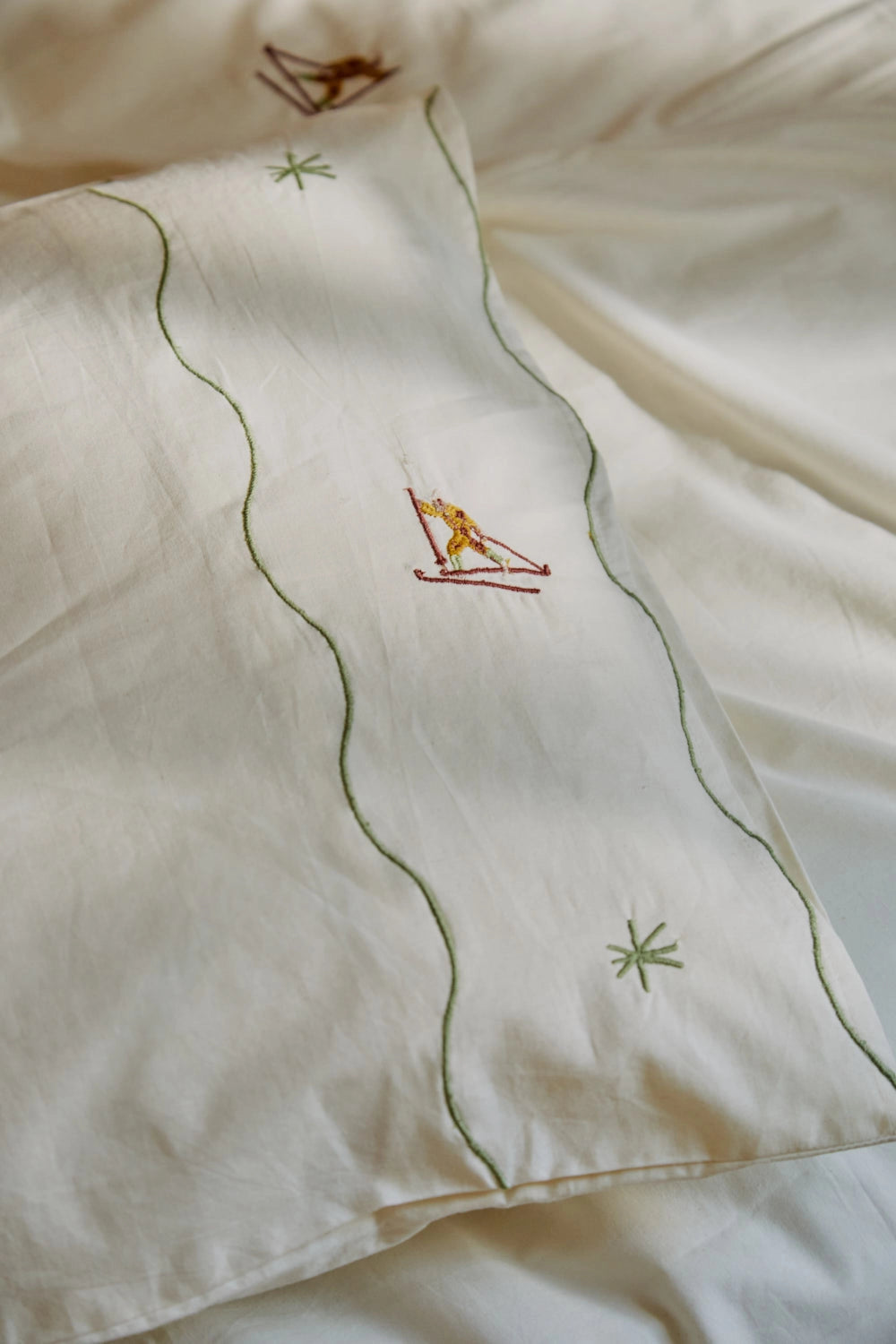 Parure housse de couette et taie d'oreiller en coton avec détails skieurs brodés. Fermeture à rabat. Dimensions : 150 x 260 cm, avec une taie d'oreiller de 45 x 100 cm.