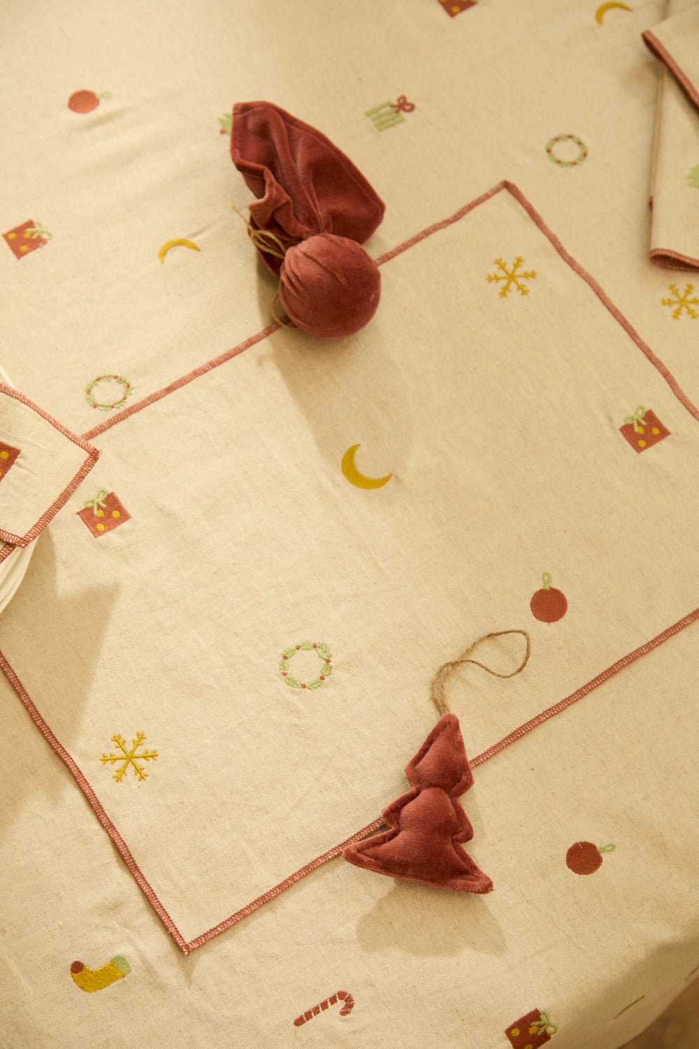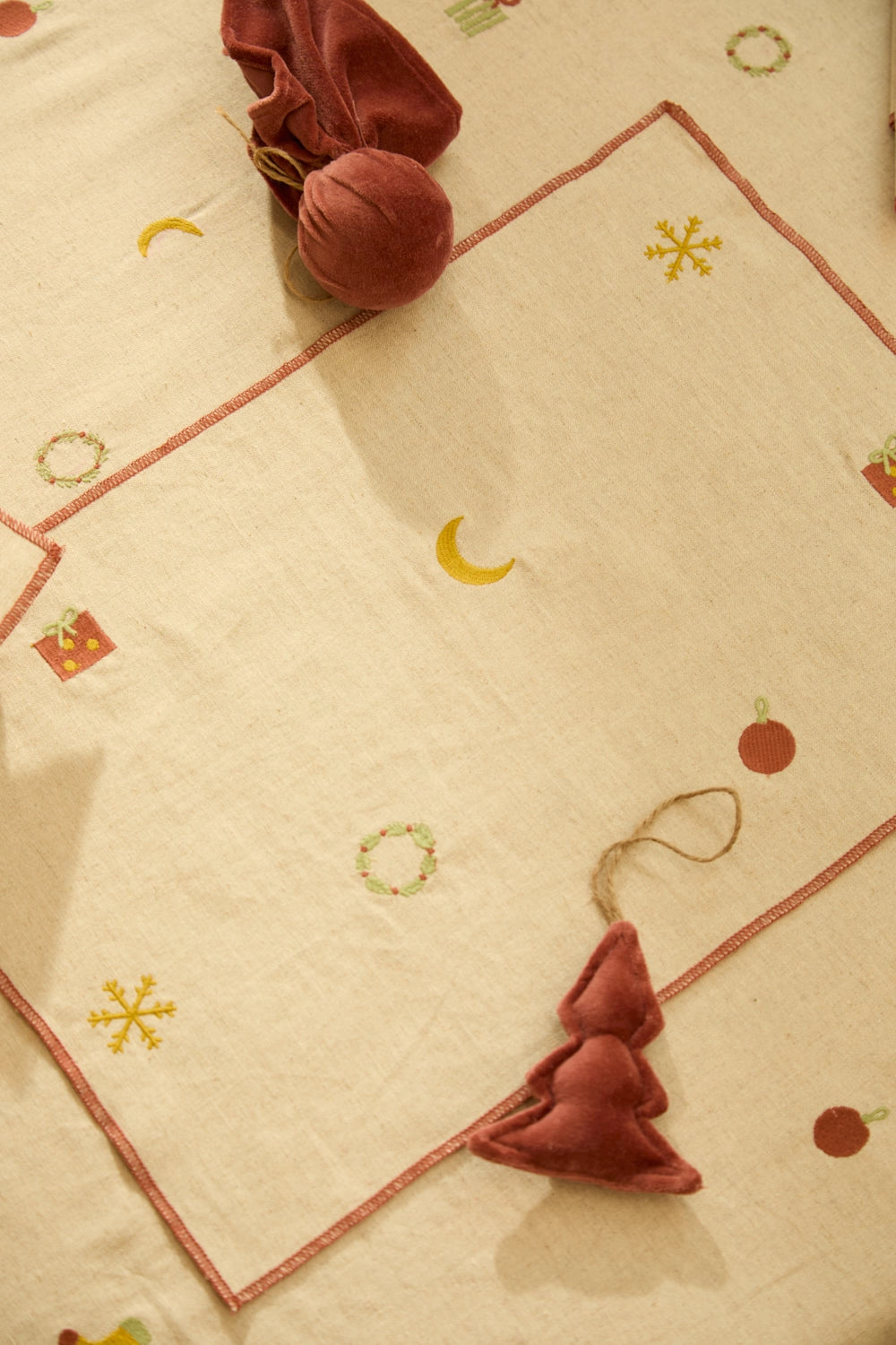 Set de table en lin brodé de motifs festifs et fini avec un point de surjet terreux.