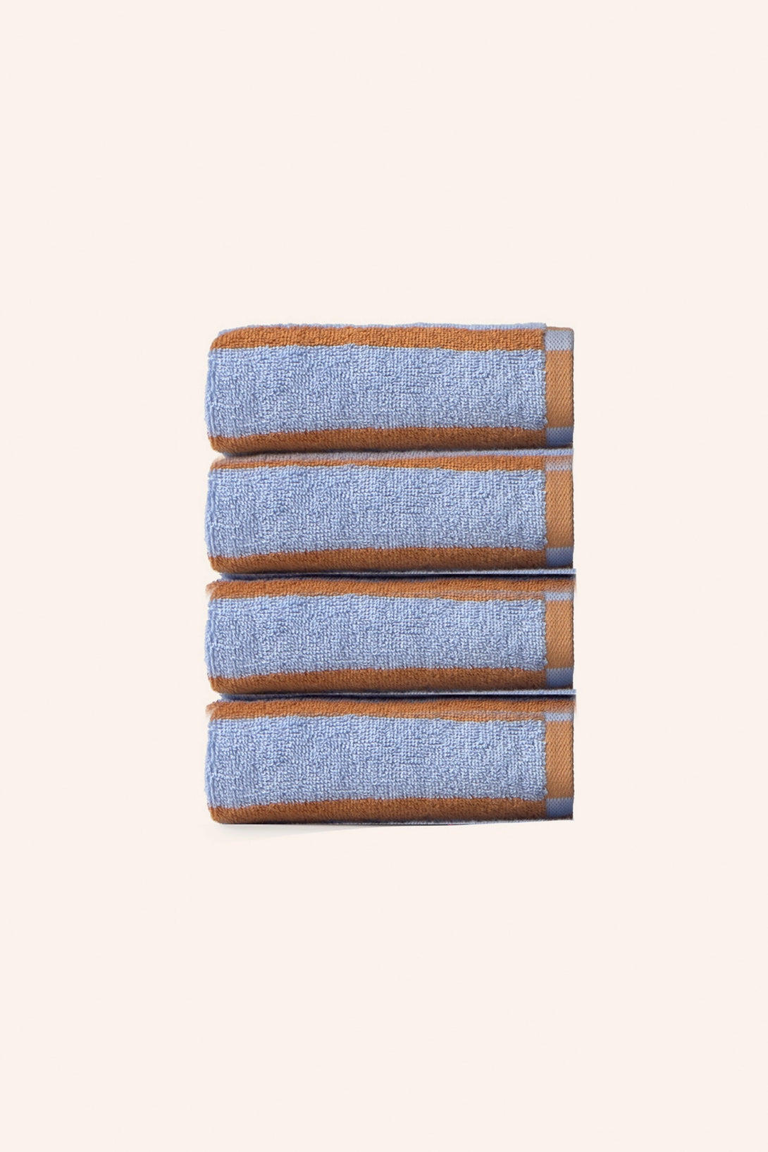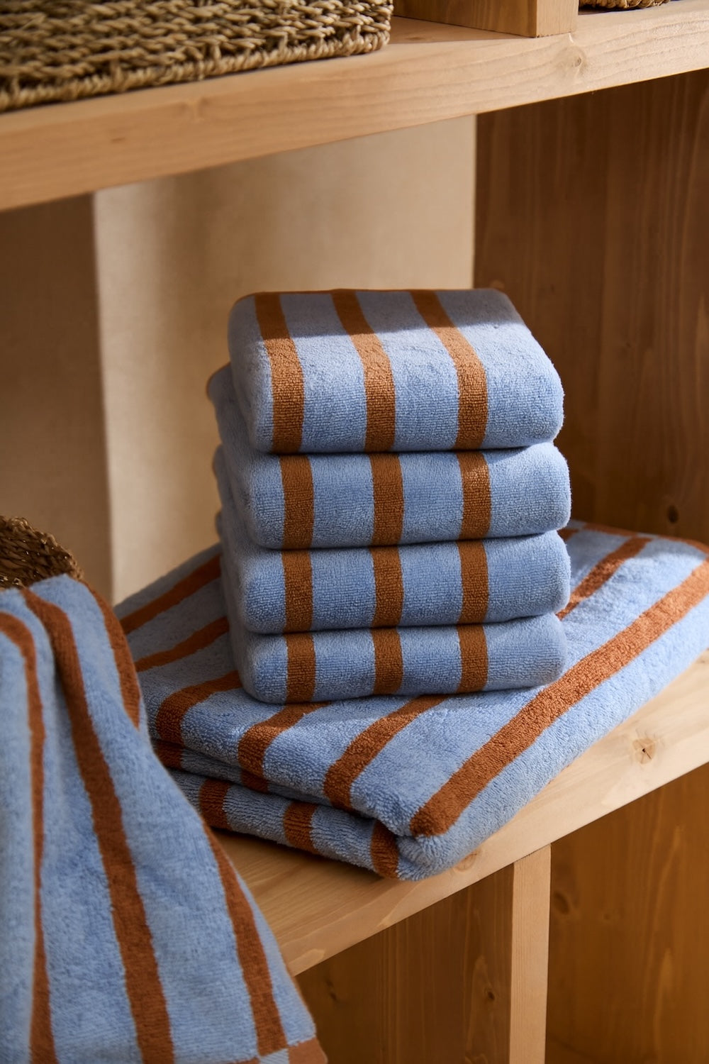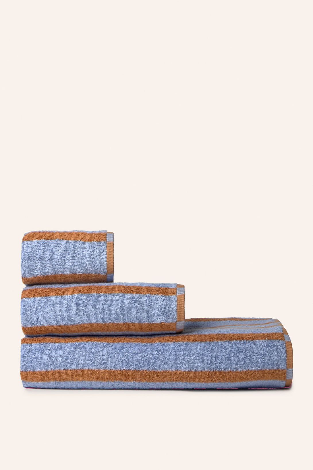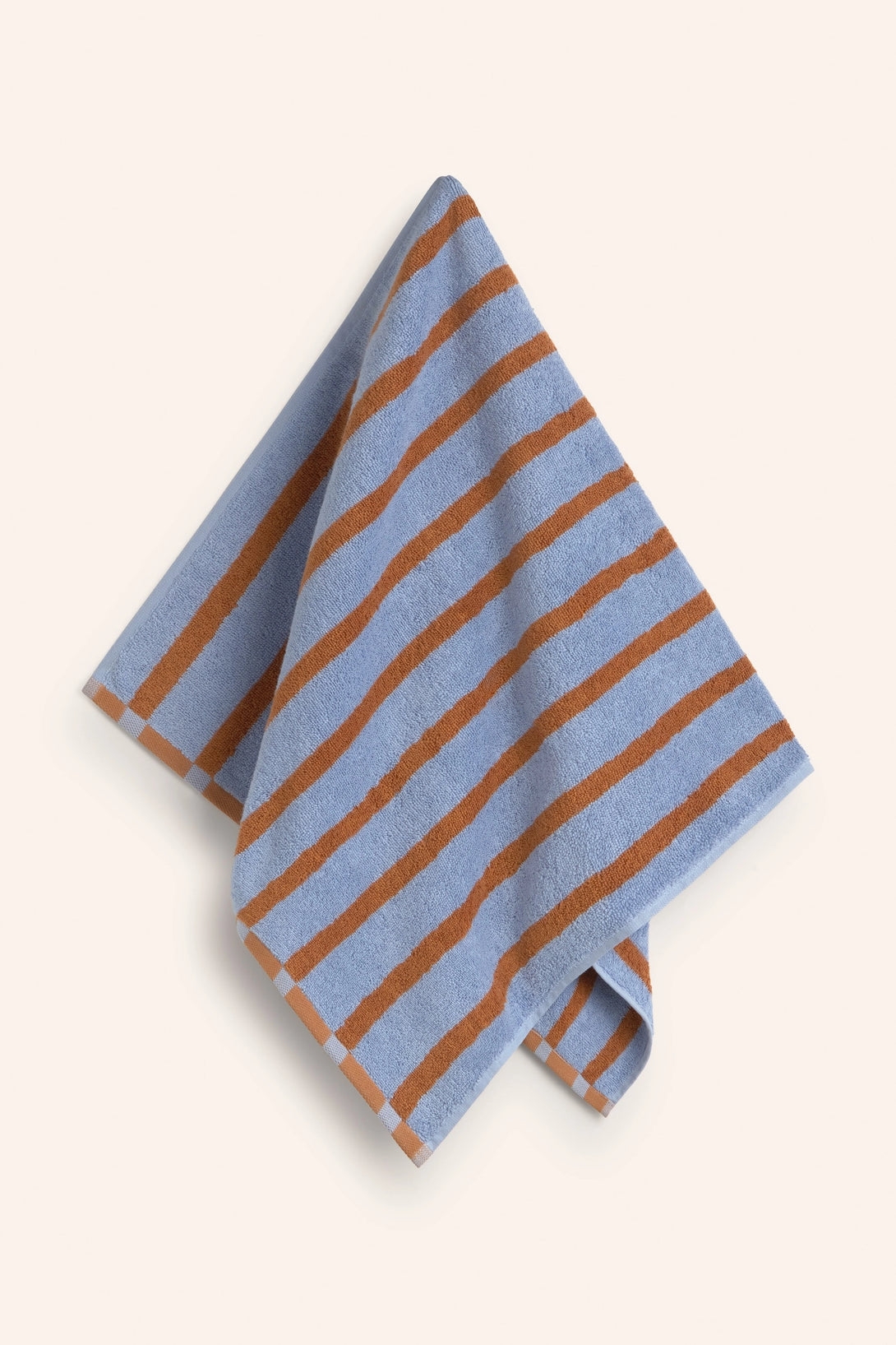 Serviette de bain en coton éponge 530 g/m² tissée en jacquard avec un motif rayé bleu et terre.