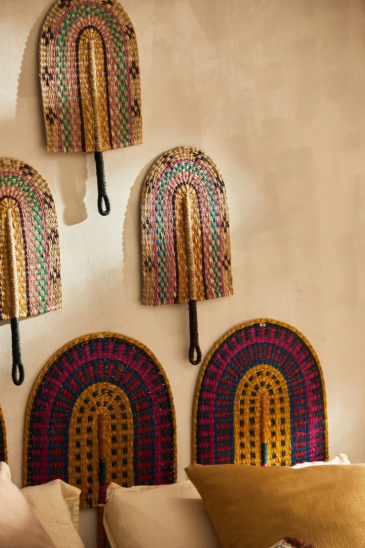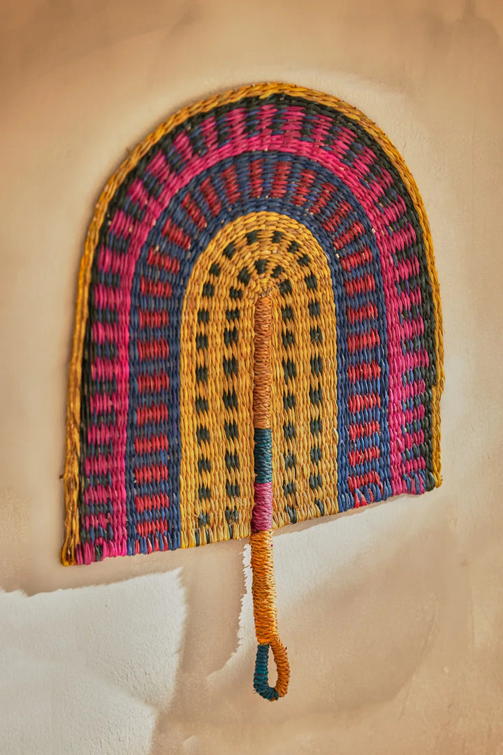 El abanico de junco de mar trenzado Coliseo es el accesorio perfecto para ti. Este abanico está hecho con un 100% de junco de mar, un material natural y ecológico que le da un toque bohemio y artesanal. Su forma semicircular y su mango están tejidos a mano con una técnica meticulosa, garantizando su calidad y durabilidad. El diseño del abanico es colorido y atractivo, con un patrón de amarillo, rosa y azul que crea un efecto visual armonioso. El abanico de junco de mar trenzado Coliseo te hará sentir como una obra de arte.