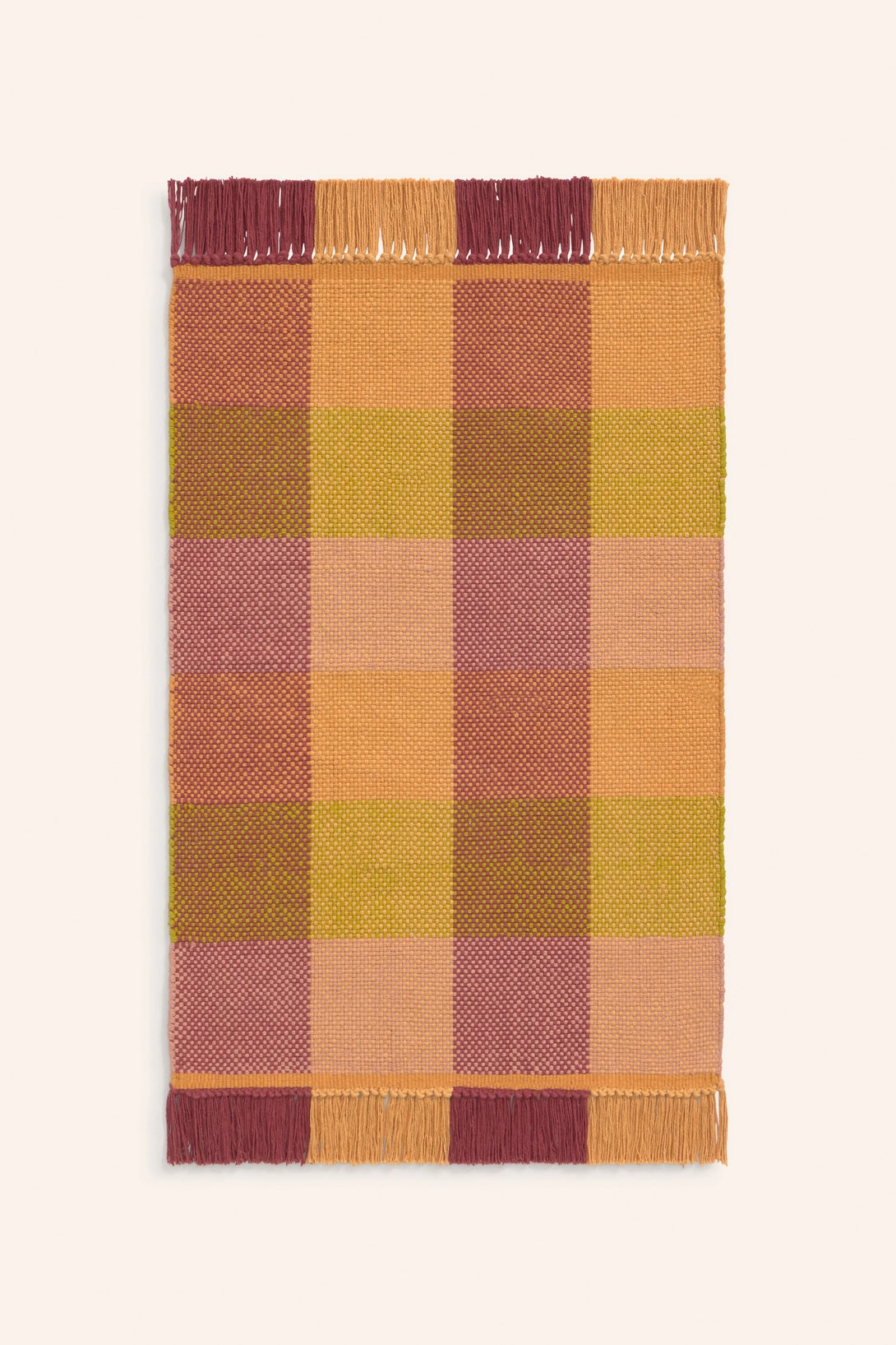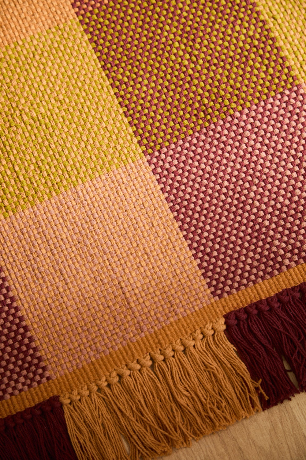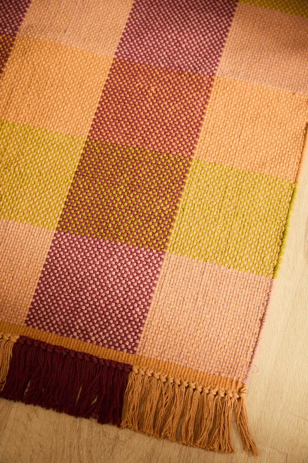 Alfombra lavable de algodón trenzado en tonos cálidos. Acabado en flecos.