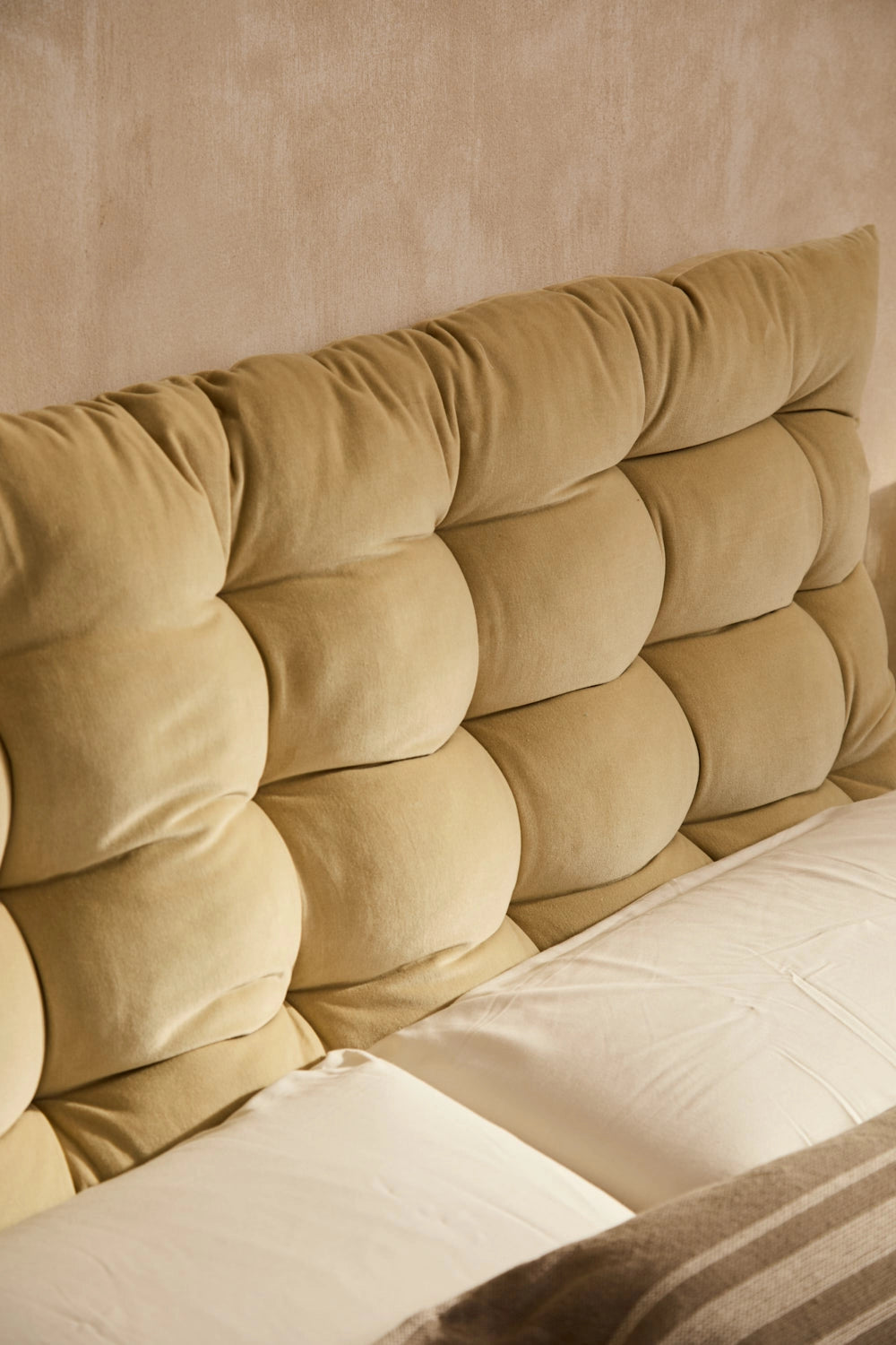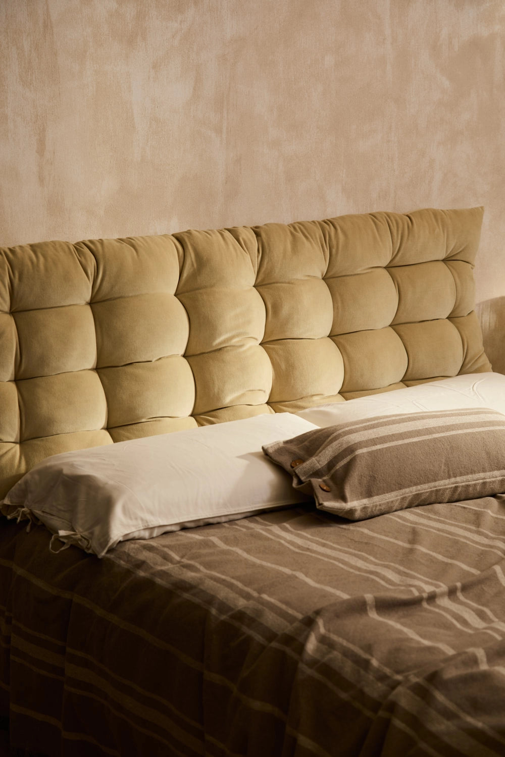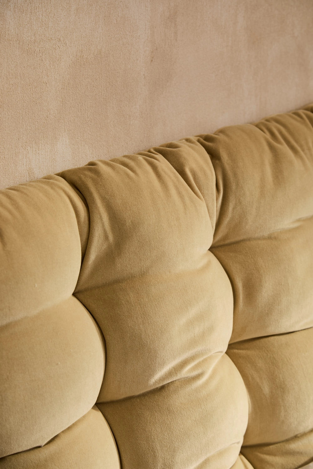 Cabecero acolchado de terciopelo de algodón crudo Velour. Trasero en tela lisa. Detalles en capitoné. Asas para agarre en pared.