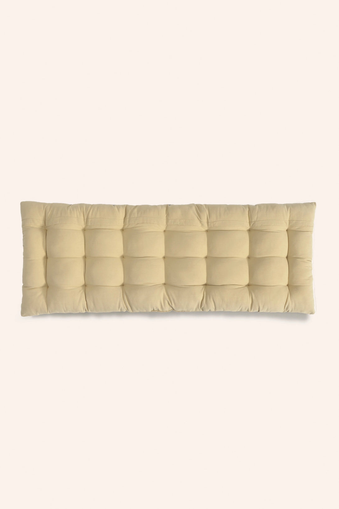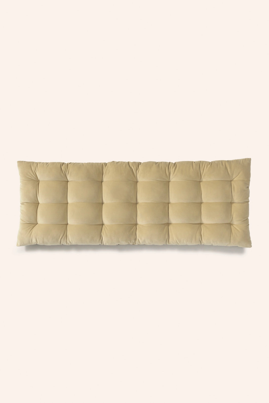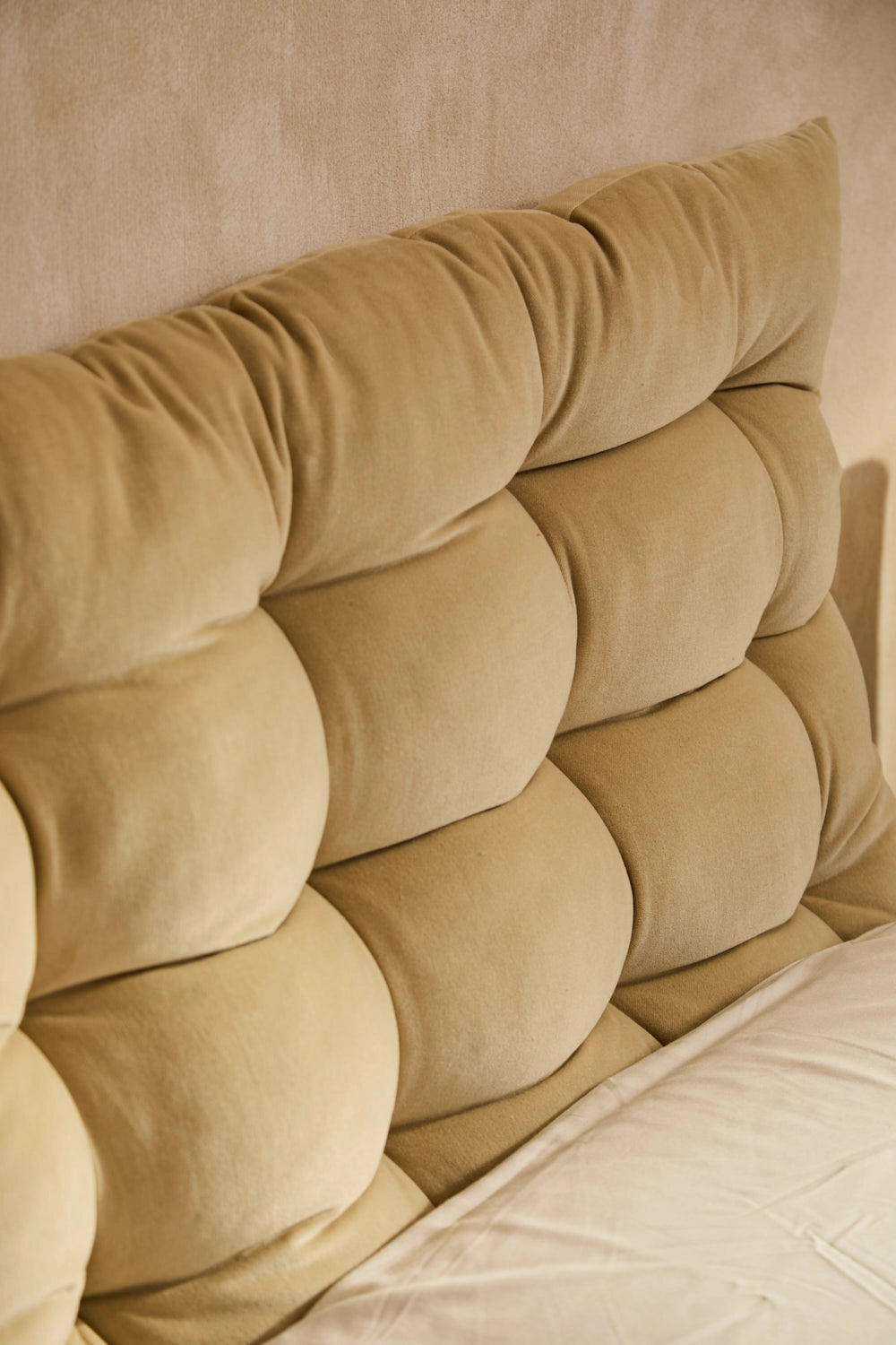 Cabecero acolchado de terciopelo de algodón crudo Velour. Trasero en tela lisa. Detalles en capitoné. Asas para agarre en pared.