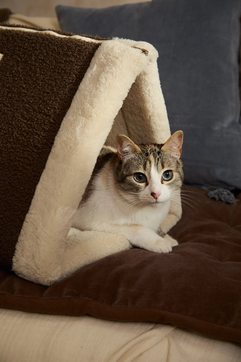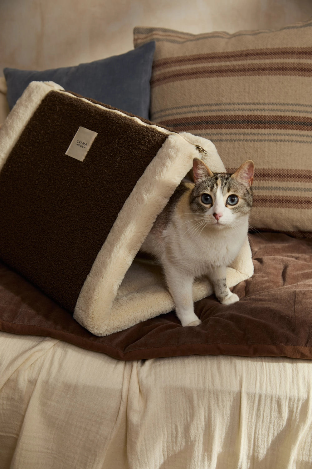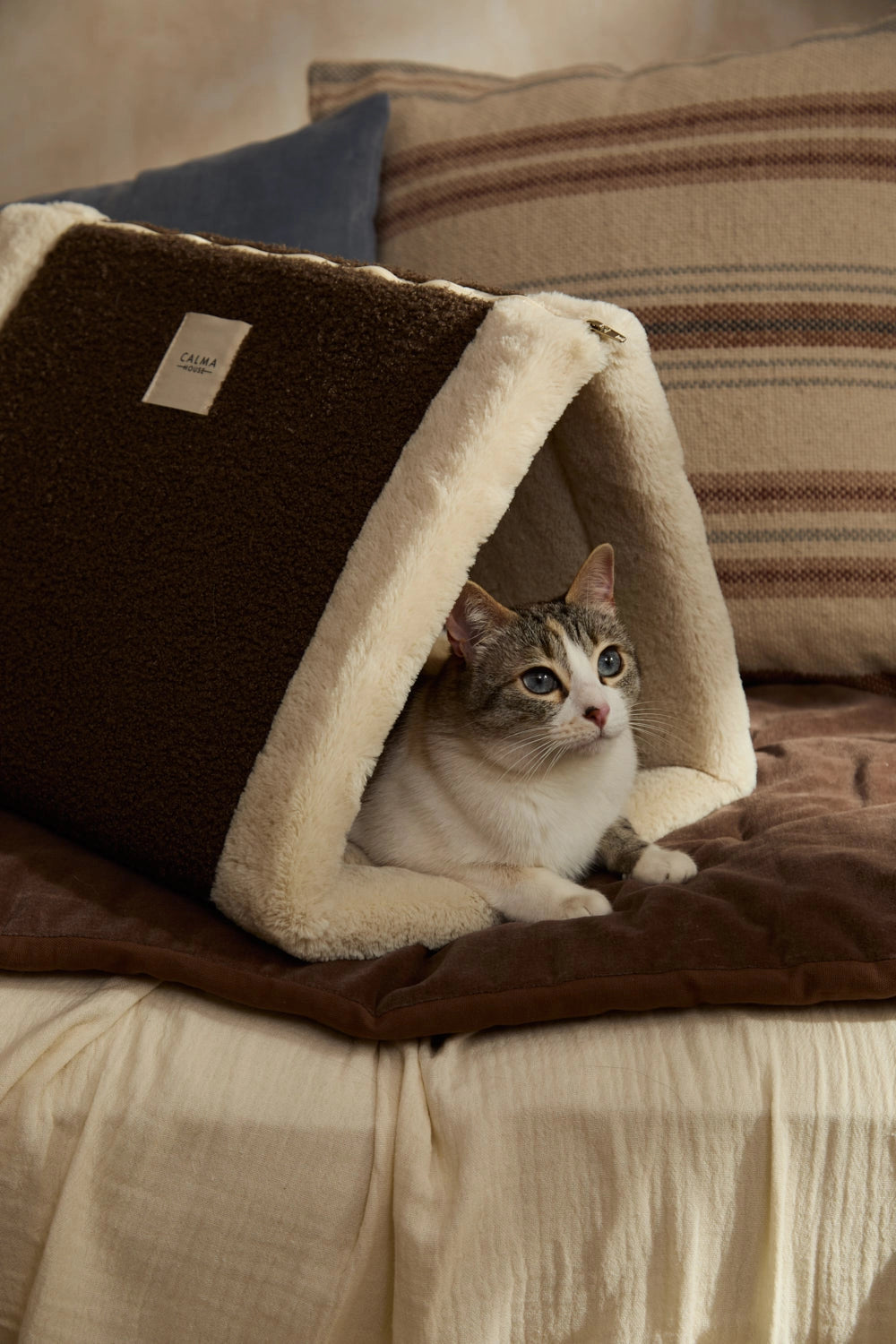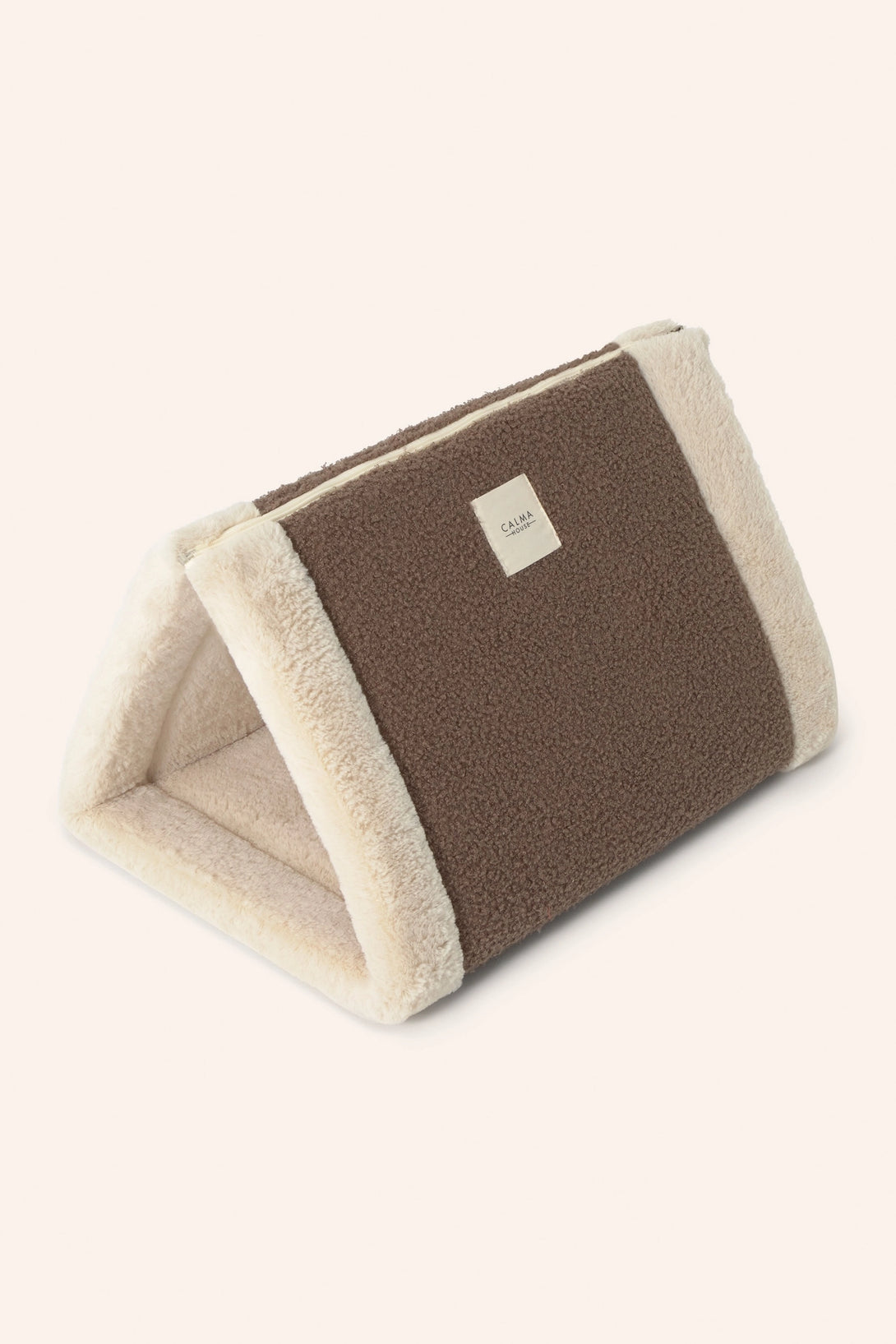 Cama plegable para mascotas. Se puede usar desplegada o plegada como refugio. Cierre con cremallera. Interior de pelo largo suave y exterior en tejido de manta.