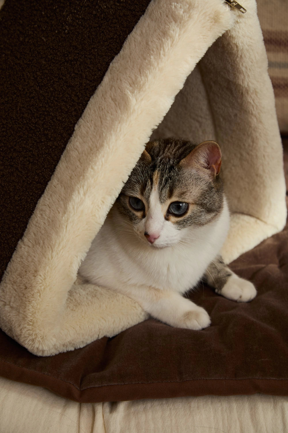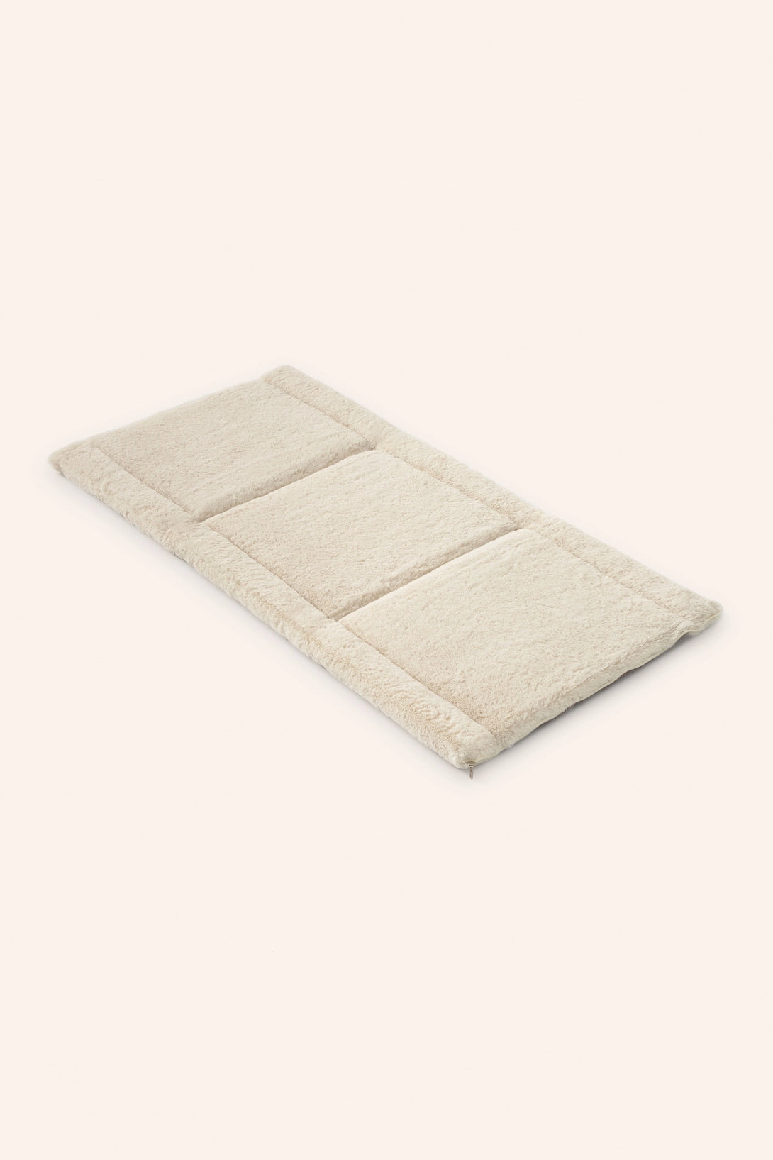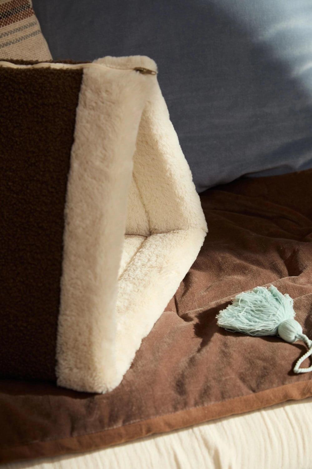 Cama plegable para mascotas. Se puede usar desplegada o plegada como refugio. Cierre con cremallera. Interior de pelo largo suave y exterior en tejido de manta.