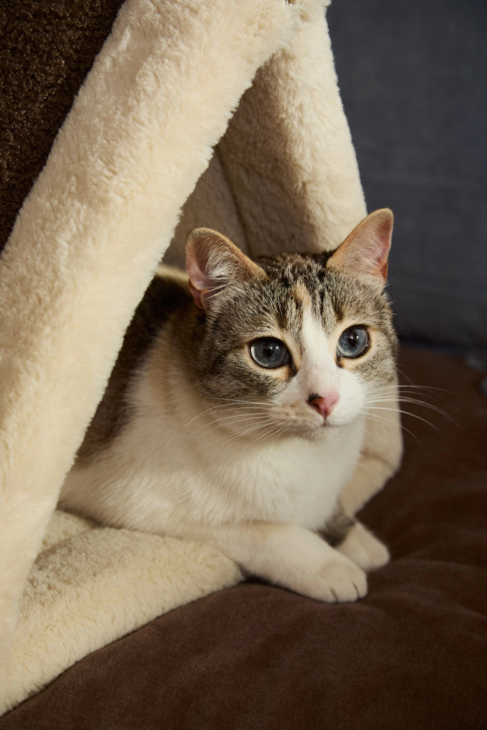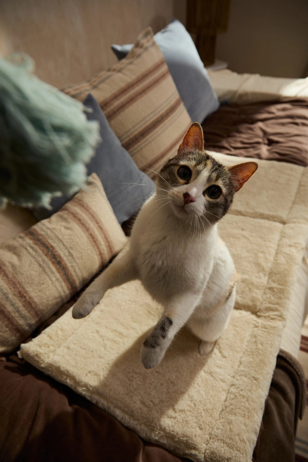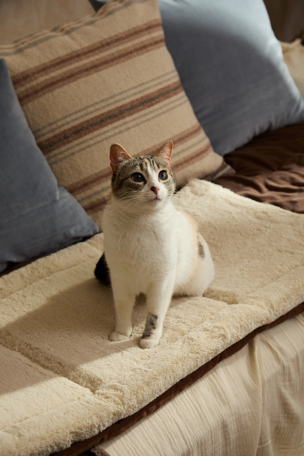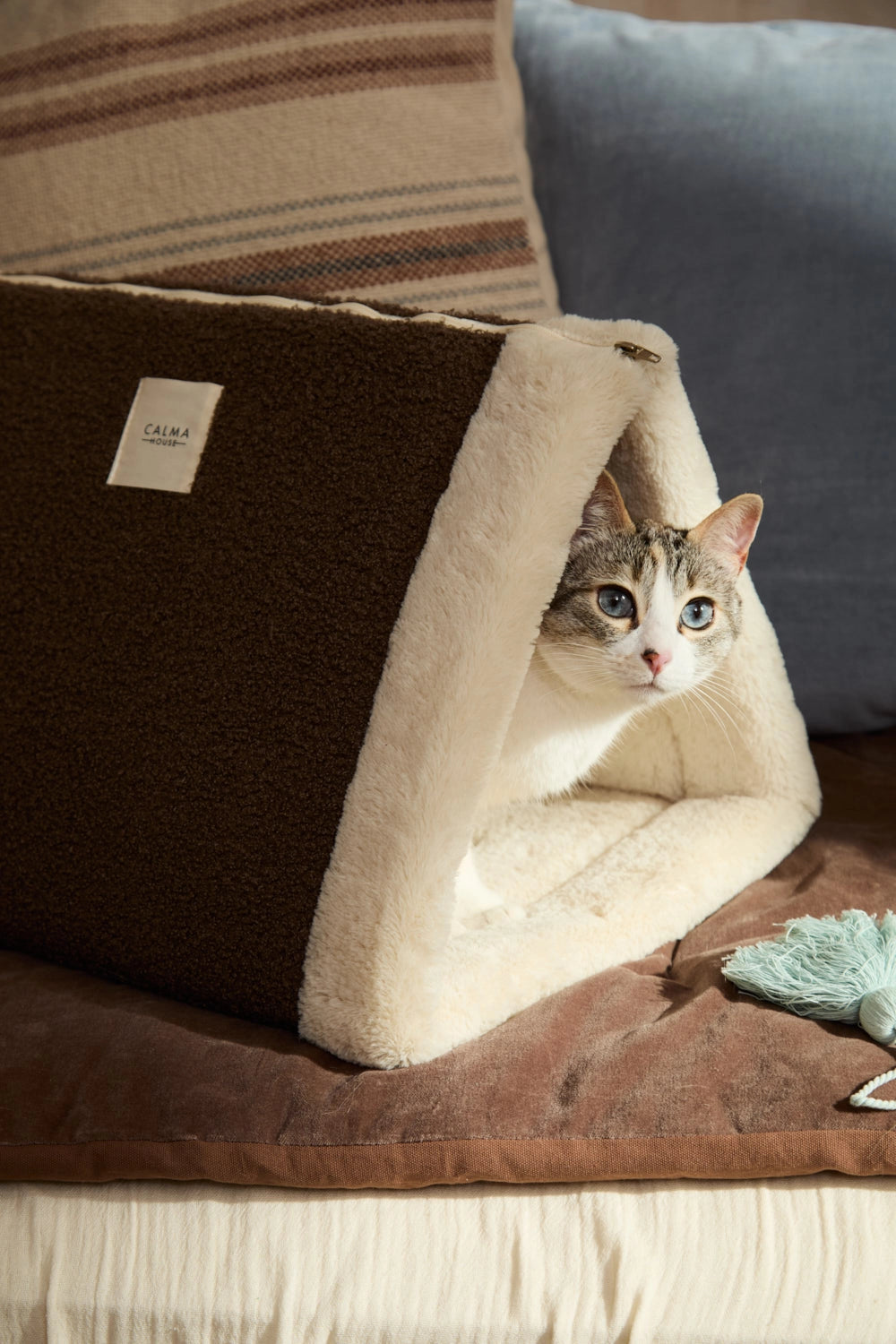 Cama plegable para mascotas. Se puede usar desplegada o plegada como refugio. Cierre con cremallera. Interior de pelo largo suave y exterior en tejido de manta.