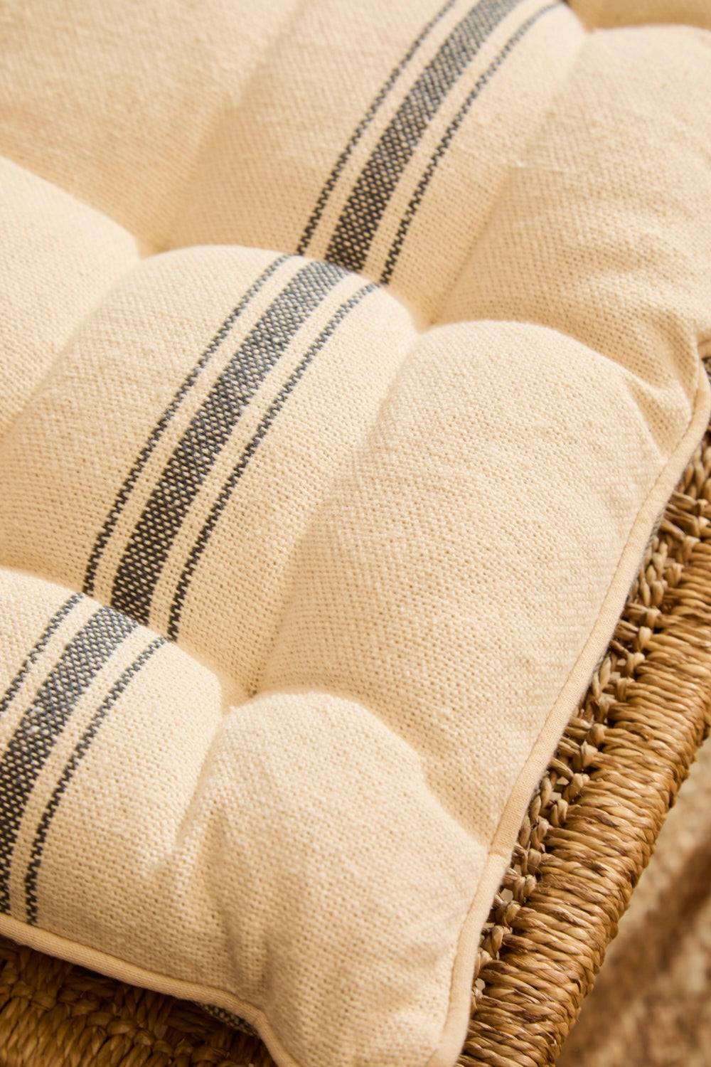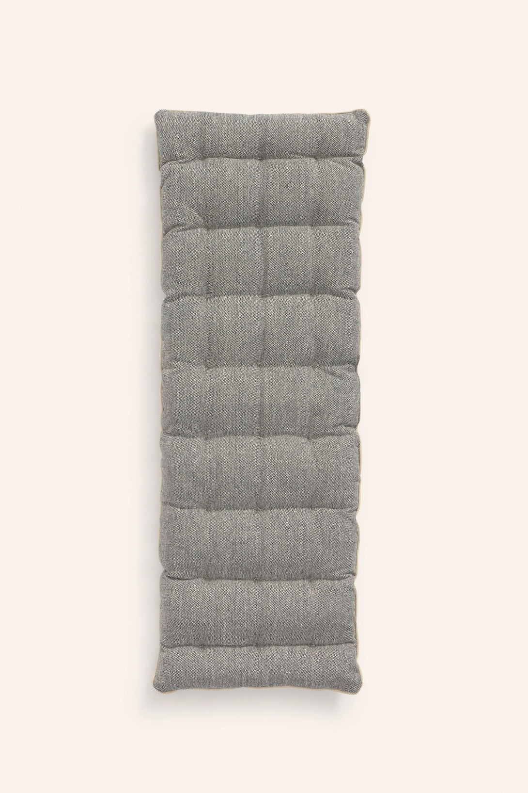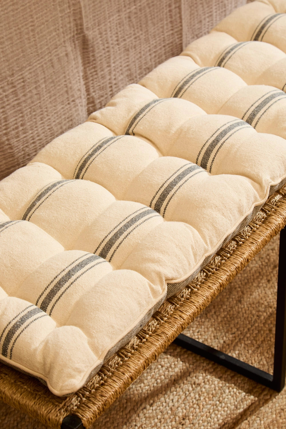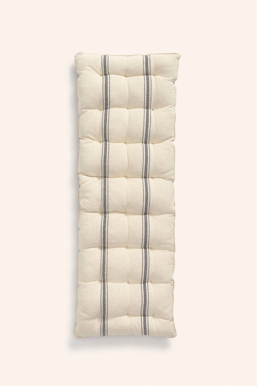 Cojín de banco relleno. Rayas tejidas en efecto chambray sobre fondo crudo. Detalles en capitoné. Trasero en chambray gris. Lavable a máquina. Al tratarse de un producto acolchado y confeccionado manualmente, las medidas pueden variar.