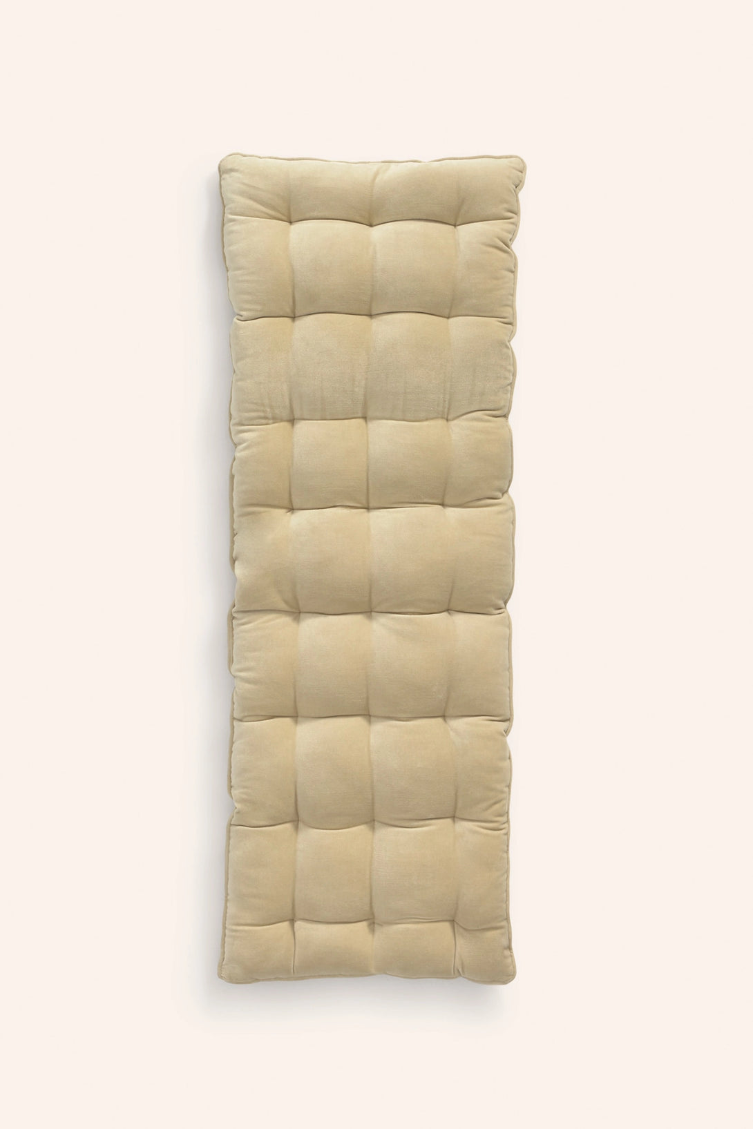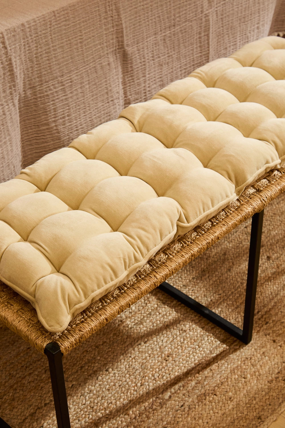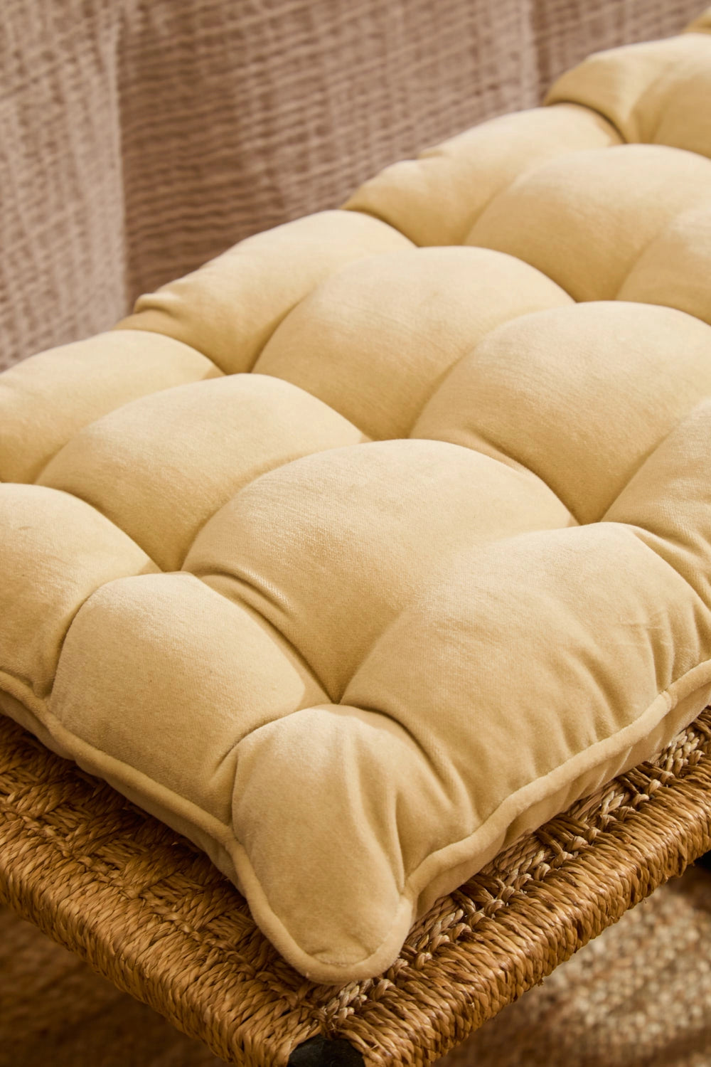 Cojín de banco de terciopelo crudo de algodón relleno. Detalles en capitoné. Trasero idéntico al frontal. Lavable en máquina. Al tratarse de un producto acolchado y confeccionado manualmente, las medidas pueden variar.