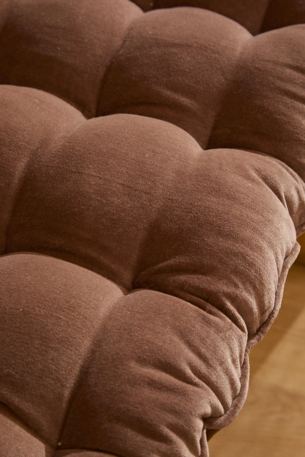 Cojín de banco de terciopelo marrón de algodón relleno. Detalles en capitoné. Trasero idéntico al frontal. Lavable en máquina. Al tratarse de un producto acolchado y confeccionado manualmente, las medidas pueden variar.