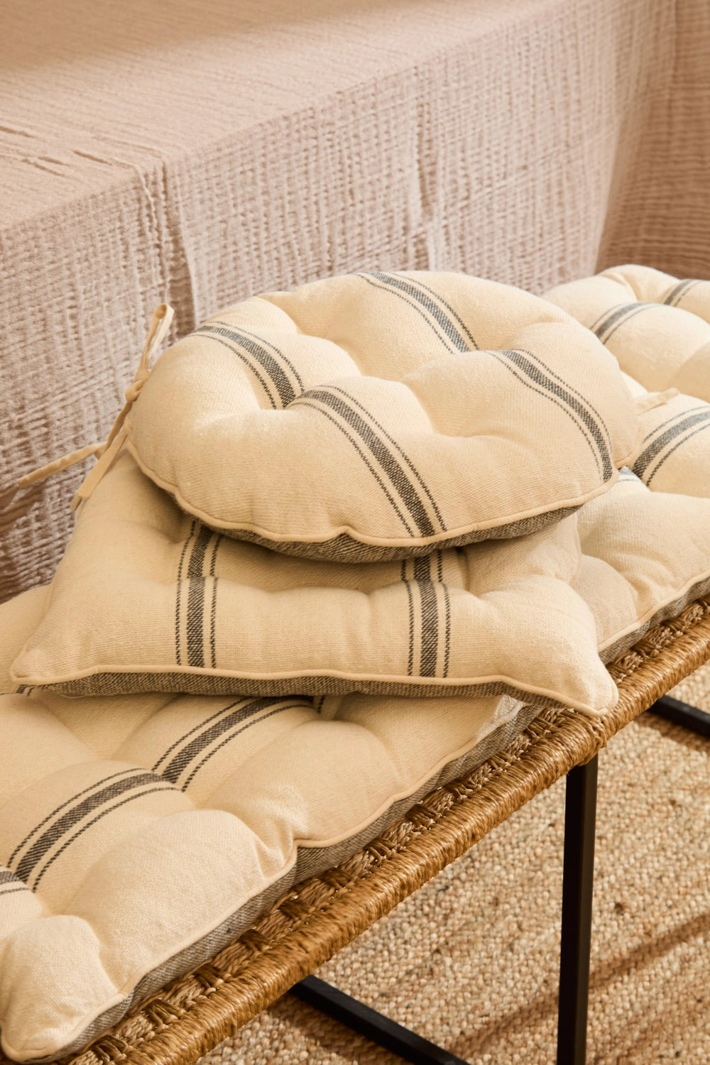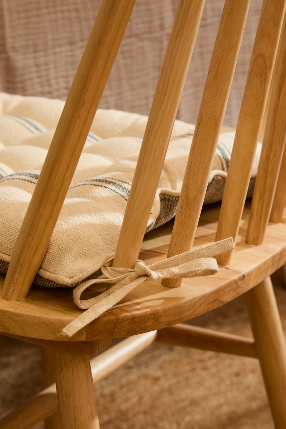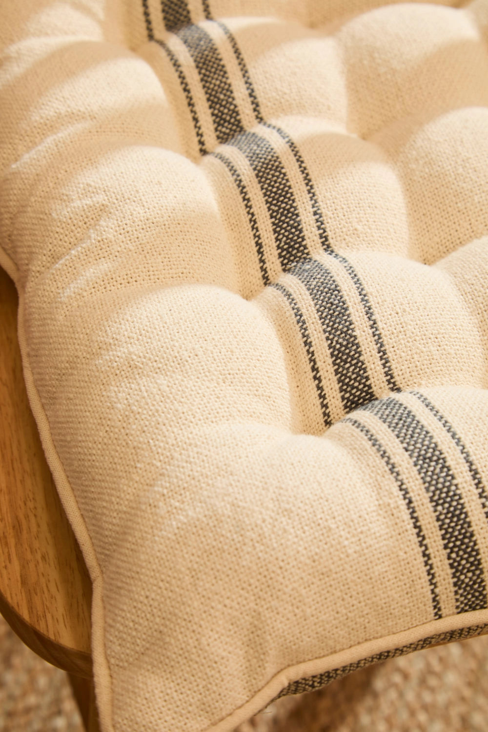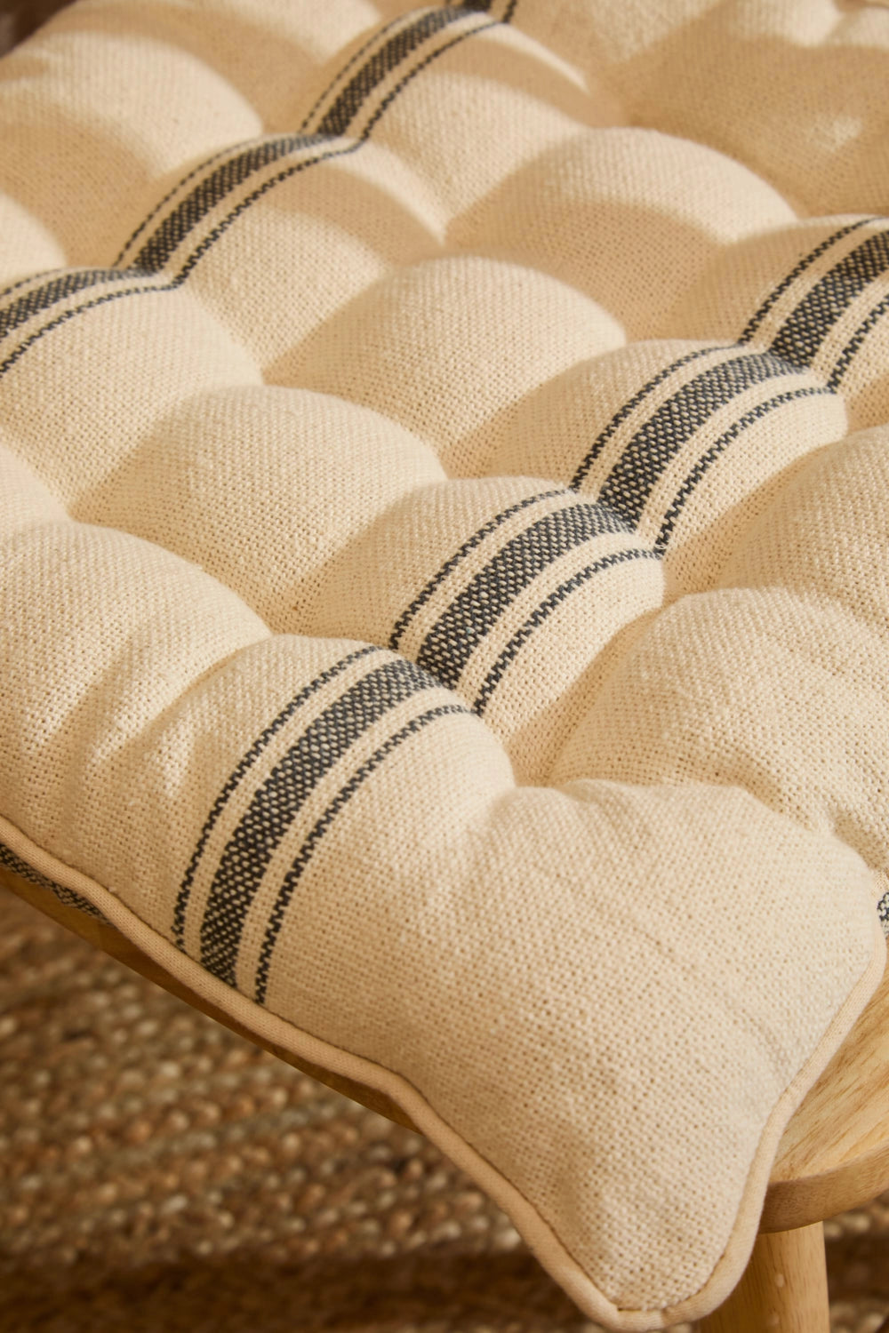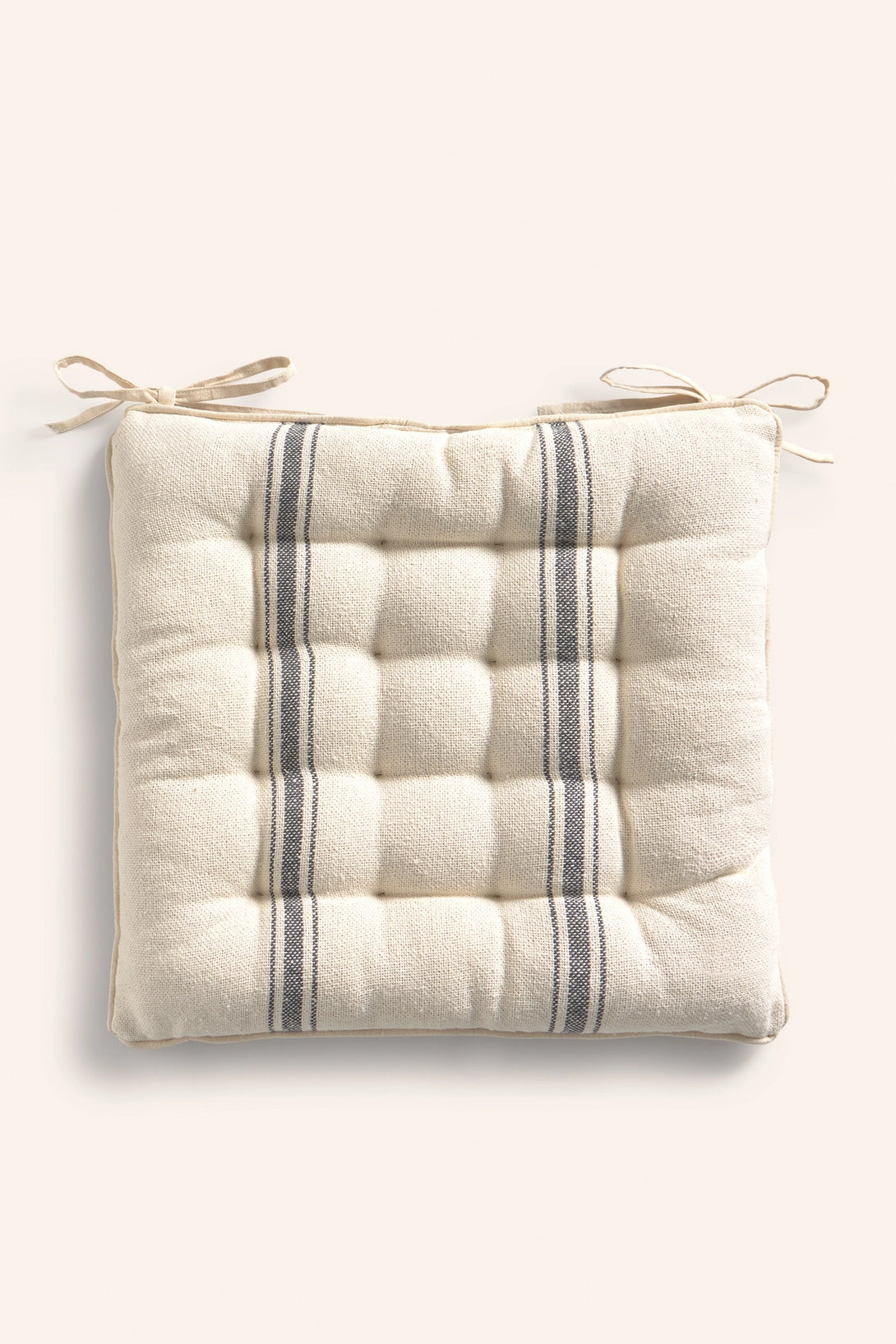 Cojín de silla cuadrado relleno. Rayas tejidas en efecto chambray sobre fondo crudo. Detalles en capitoné. Trasero en chambray gris. Incluye cintas para amarrar a la silla. Lavable a máquina. Al tratarse de un producto acolchado y confeccionado manualmente, las medidas pueden variar.