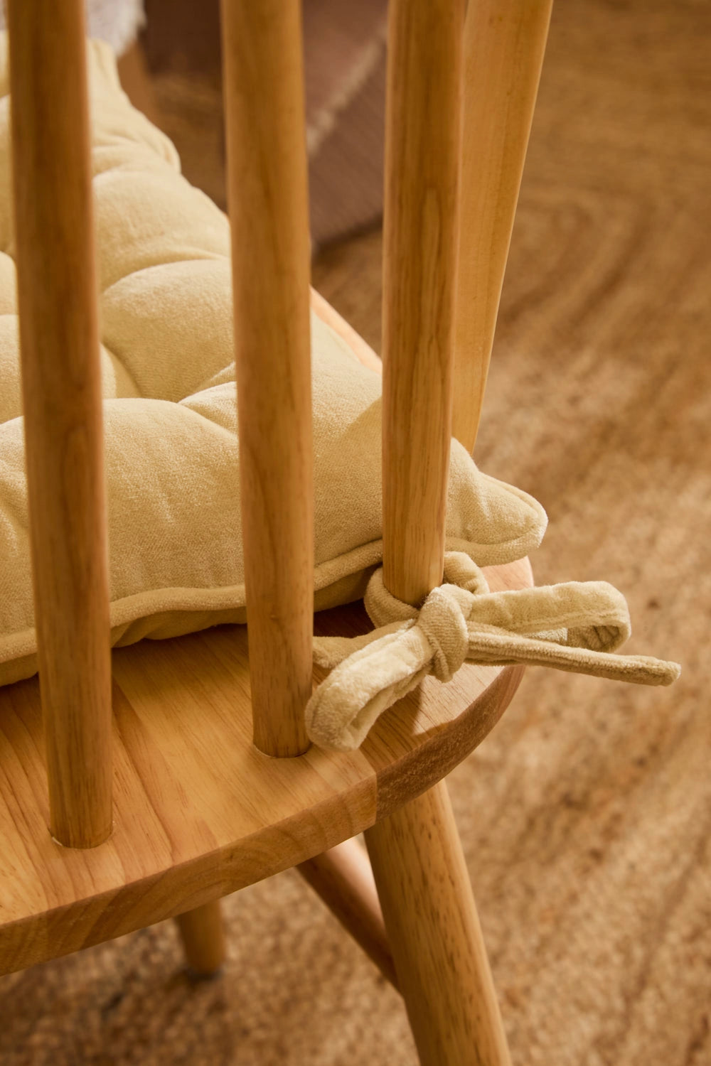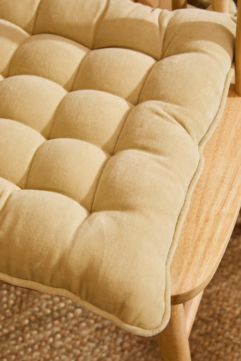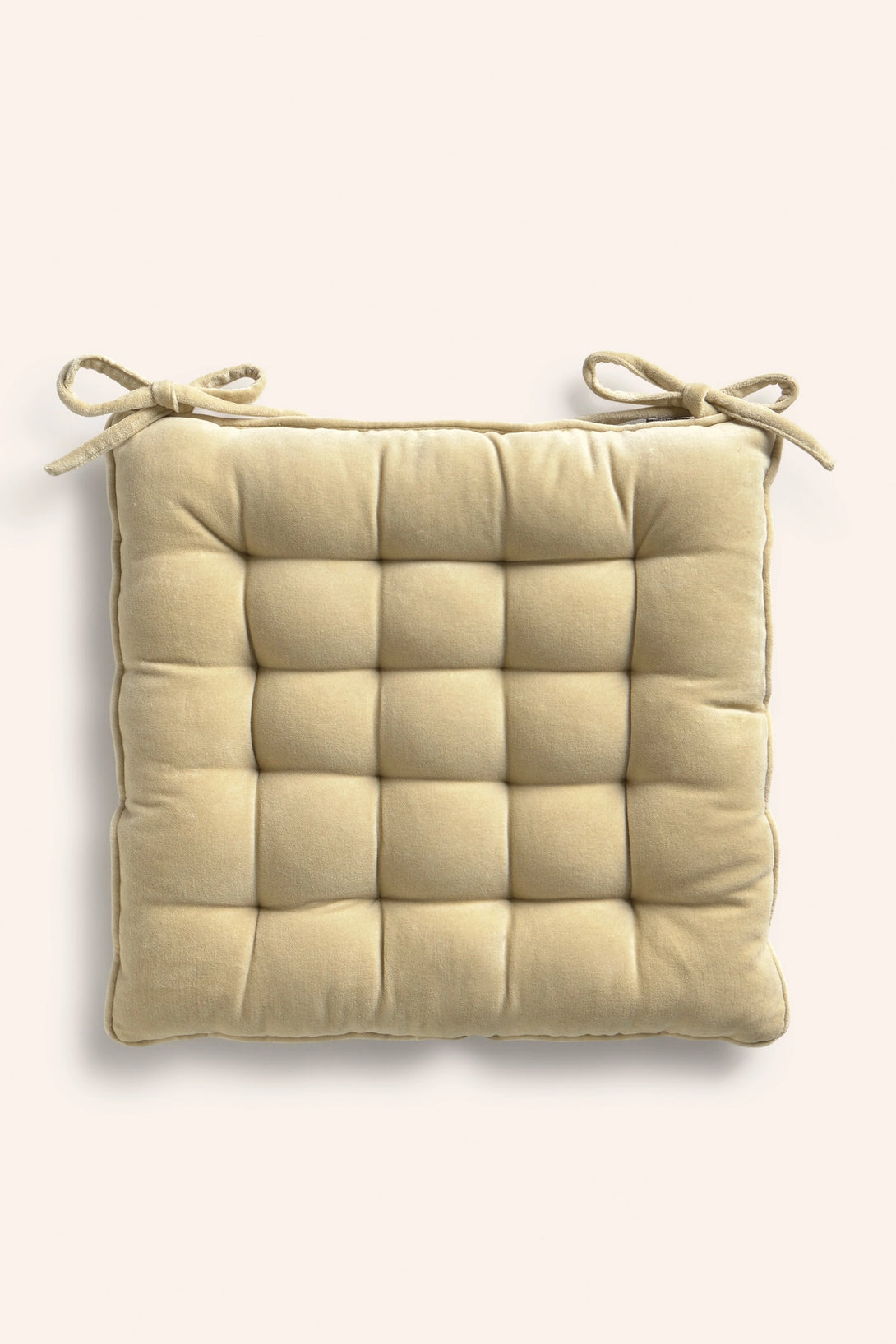 Cojín de silla cuadrado de terciopelo de algodón color crudo relleno. Detalles en capitoné. Incluye tiras para agarre a la silla. Trasero idéntico al frontal. Lavable en máquina. Al tratarse de un producto acolchado y confeccionado manualmente, las medidas pueden variar.