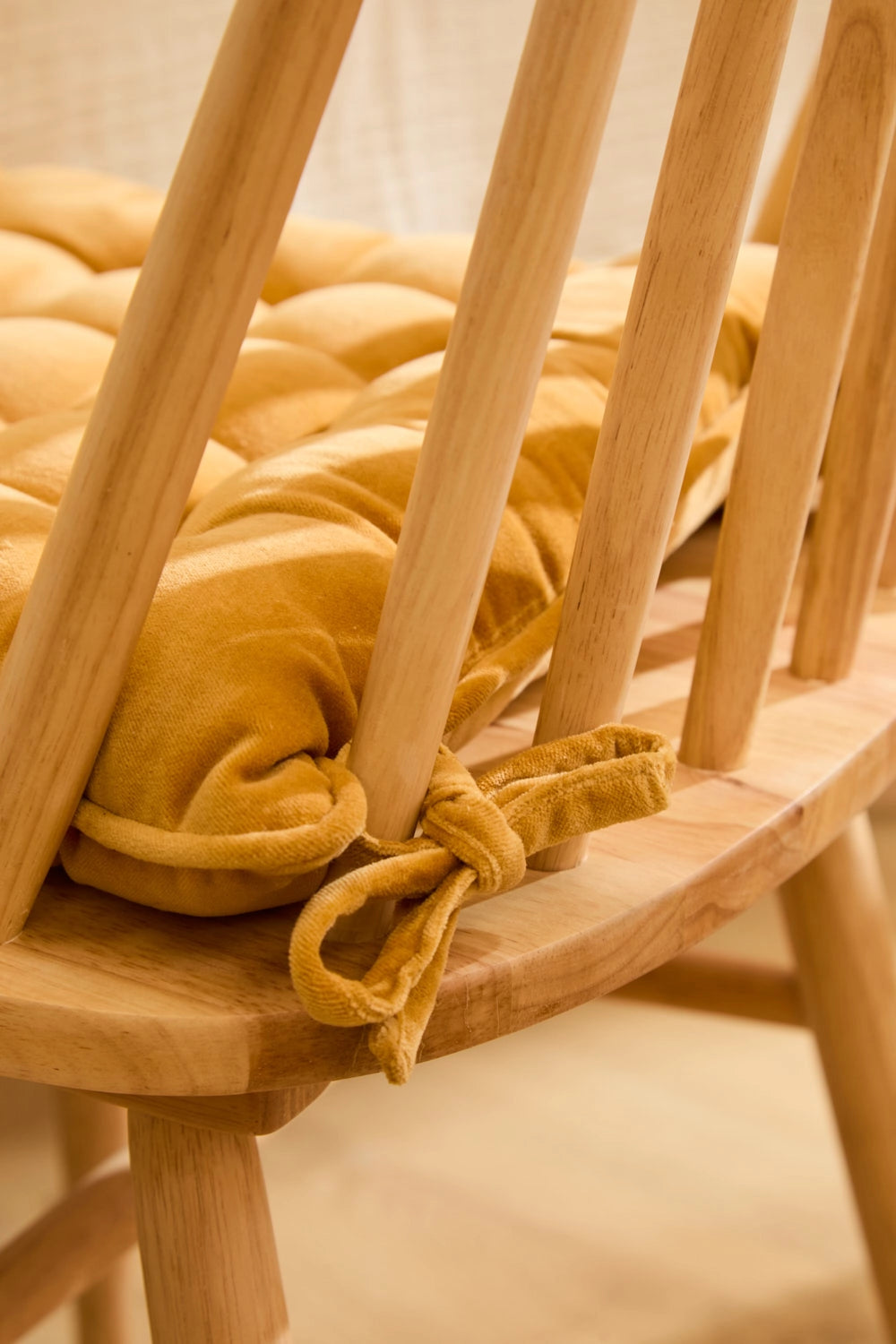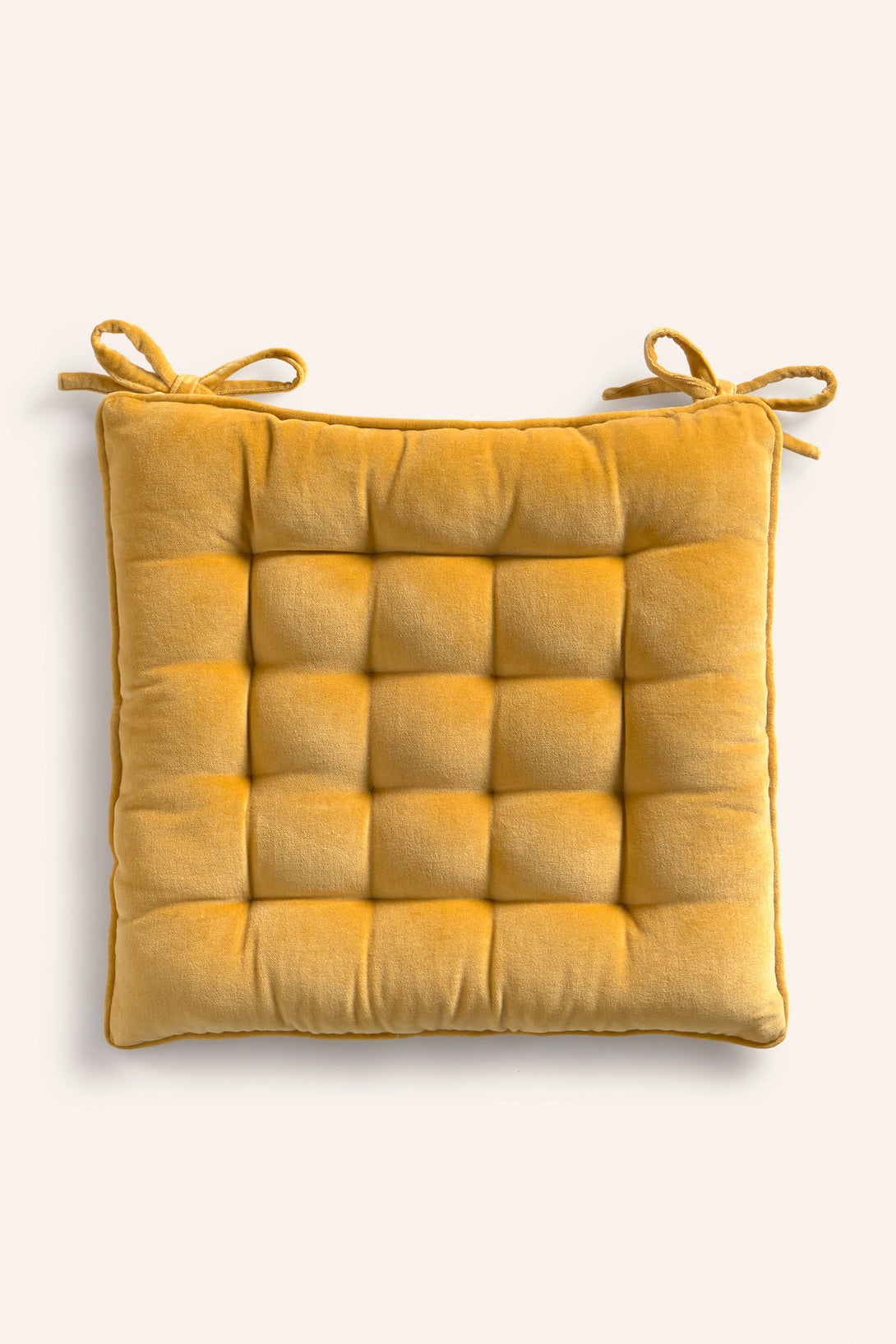 Cojín de silla cuadrado de terciopelo de algodón color mostaza relleno. Detalles en capitoné. Incluye tiras para agarre a la silla. Trasero idéntico al frontal. Lavable en máquina. Al tratarse de un producto acolchado y confeccionado manualmente, las medidas pueden variar.