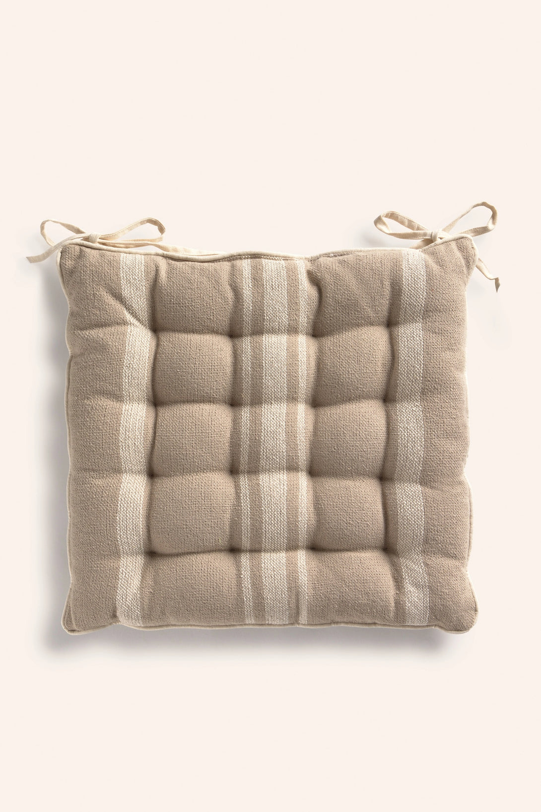 Cojín de silla cuadrado relleno. Raya tejida en algodón sobre tono piedra. Detalles en capitoné y trasero en chambray. Tiras para atar a la silla. Lavable en máquina. Al tratarse de un producto acolchado y confeccionado manualmente, las medidas pueden variar.