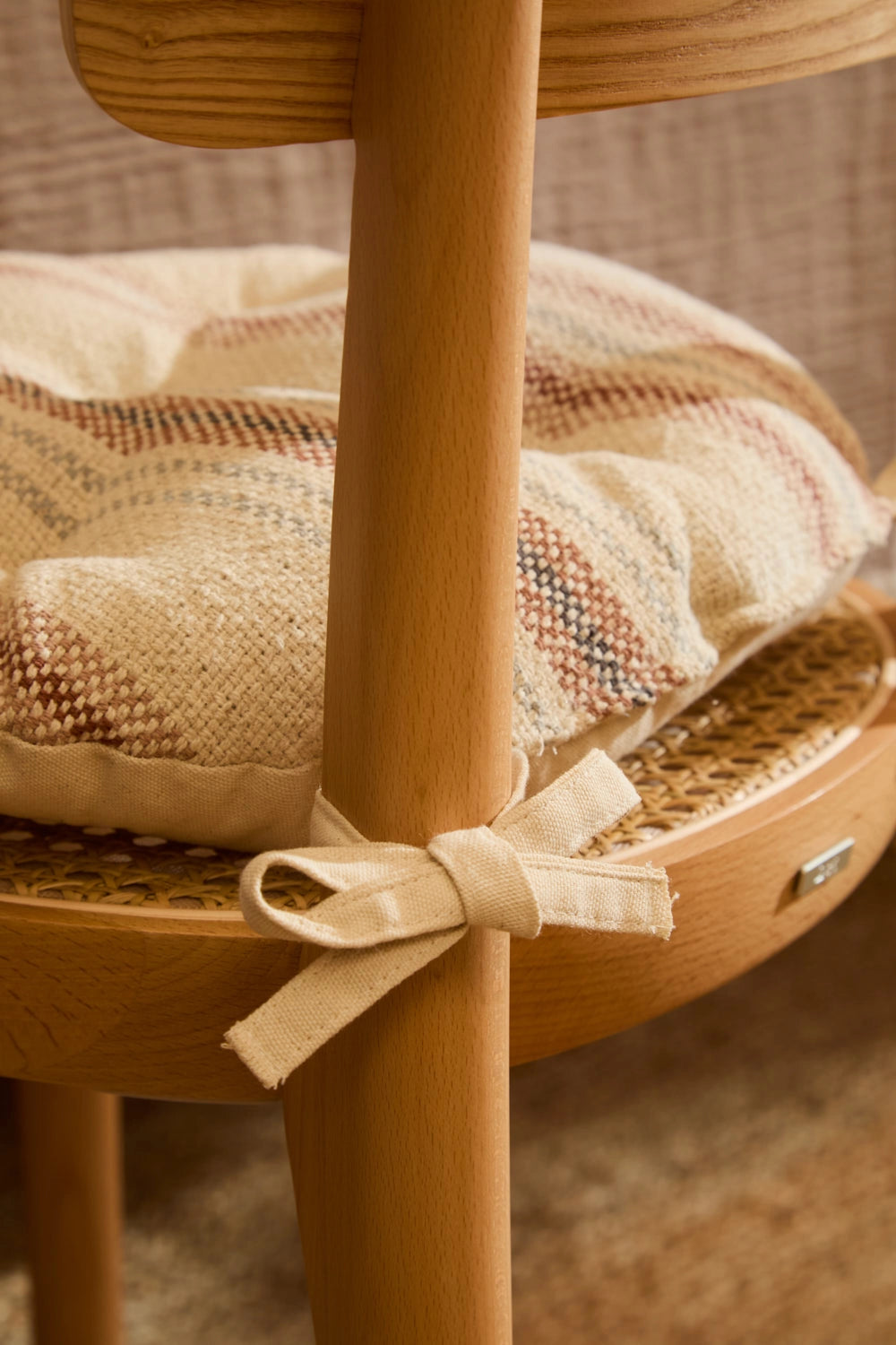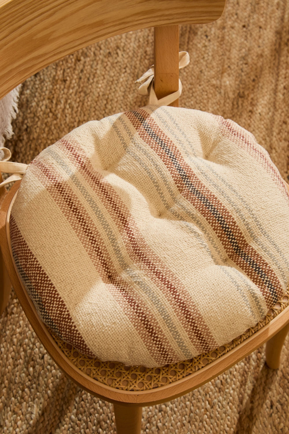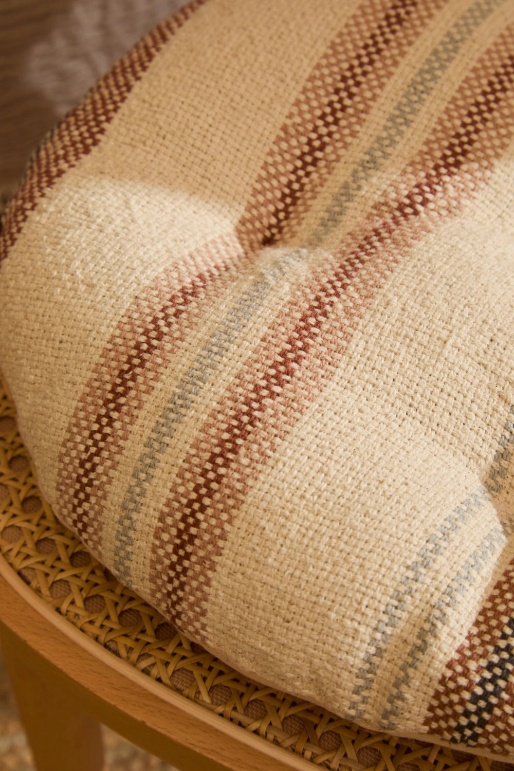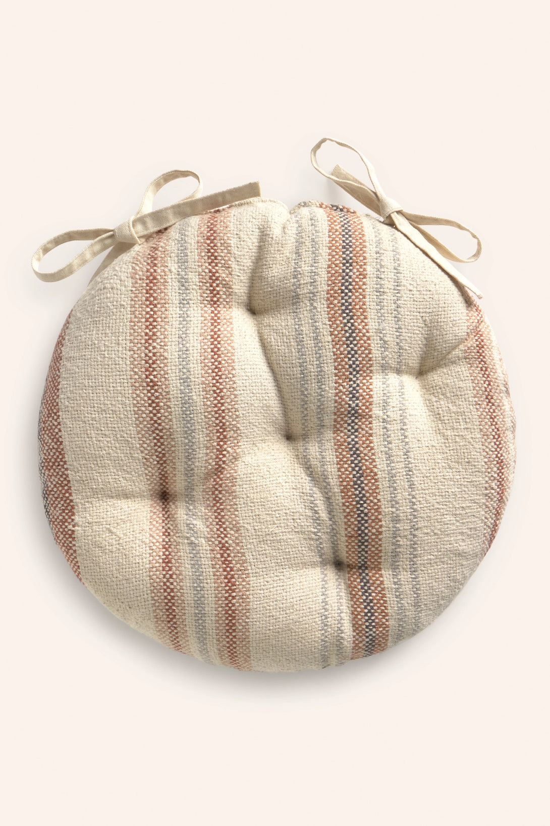 Cojín de silla redondo relleno. Rayas tejidas en tonos tierra sobre fondo crudo. Trasero en canvas liso. Detalles en capitoné. Incluye cintas para agarre a silla. Lavable a máquina. Al tratarse de un producto acolchado y confeccionado manualmente, las medidas pueden variar.