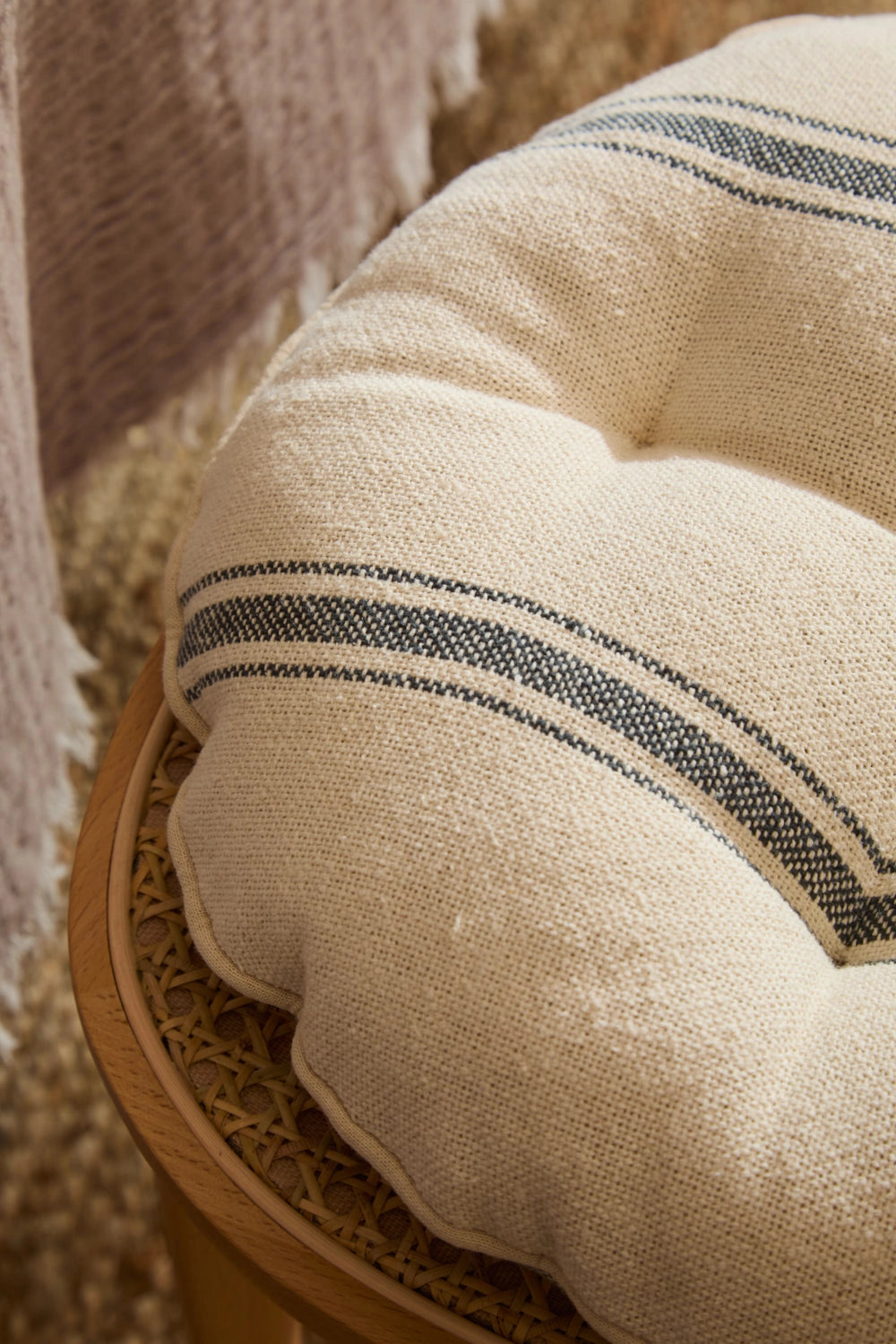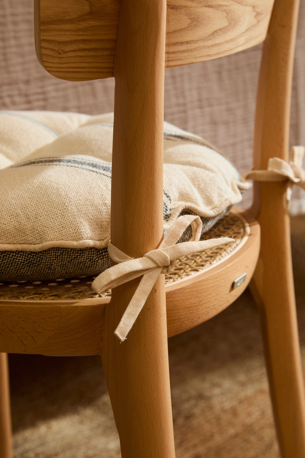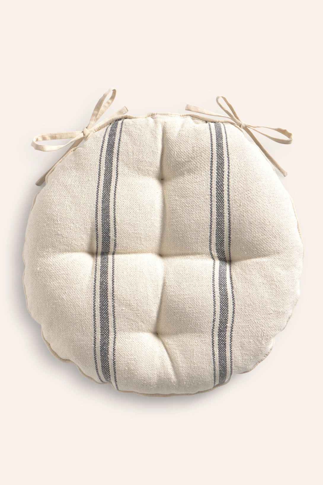 Cojín de silla redondo relleno. Rayas tejidas en efecto chambray sobre fondo crudo. Detalles en capitoné. Trasero en chambray gris. Incluye cintas para amarrar a la silla. Lavable a máquina. Al tratarse de un producto acolchado y confeccionado manualmente, las medidas pueden variar.