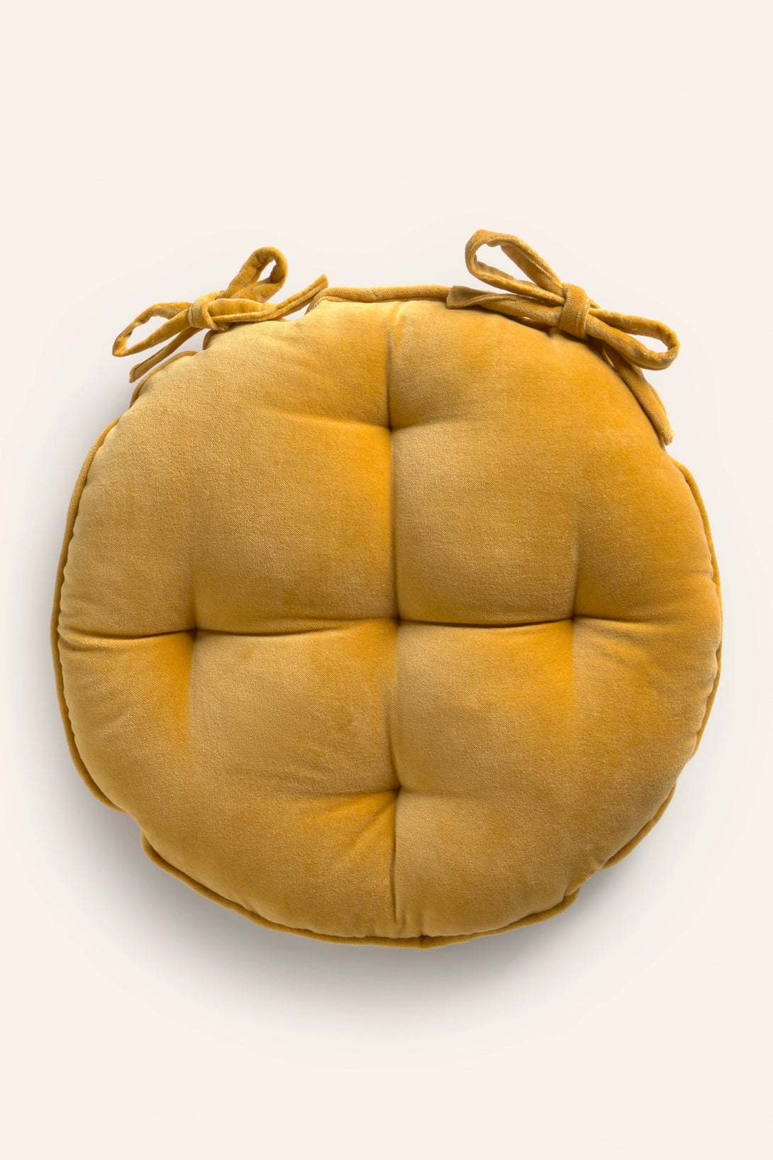 Cojín de silla redondo de terciopelo mostaza de algodón relleno. Detalles en capitoné. Incluye tiras para agarre a la silla. Trasero idéntico al frontal. Lavable en máquina. Al tratarse de un producto acolchado y confeccionado manualmente, las medidas pueden variar.