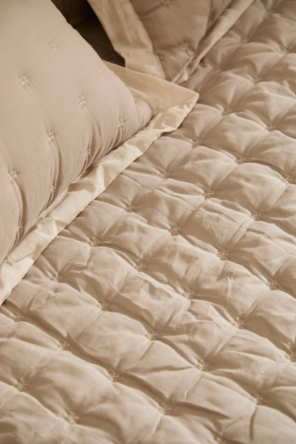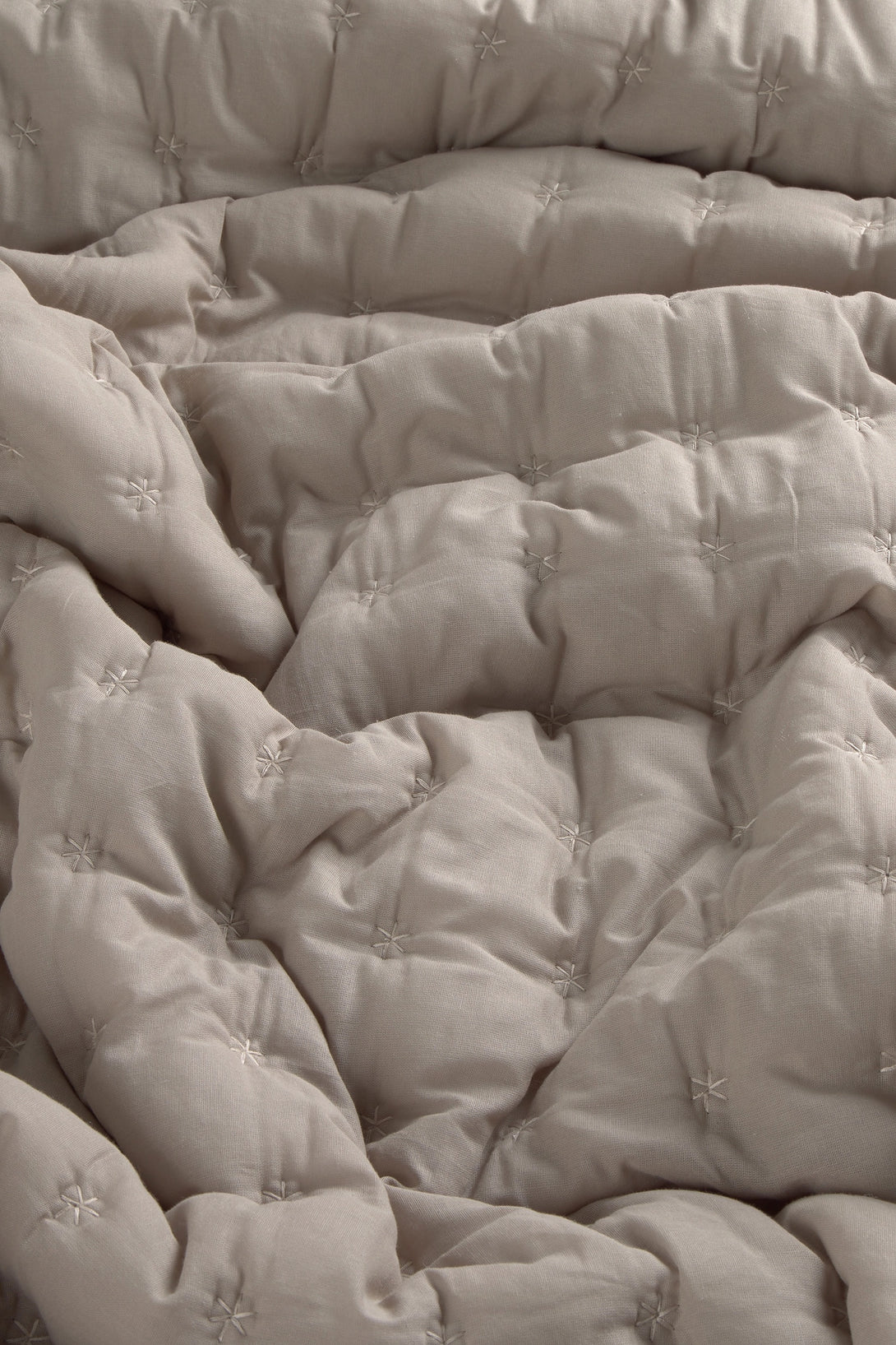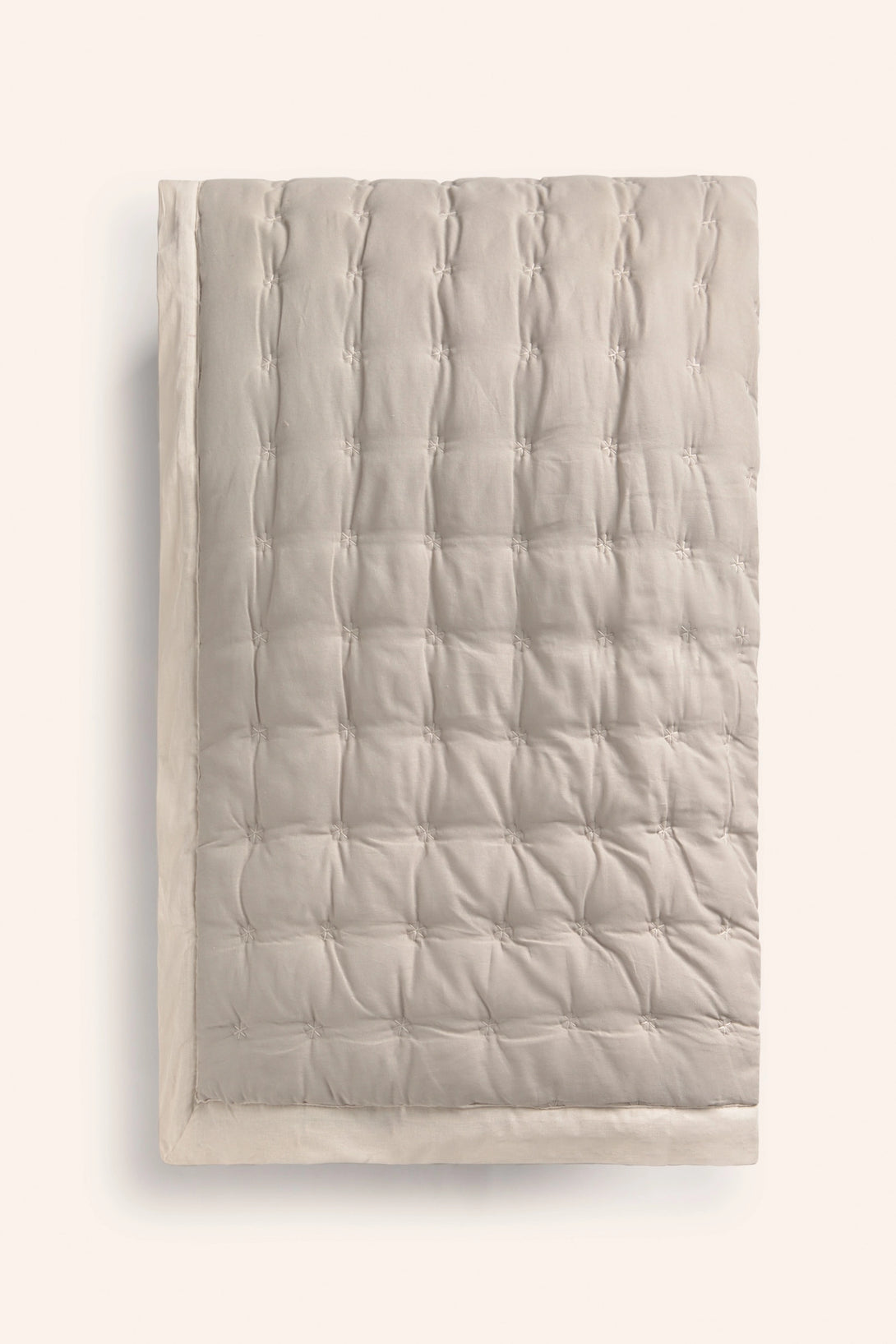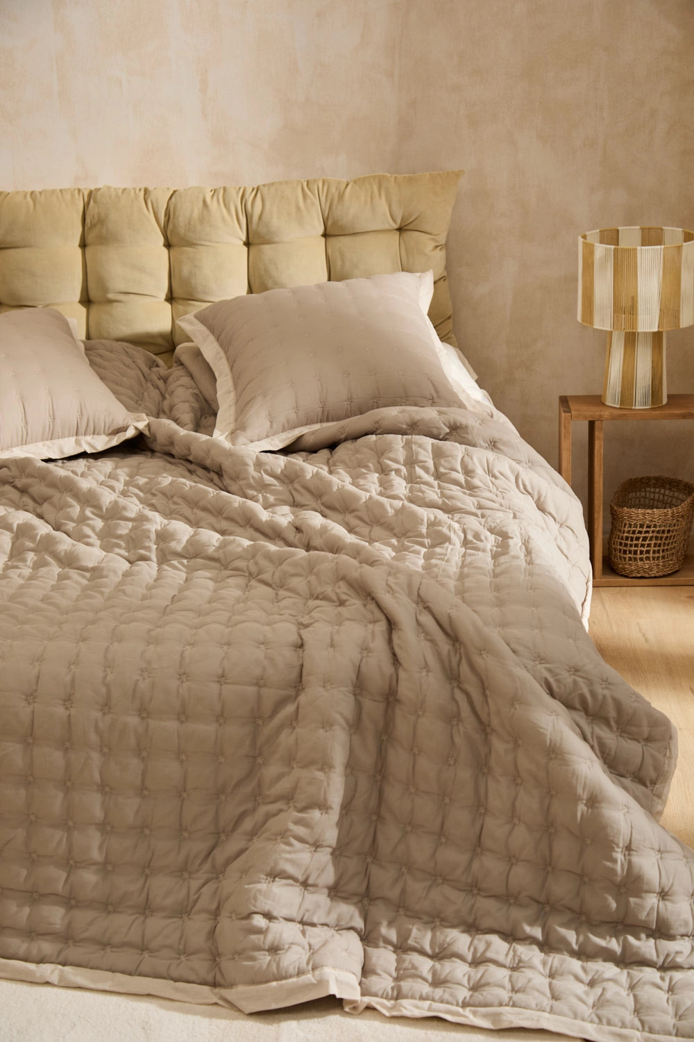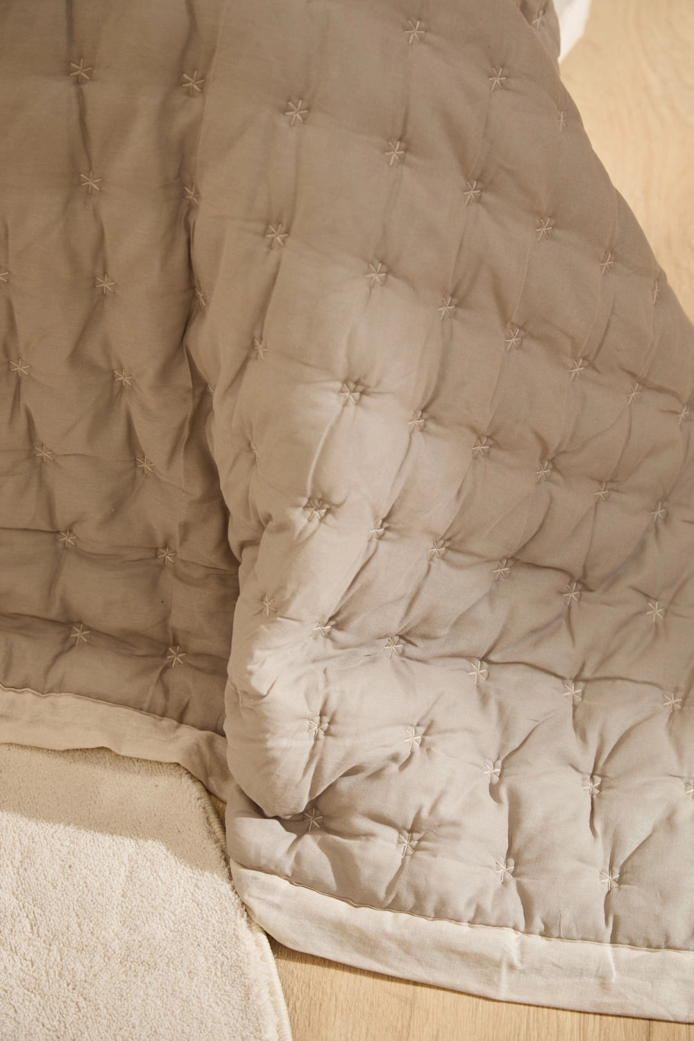 Colcha edredón acolchada en tono beige con detalles en bordado. Ribete a contraste.