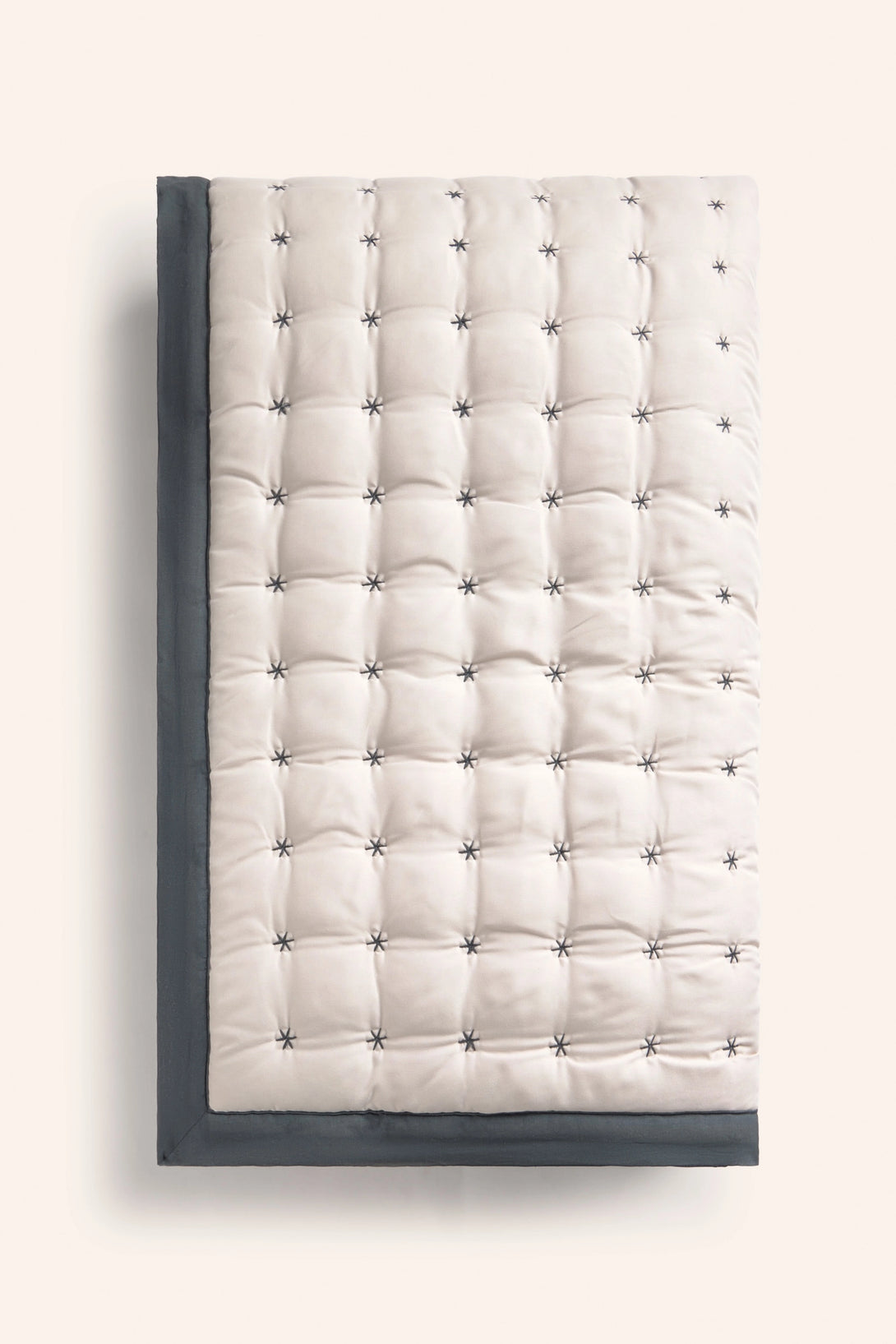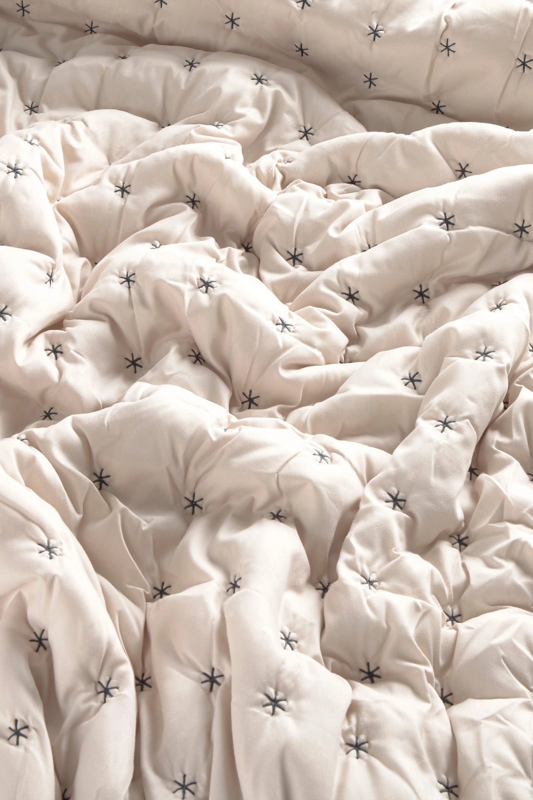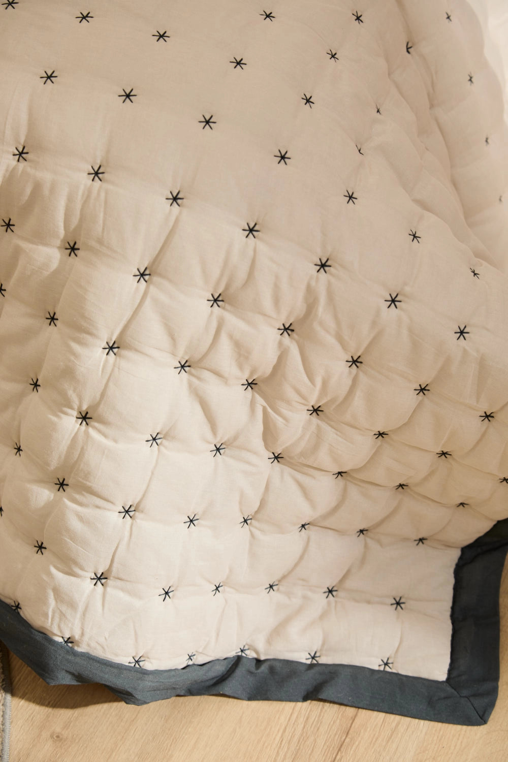 Colcha edredón acolchada en tono crudo con detalles en bordado. Ribete a contraste.