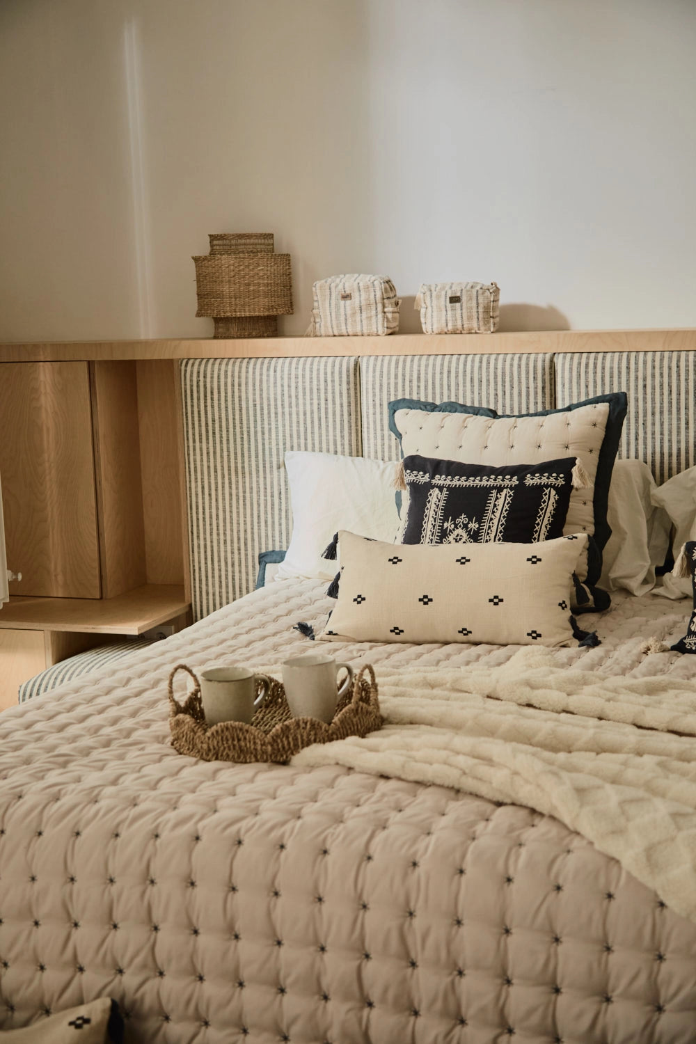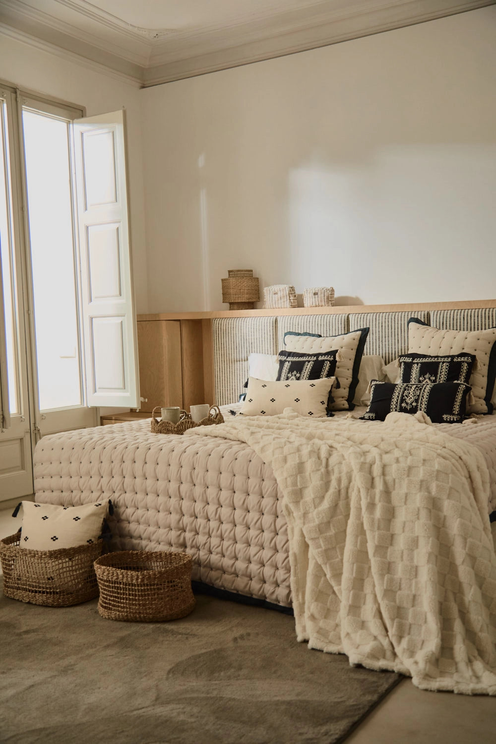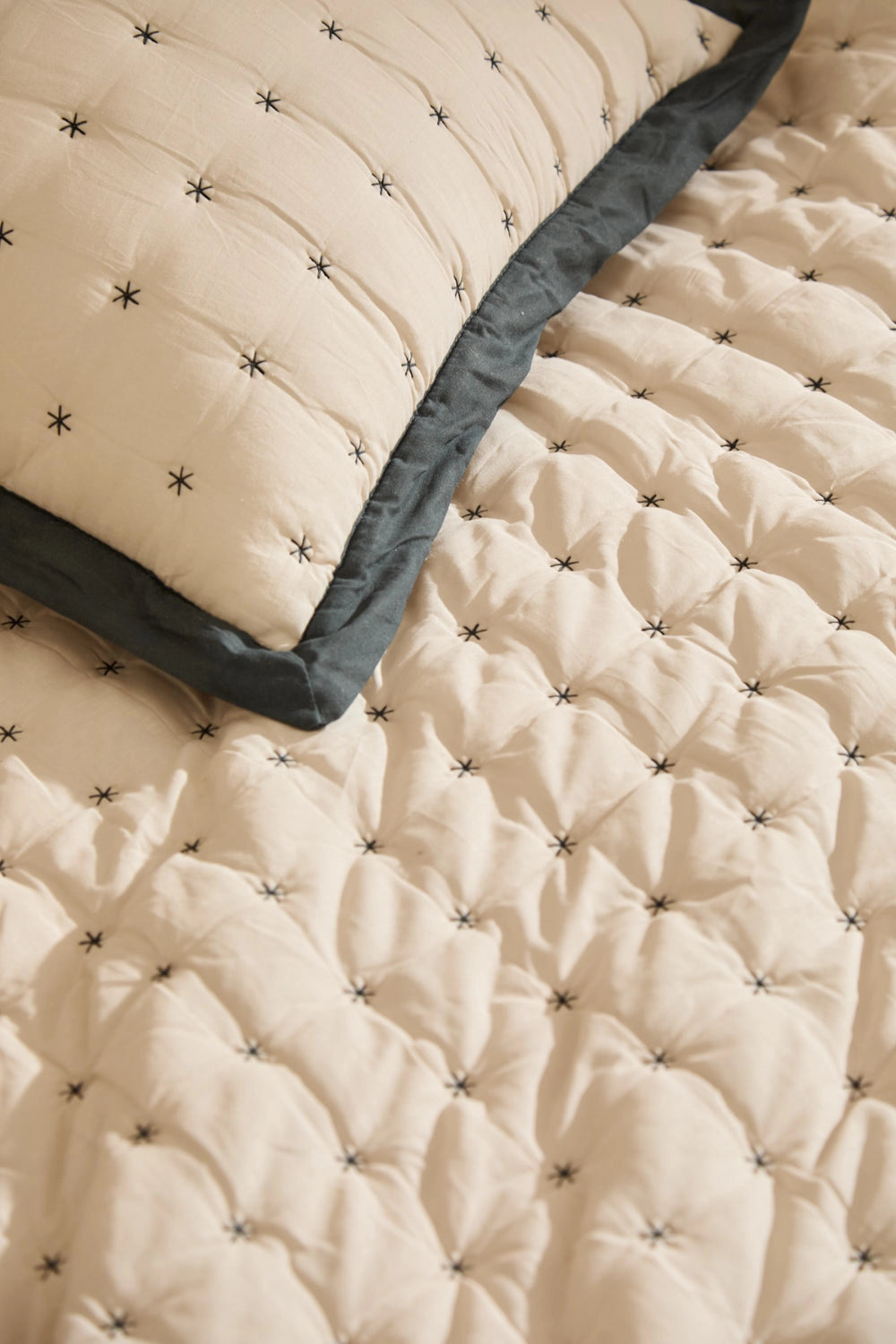 Colcha edredón acolchada en tono crudo con detalles en bordado. Ribete a contraste.