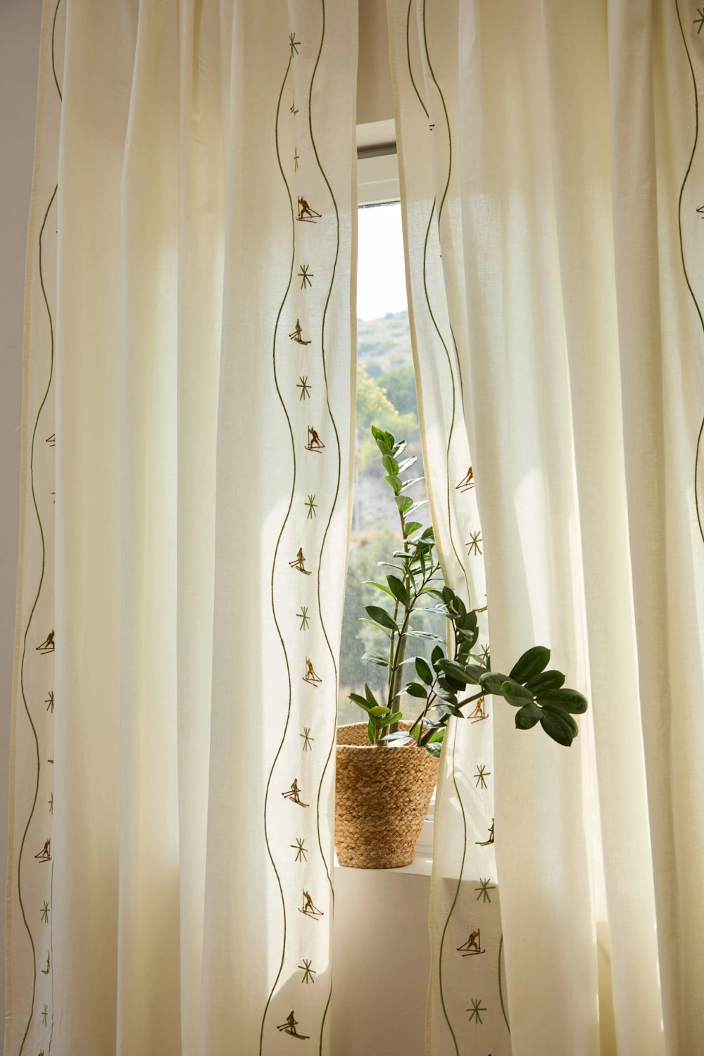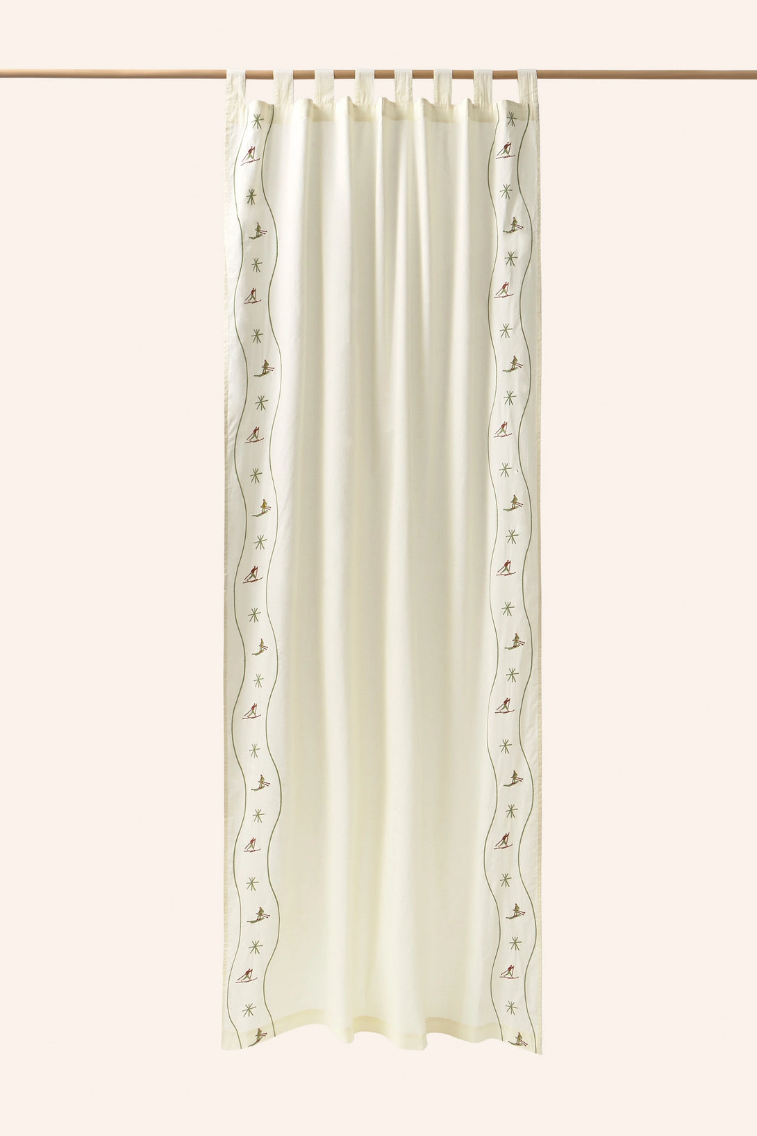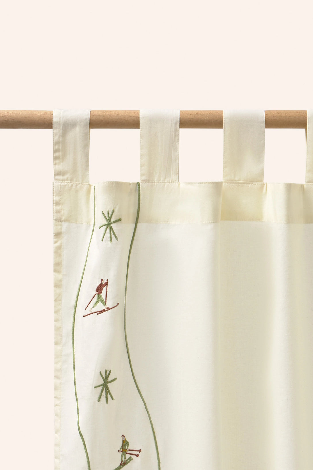 Cortina de algodón crudo semitranslúcida. Bordados con personajes esquiadores. Agarre en tablillas por la parte superior. La cortina se vende por unidad.