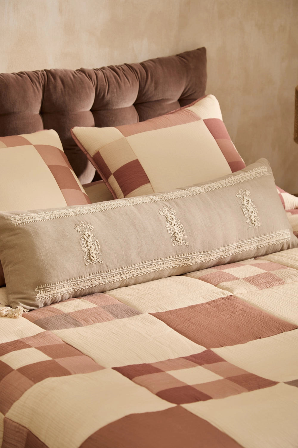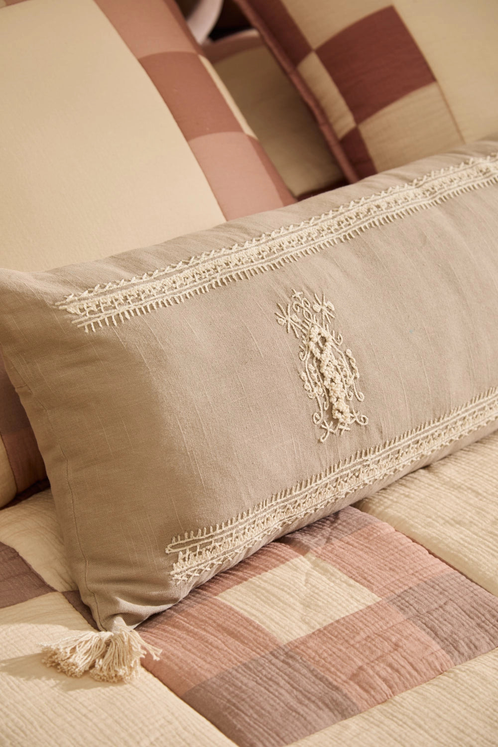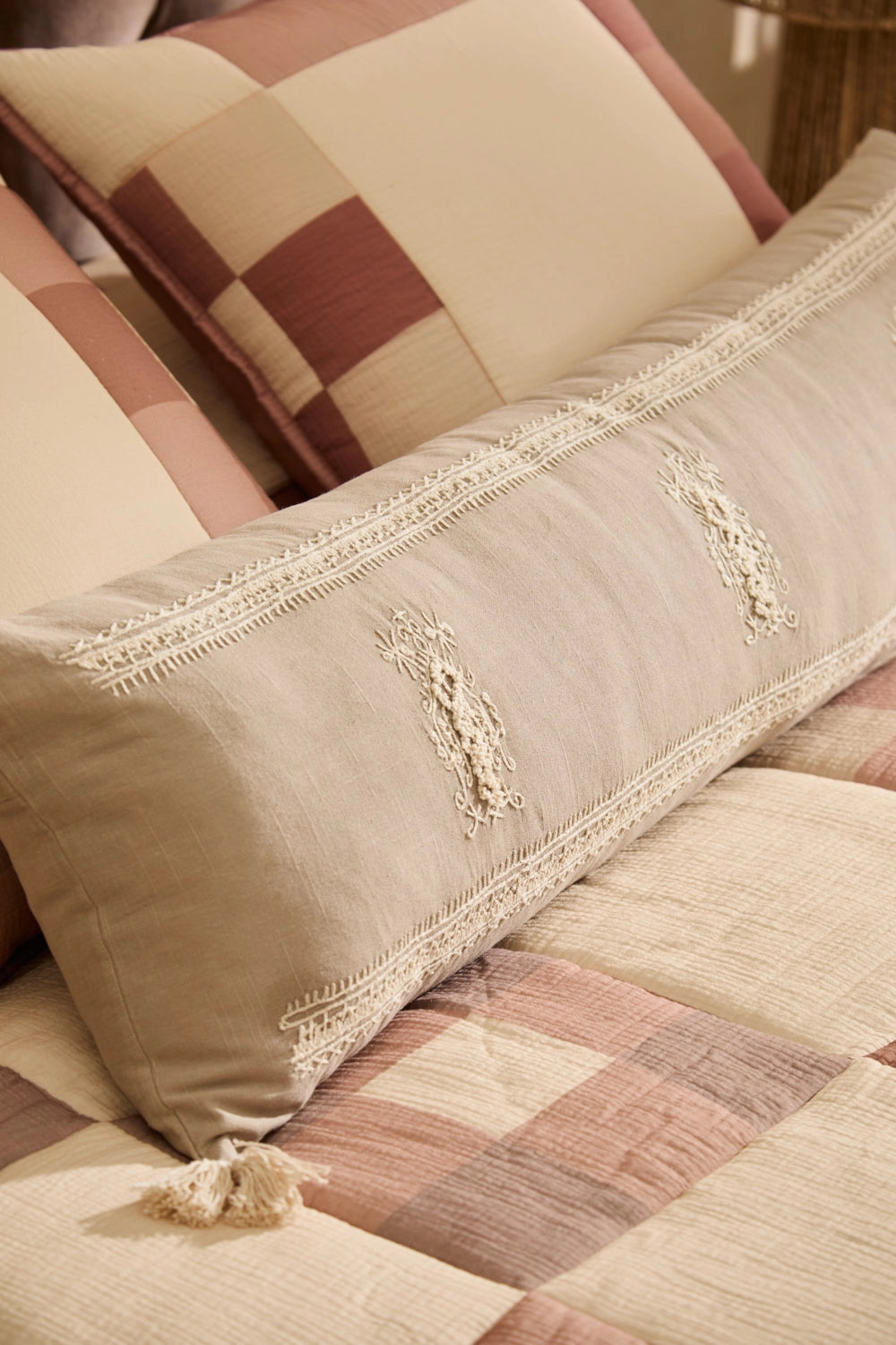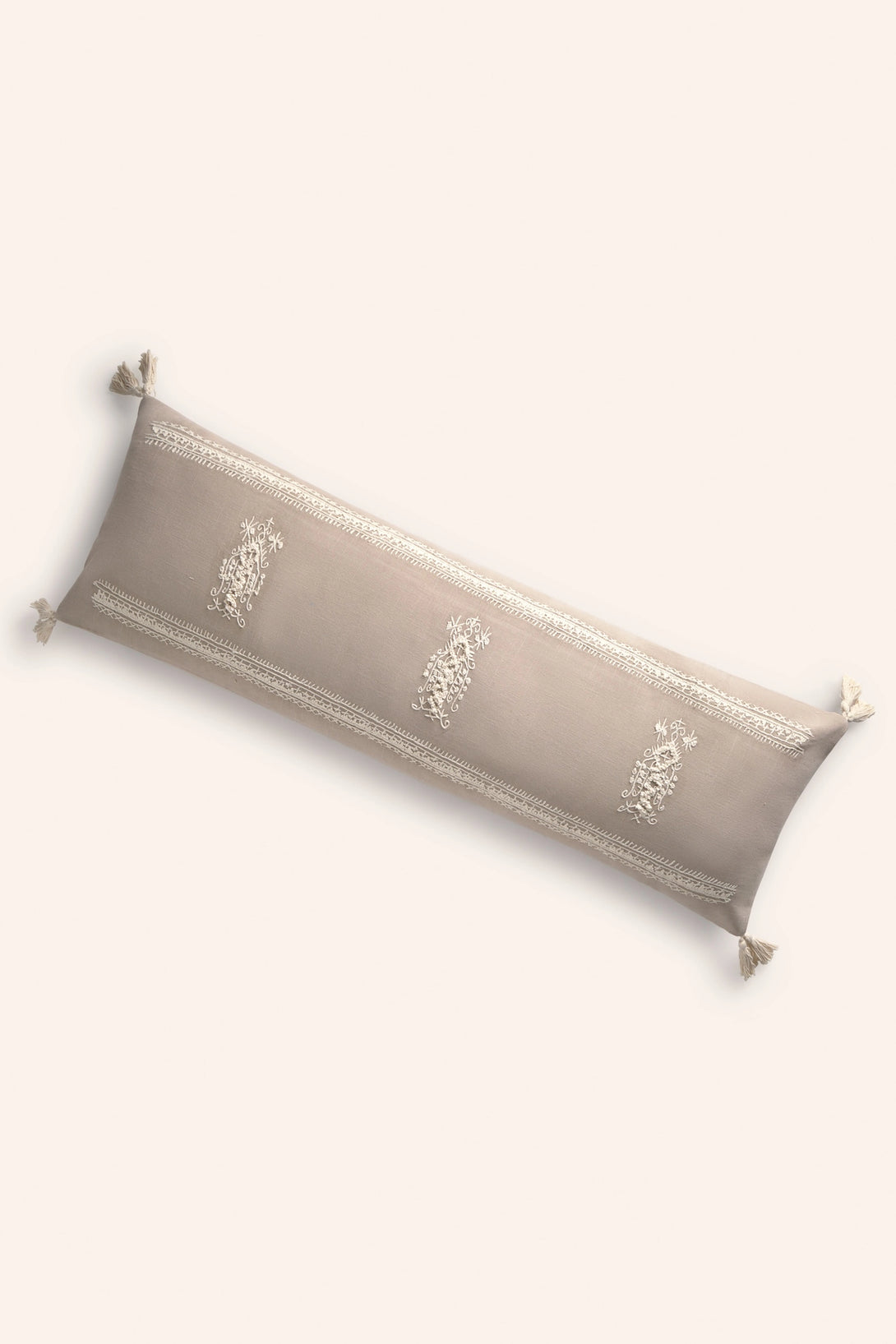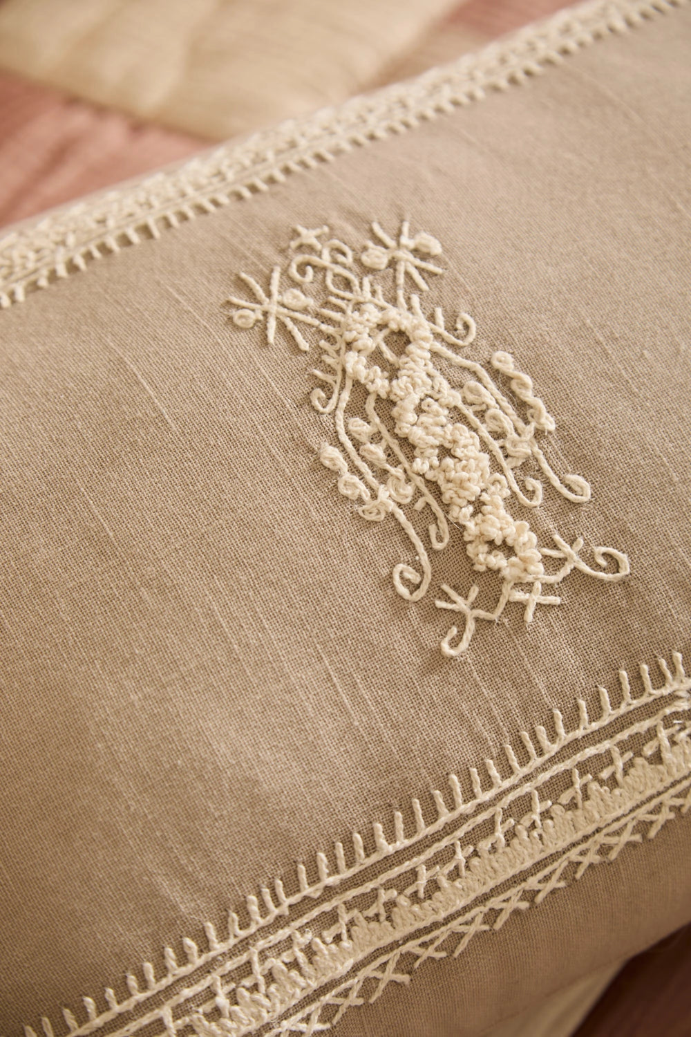 Funda de cojín alargada con bordados sobre fondo gris oscuro. Trasero del mismo tejido liso. Cierre con cremallera a mitad oculta con solapa. Acabado en pompones. Cada cojín puede presentar ligeras variaciones de color debido al proceso de teñido y a la visualización en pantalla.