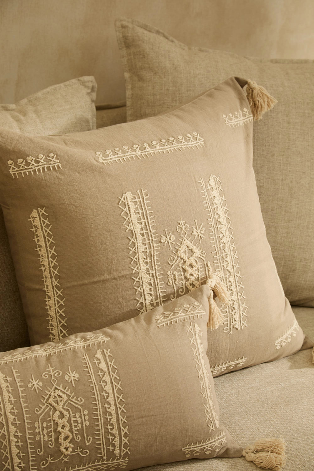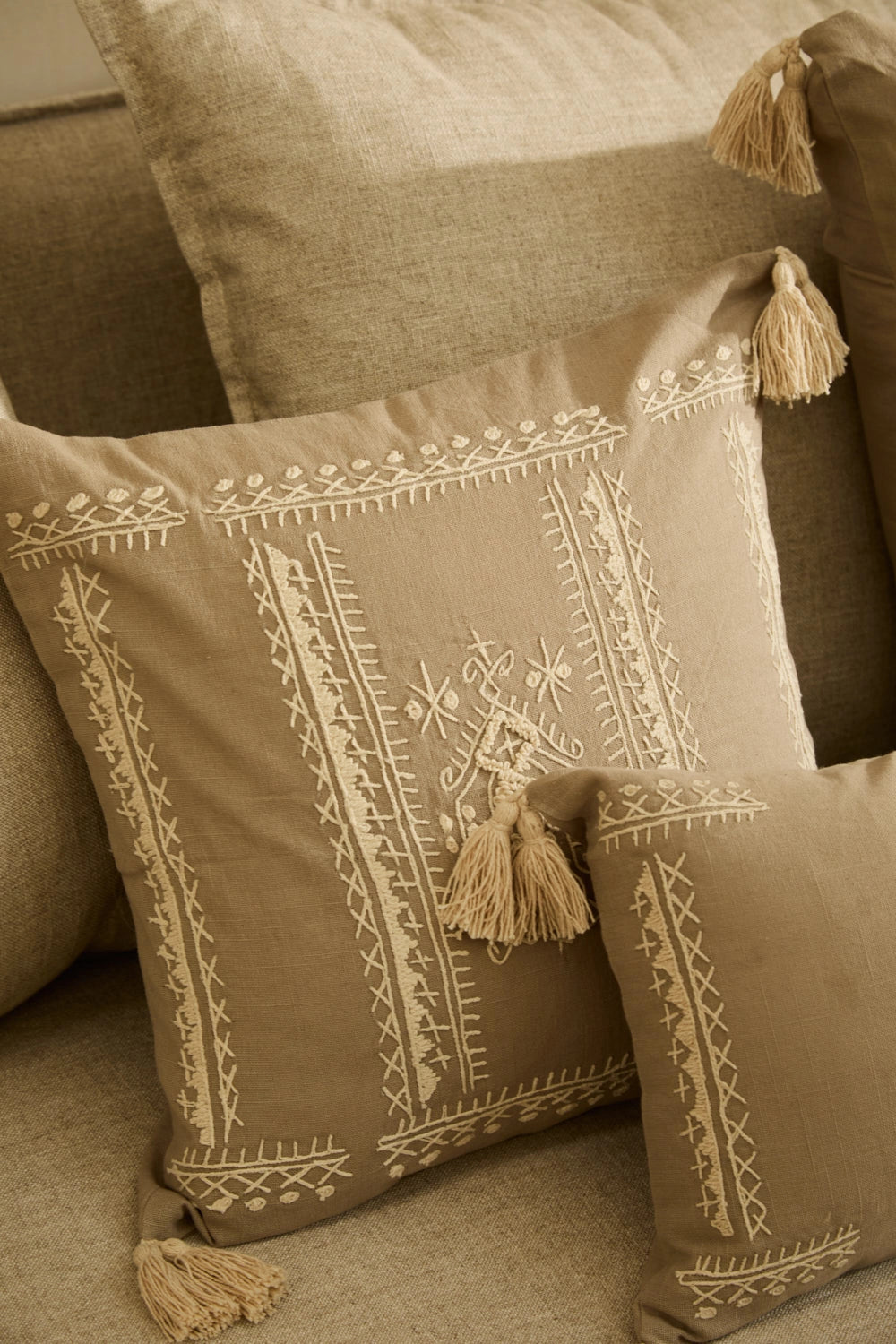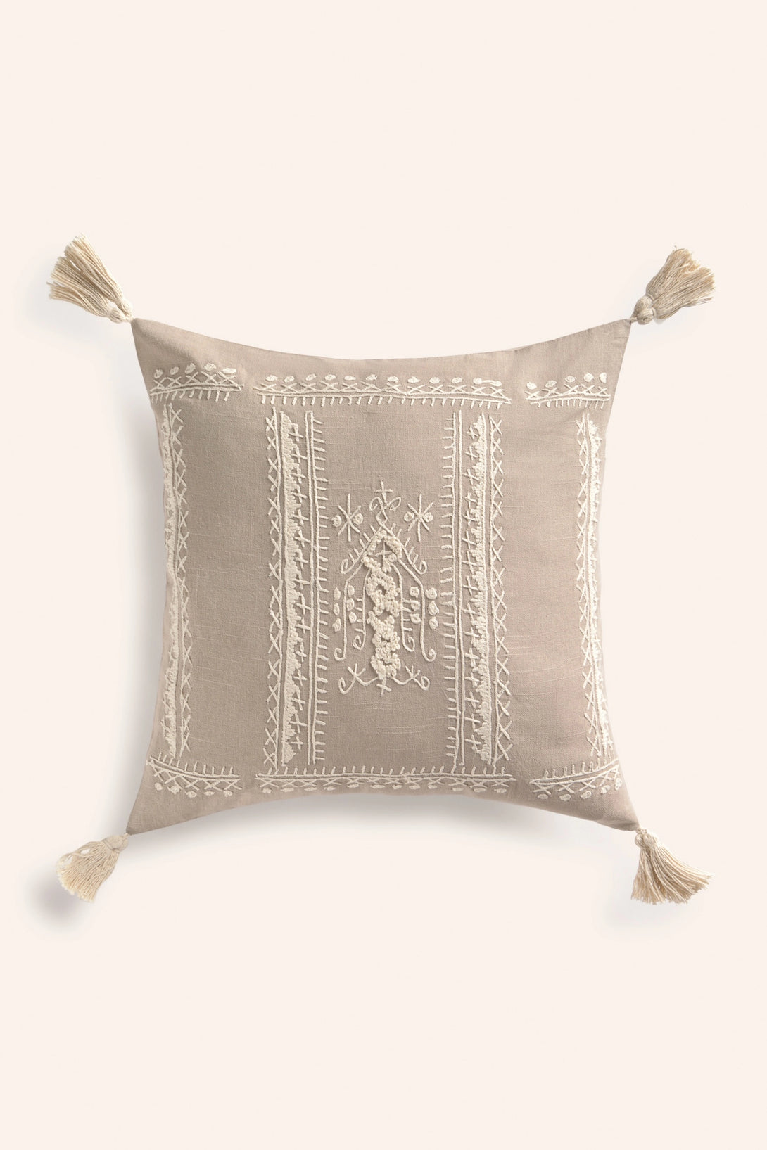 Funda de cojín cuadrada con bordados sobre fondo en tonos piedra. Trasero del mismo tejido liso. Cierre con cremallera a mitad oculta con solapa. Acabado en pompones. Cada cojín puede presentar ligeras variaciones de color debido al proceso de teñido y a la visualización en pantalla.