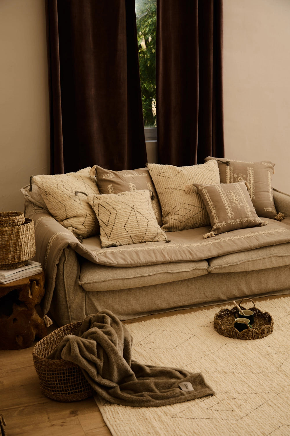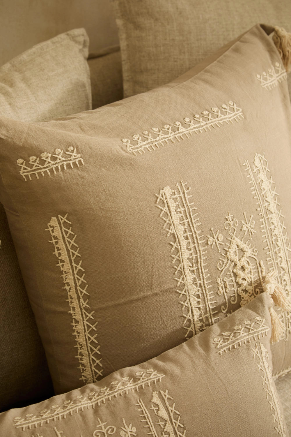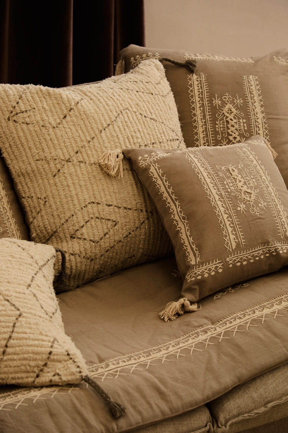 Funda de cojín cuadrada con bordados sobre fondo en tonos piedra. Trasero del mismo tejido liso. Cierre con cremallera a mitad oculta con solapa. Acabado en pompones. Cada cojín puede presentar ligeras variaciones de color debido al proceso de teñido y a la visualización en pantalla.