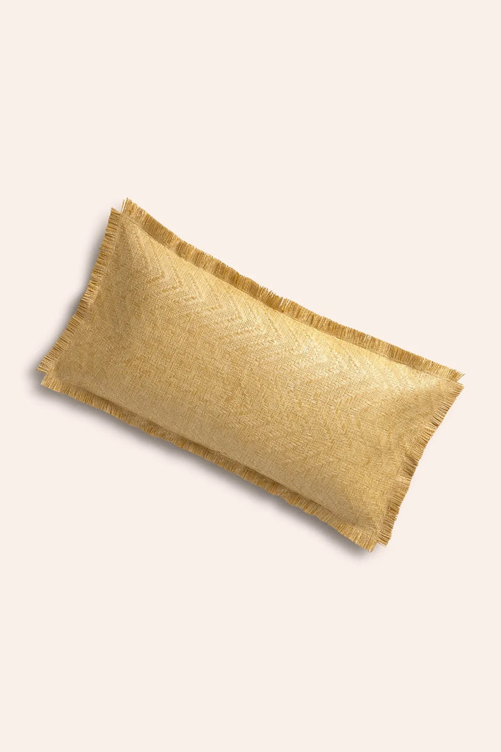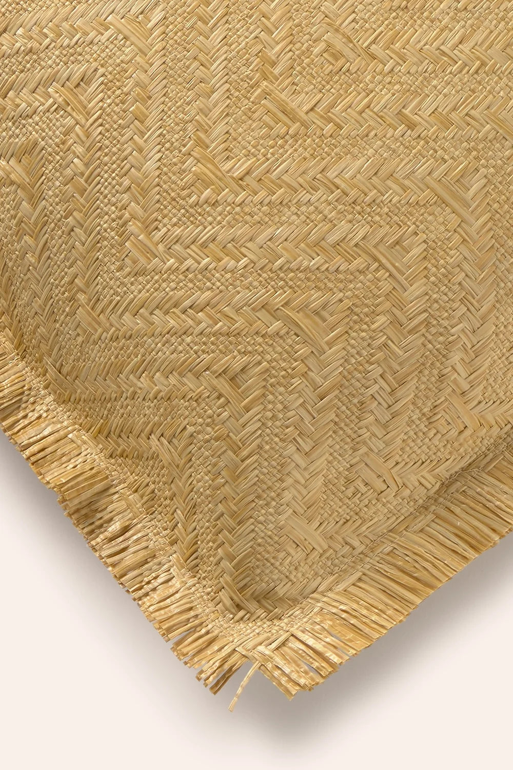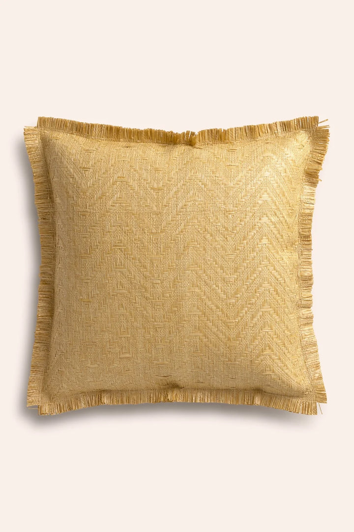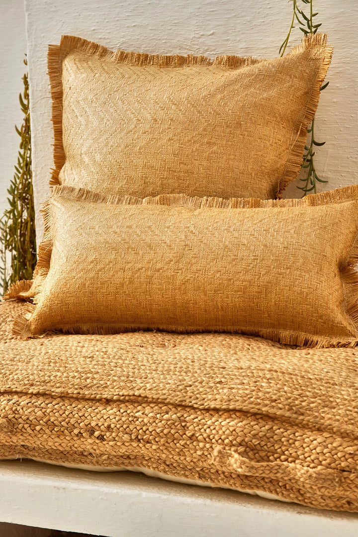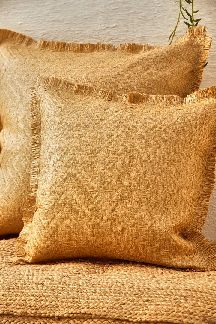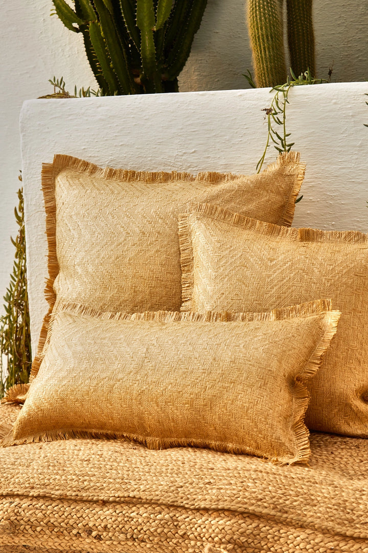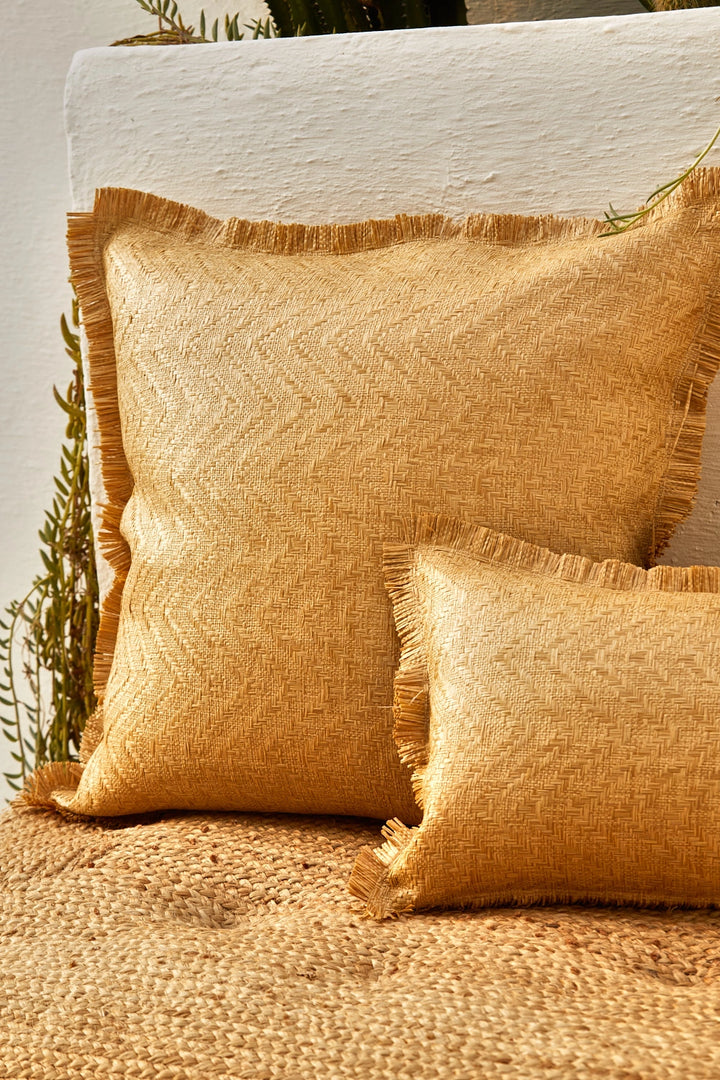 Funda de cojín para exterior trenzada y con acabado en flecos. Cremallera oculta a media altura con solapa. Resistente al agua.