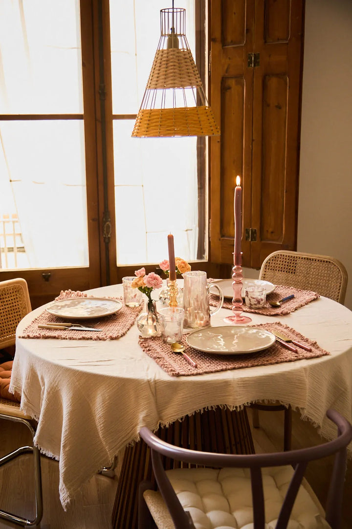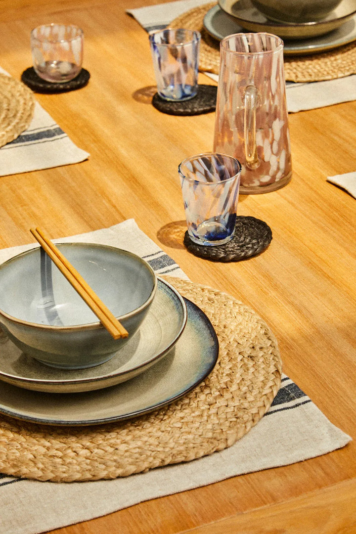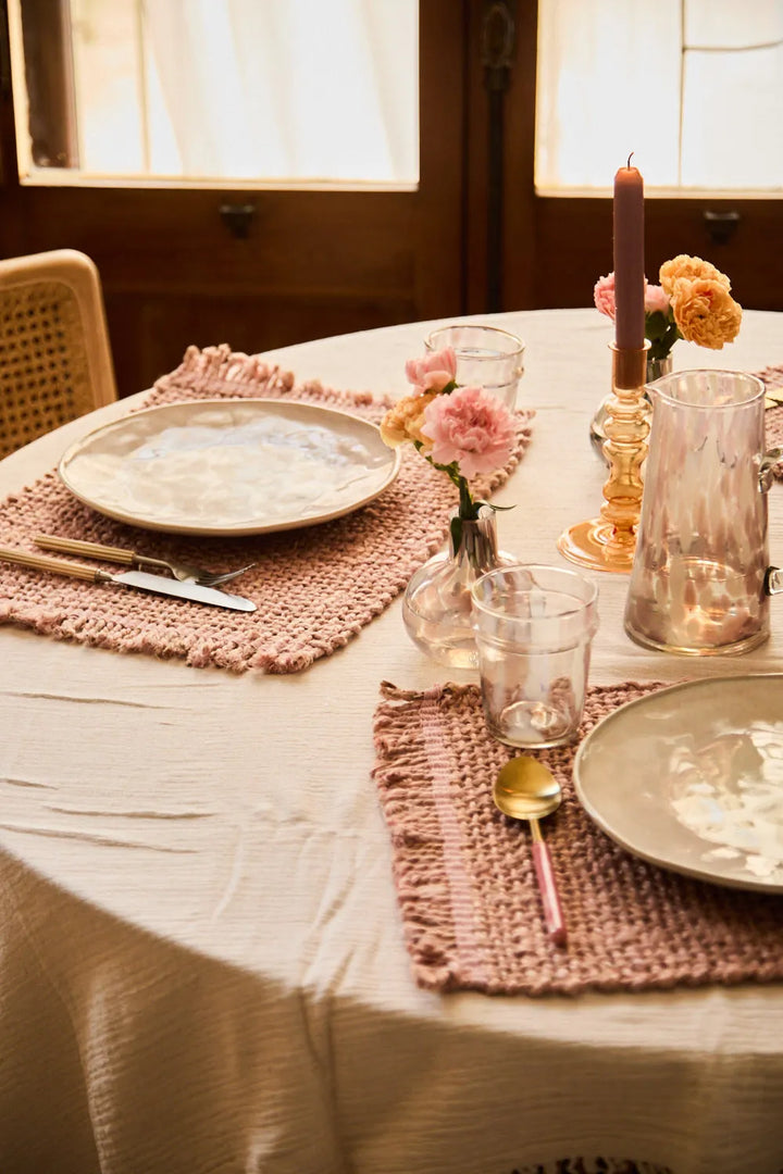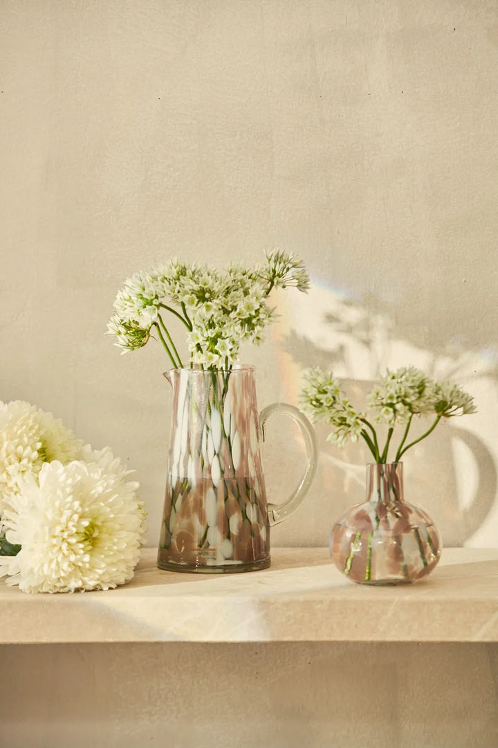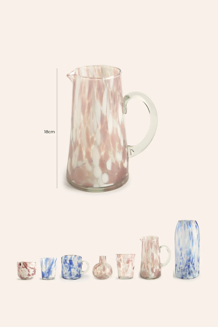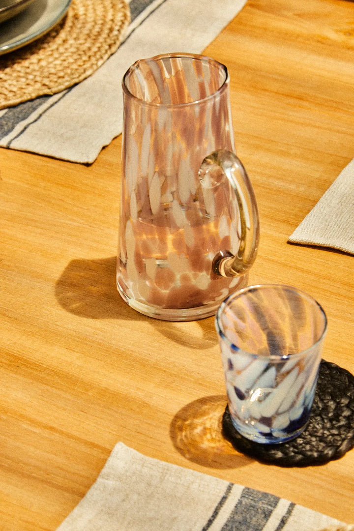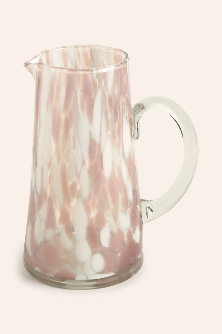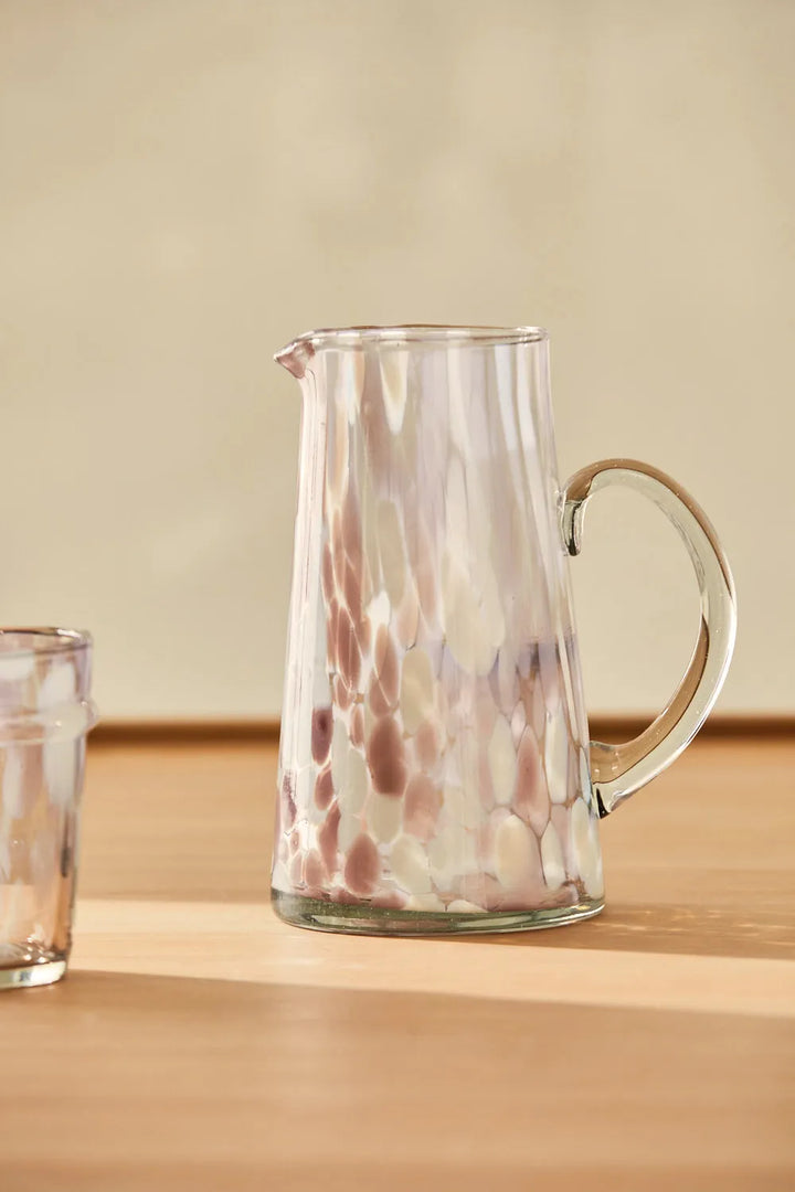 Añade un toque de sofisticación y singularidad a tu mesa con la jarra de cristal Beira, adornada con fritas de color rosa.
