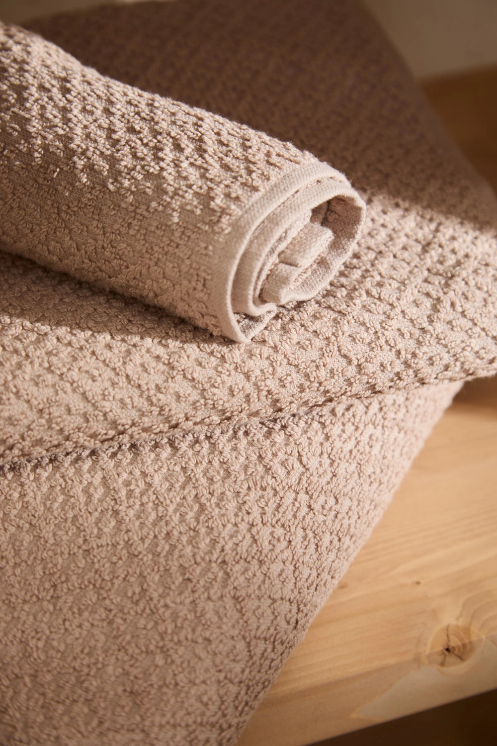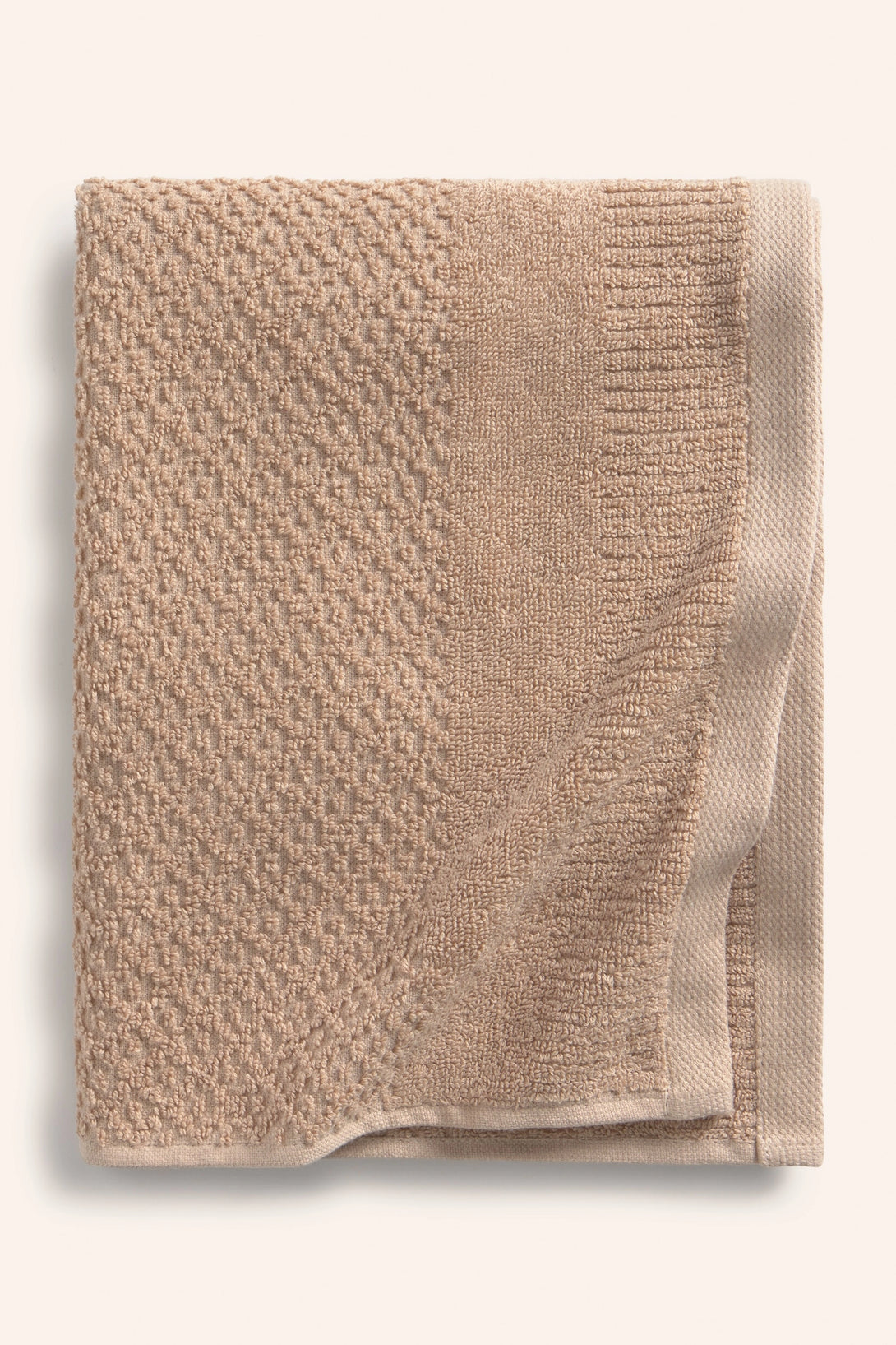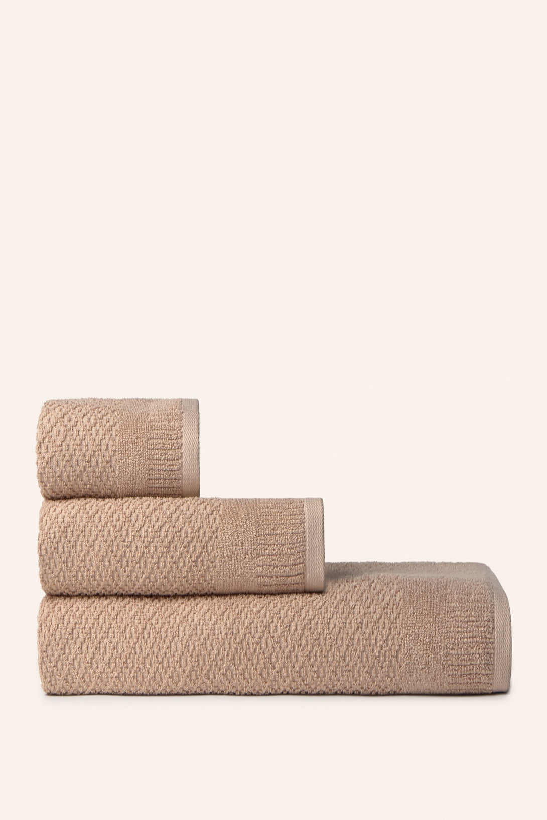 Toalla de baño de 500 gramos de algodón de rizo tejido en jacquard en tono piedra.