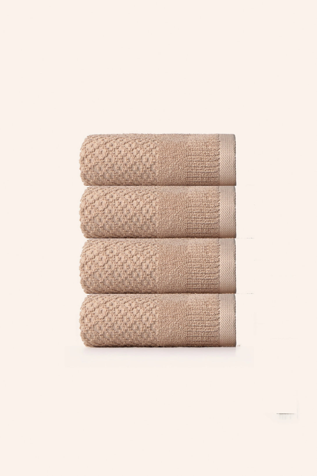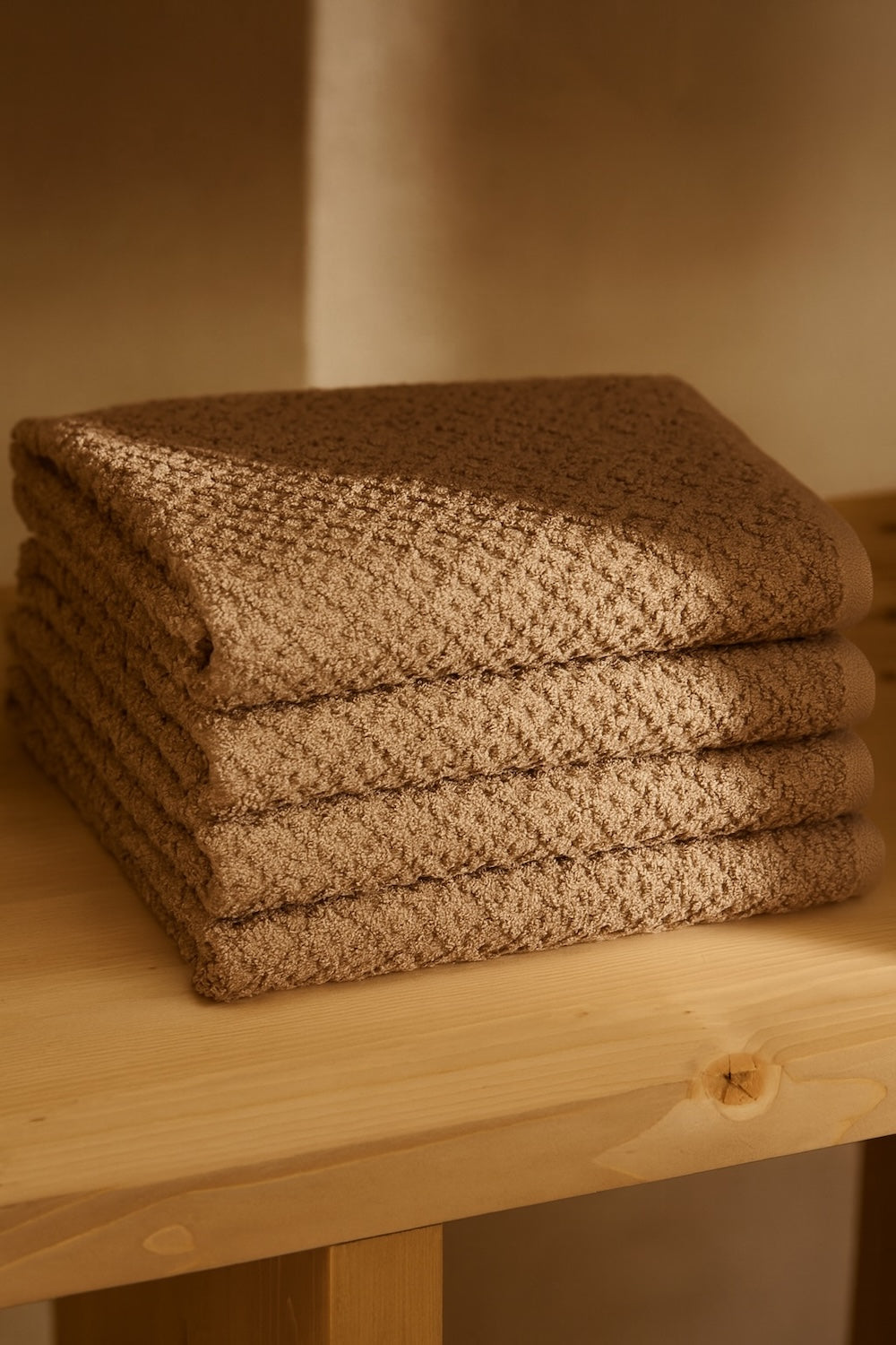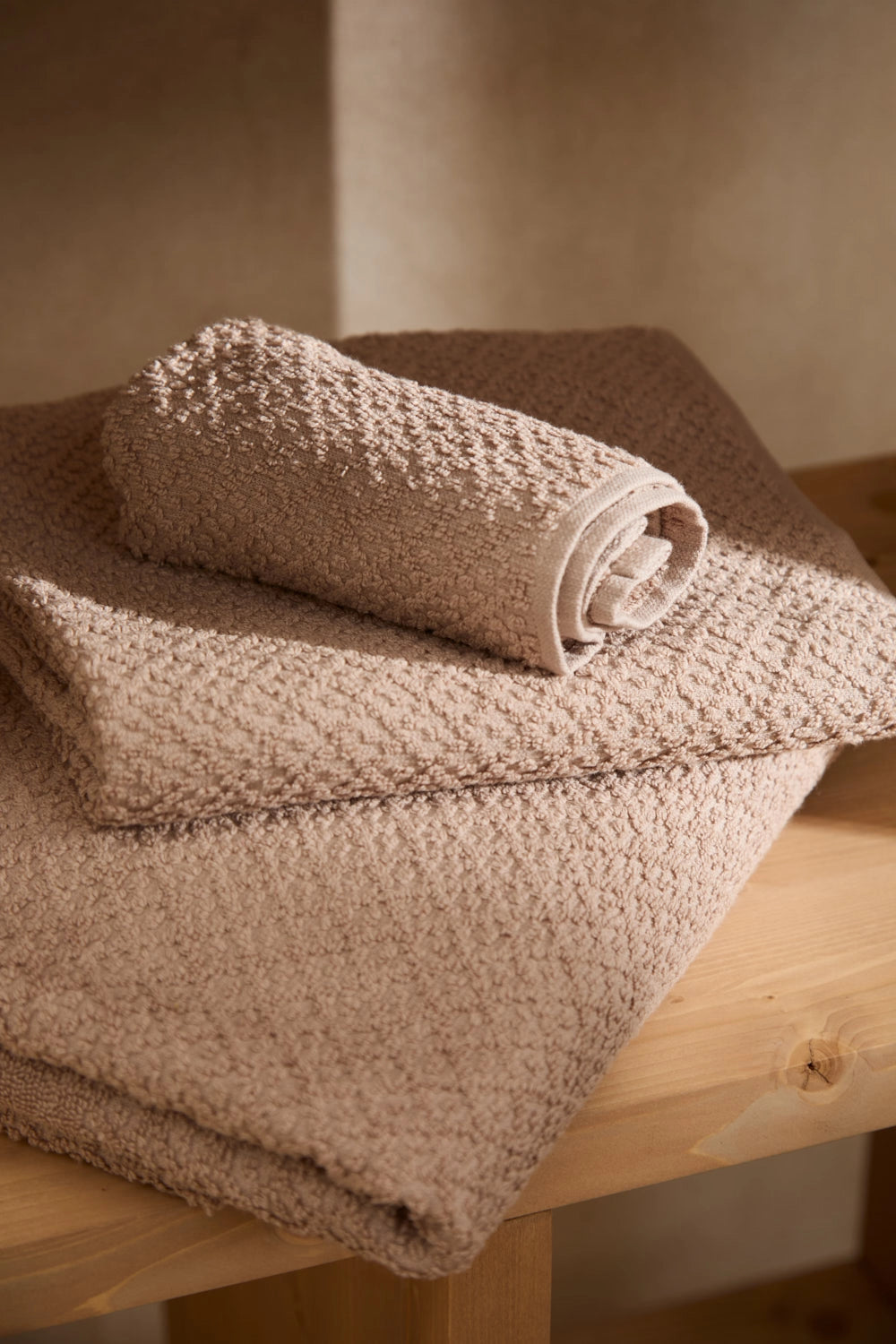 Toalla de baño de 500 gramos de algodón de rizo tejido en jacquard en tono piedra.